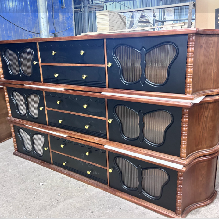 This Traditional French TV stand features a refined ash wood and glass construction with a distinctive butterfly-inspired rounded rectangular silhouette, available in black and vintage finishes to complement both classic and transitional interiors. Built with large-capacity drawers, heavy-duty metal glides, and a stable load-bearing frame, this versatile media console storage cabinet is ideal for organizing electronics, décor, and daily essentials while elevating your living room with timeless elegance.