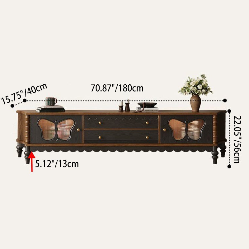 Traditional French Ash Wood Glass Butterfly Rounded Rectangular TV Stand 2-Drawer For Living Room