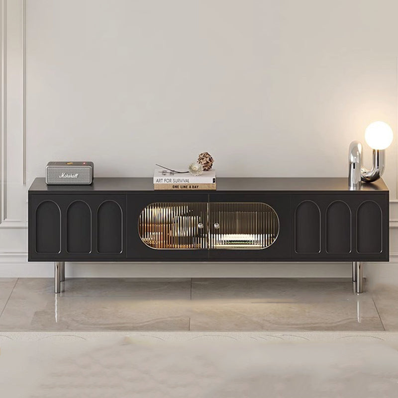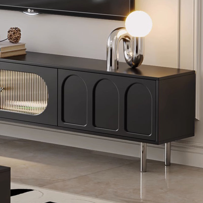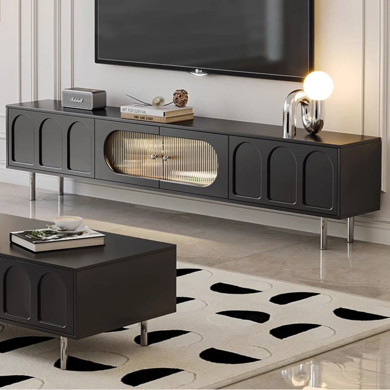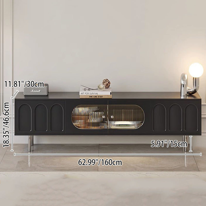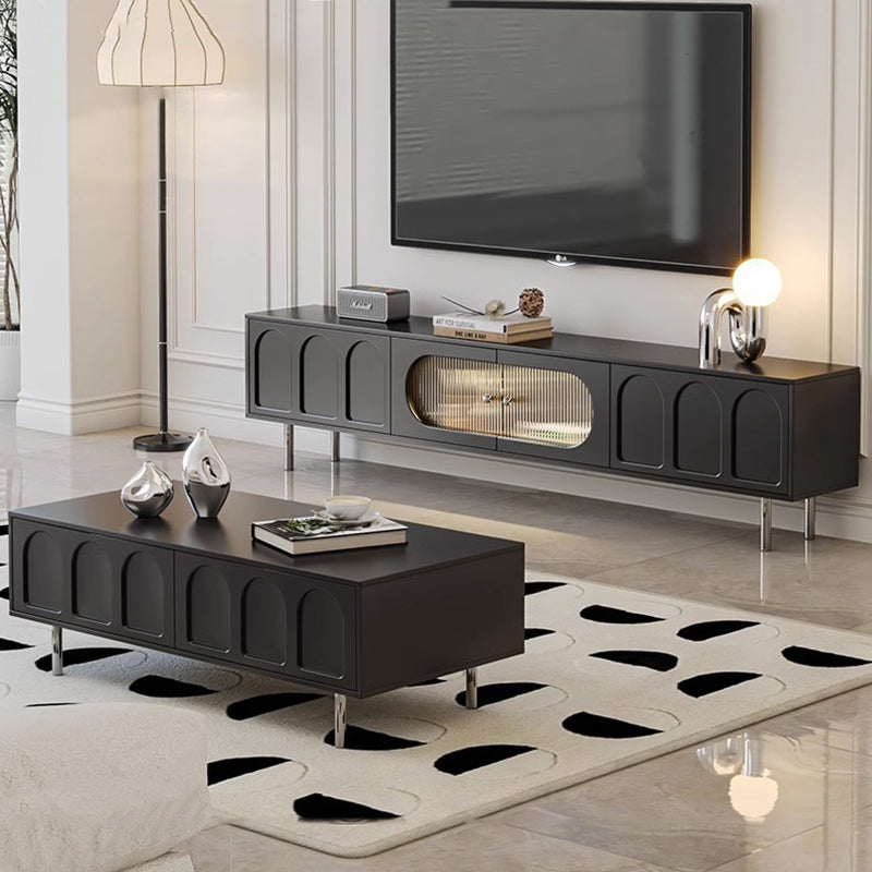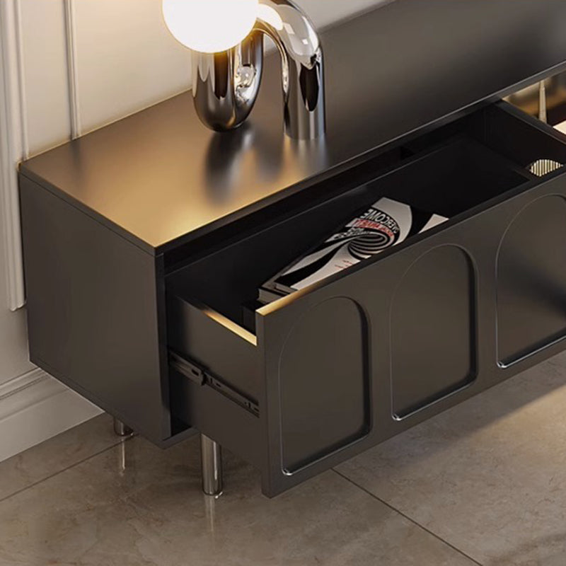 This Traditional French TV stand features an engineered wood body with stainless steel and glass accents, combining cylindrical details, rectangular structure, and elegant arch elements for a refined black finish. Designed with 2 drawers and a built-in cable management hole, it offers clean organization and a user-friendly layout, making it an ideal living room TV cabinet for modern apartments and small spaces.