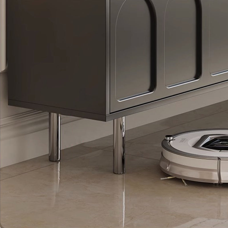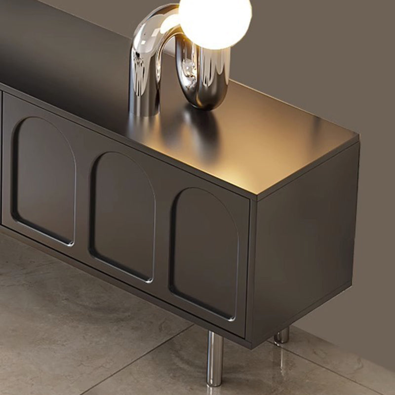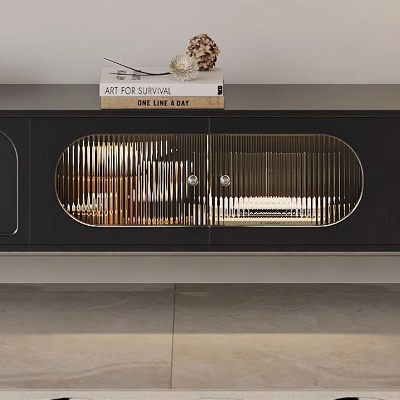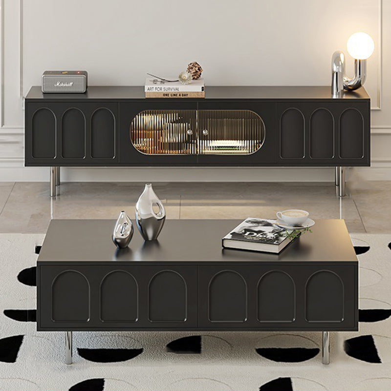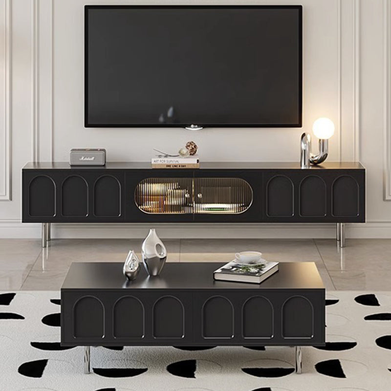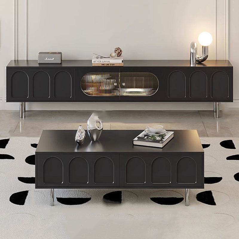 This Traditional French TV stand features an engineered wood body with stainless steel and glass accents, combining cylindrical details, rectangular structure, and elegant arch elements for a refined black finish. Designed with 2 drawers and a built-in cable management hole, it offers clean organization and a user-friendly layout, making it an ideal living room TV cabinet for modern apartments and small spaces.