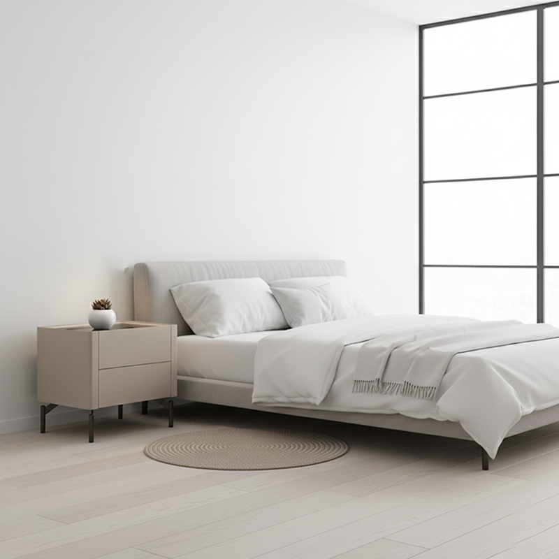 This nightstand with modern minimalist style is a "light" textured highlight in the bedroom. Crafted from E1 eco-friendly MDF, the cabinet is sturdy, high-quality, pollution-free & formaldehyde-free, balancing health and durability. The single large-capacity drawer glides smoothly without jamming, easily storing bedtime personal items. Supported by a bottom stainless steel frame, it boasts load-bearing capacity while exuding a cool-toned texture. The glass tabletop is transparent and sleek --- it not only amplifies the minimalist light luxury vibe but also lets daily stains be wiped clean instantly, blending the neatness and comfort of modern minimalism into daily bedroom life.