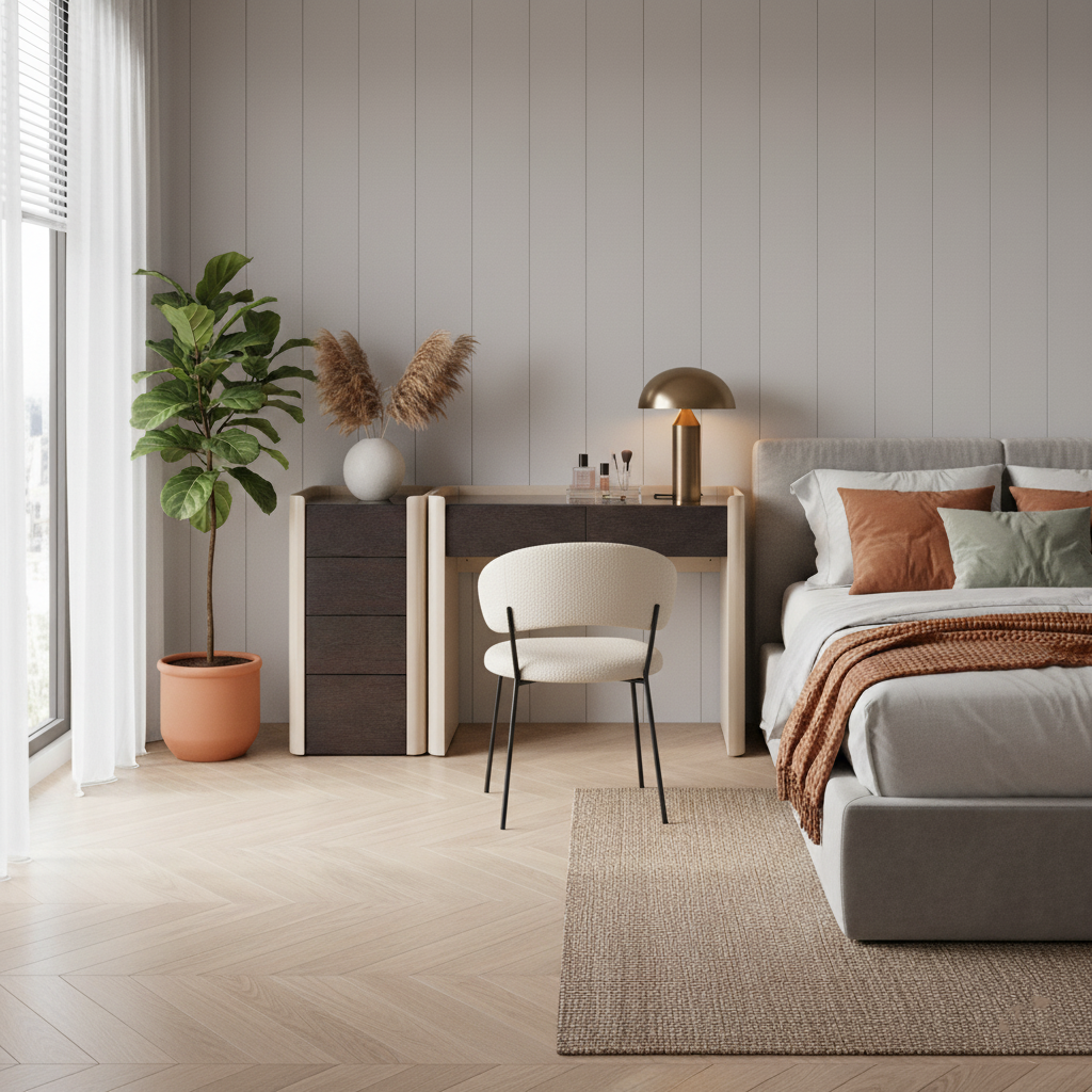 The cabinet features smooth-gliding drawer rails, built-in recessed handles, and a full-bottom landing base that keeps dust from accumulating underneath. Its clean silhouette and versatile proportions also make it easy to pair with a matching dressing table, creating a cohesive and functional home setup.