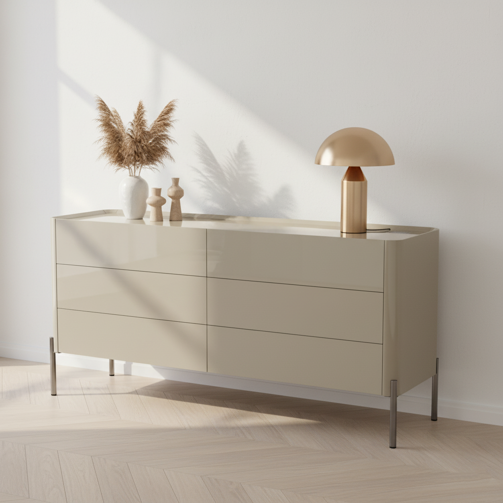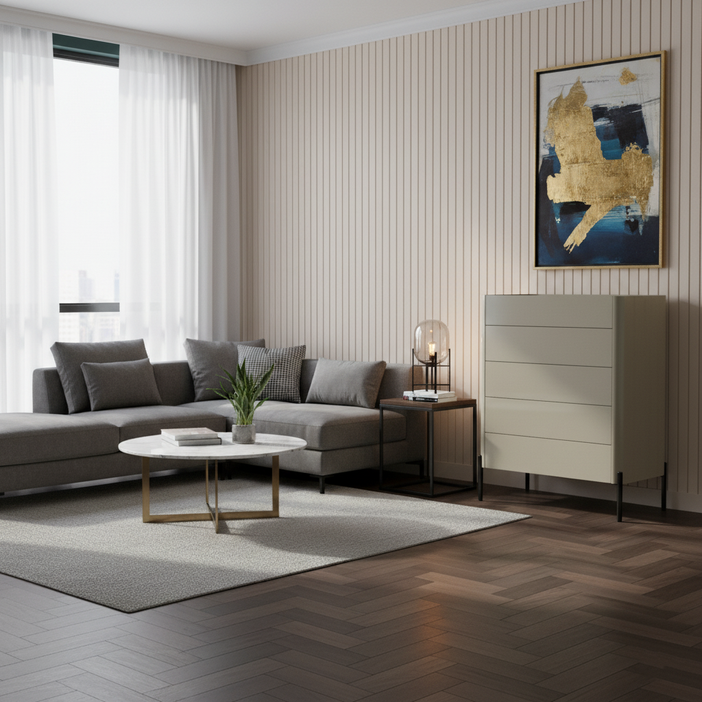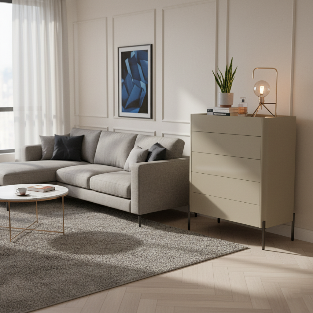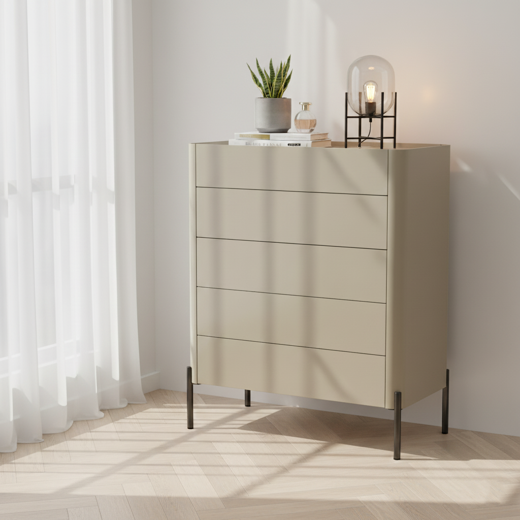 With 5 or 6 fully enclosed drawers, smooth-slide rails, and hidden handles, it keeps your items neatly stored and dust-free—perfect for clothing, accessories, remote controls, documents, or living room essentials. The rectangular top shelf comes with a raised edge to securely display décor, candles, books, or daily items without slipping.