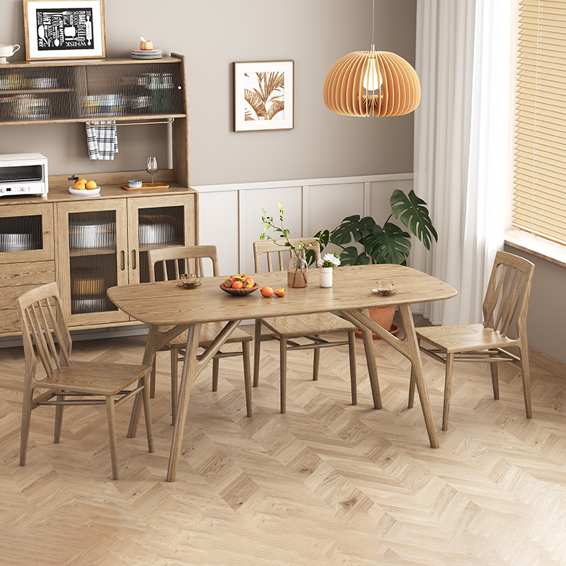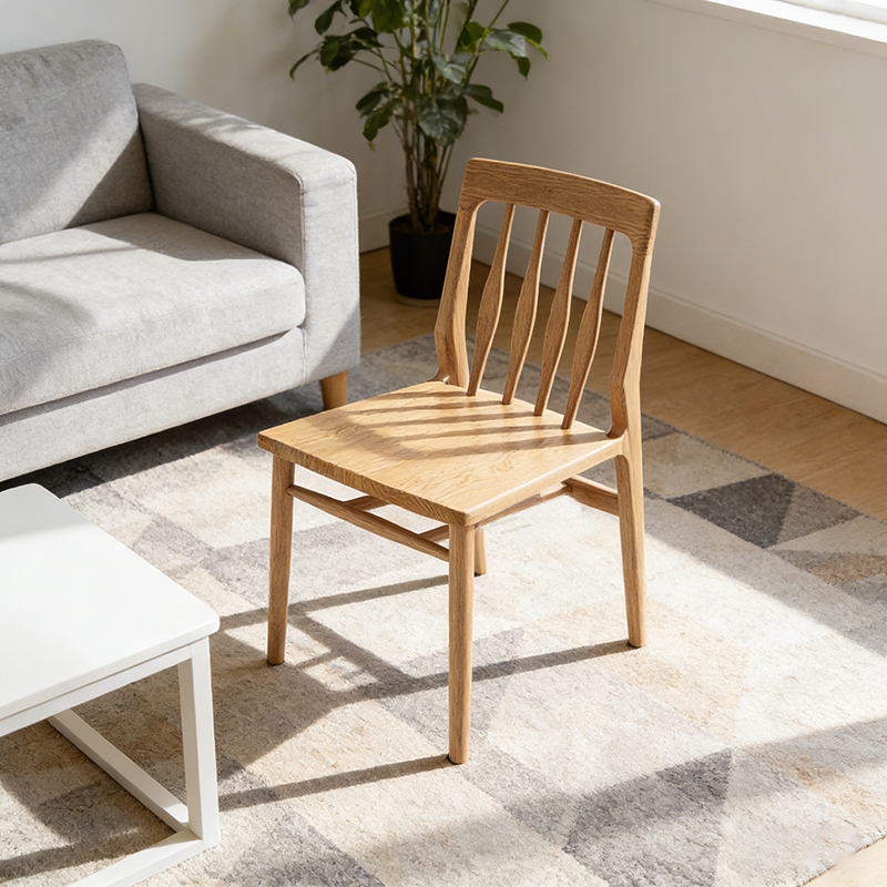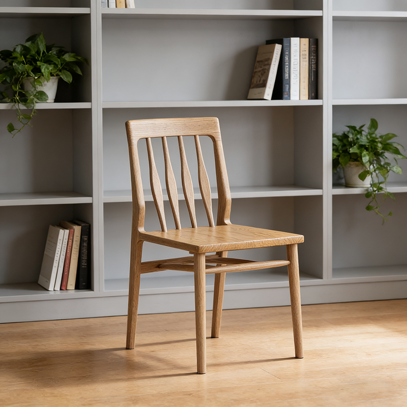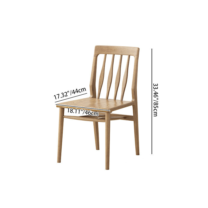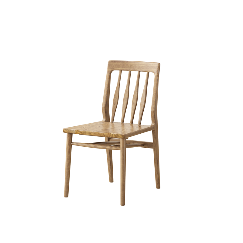Crafted from imported North American ash wood, this dining chair features a clean, lightweight silhouette that highlights the wood’s natural grain and refined texture. The backrest is composed of multi-slat vertical spindles that gently narrow toward the bottom, creating a supportive curve that naturally follows the body’s posture-both visually rhythmic and ergonomically comfortable.
