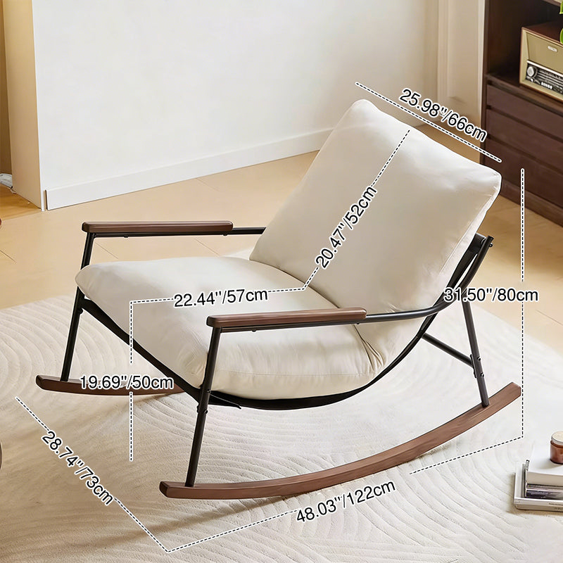 This Contemporary Scandinavian rocking chair features a soft corduroy seat with a sturdy metal and solid wood frame, designed in a smooth curved square silhouette. It offers gentle back-and-forth motion, thick integrated cushioning, and a quick-rebound backrest for ultimate comfort. Available in ivory white and forest green, it adds elegance and relaxation to any living room or balcony space.