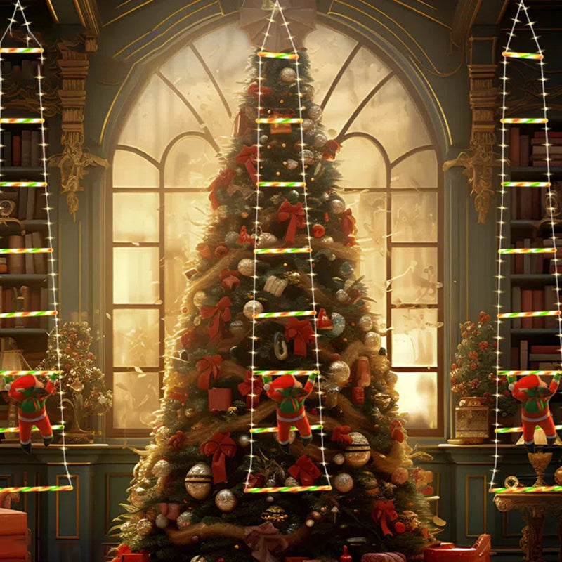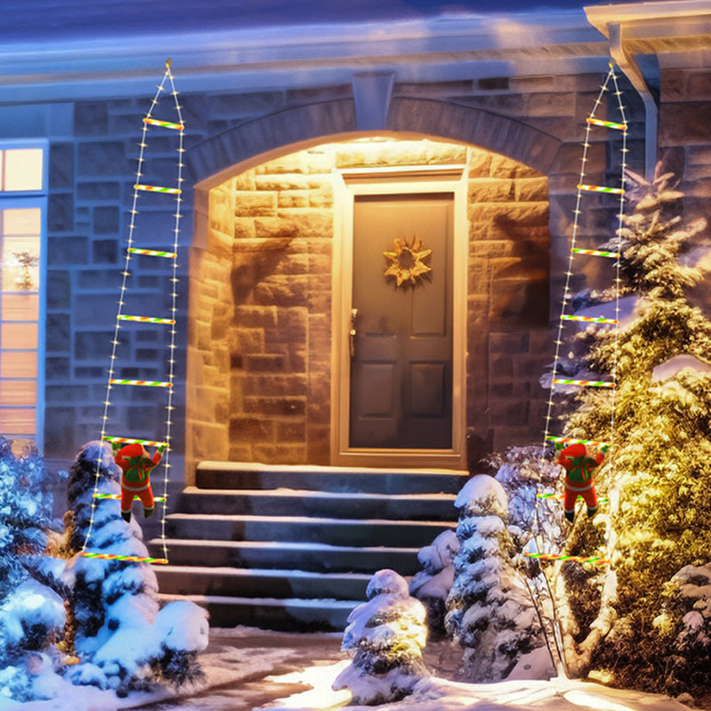 This red Santa Claus ladder-shaped LED string light adds festive charm to your outdoor Christmas décor. Made of durable PVC and cotton, it features long-lasting bulbs with eight flashing modes, USB plug-in power options, and flexible wiring that resists aging—perfect for creating a joyful holiday atmosphere on balconies, porches, or gardens.