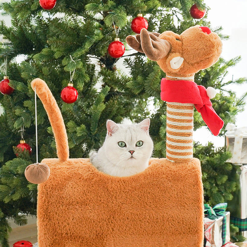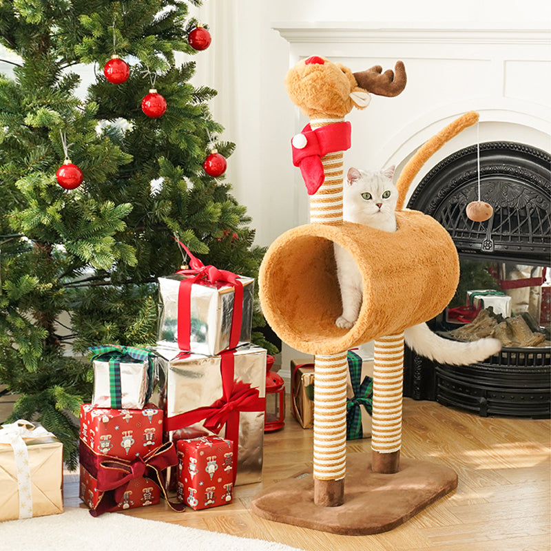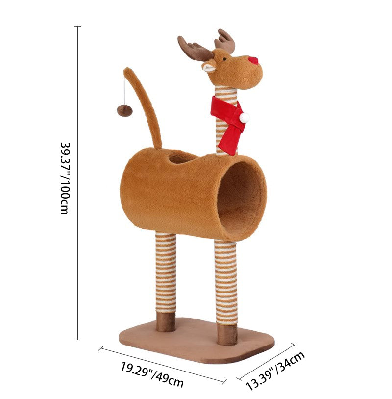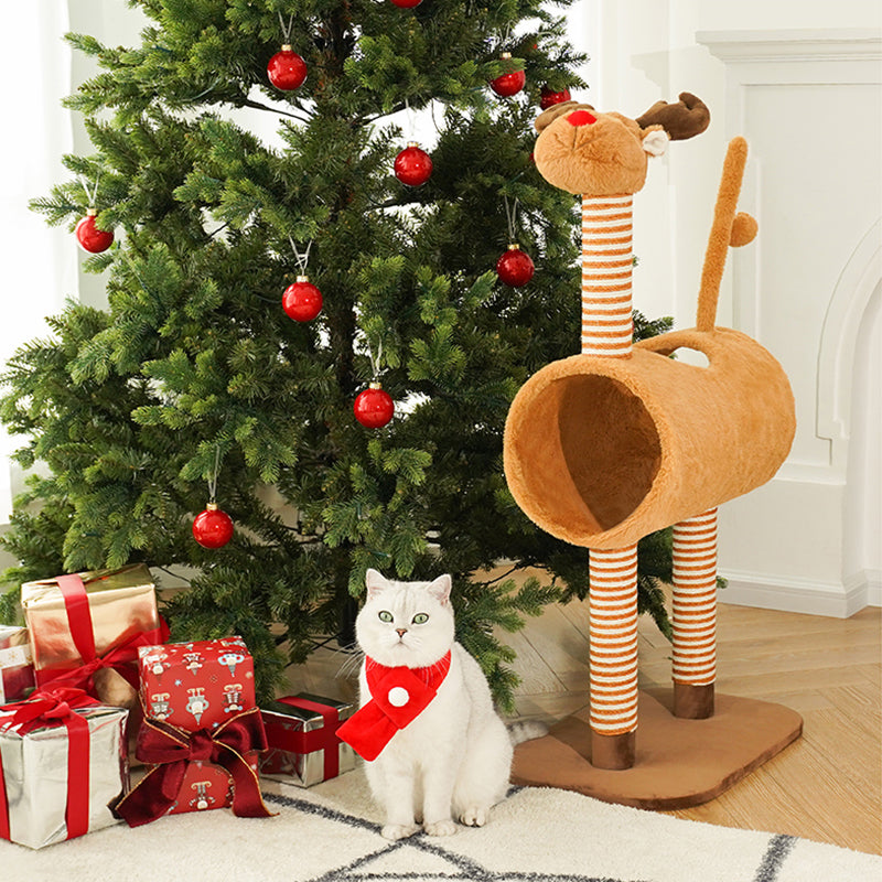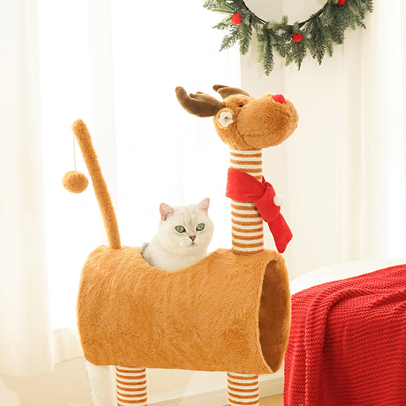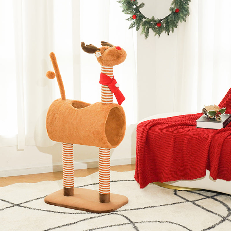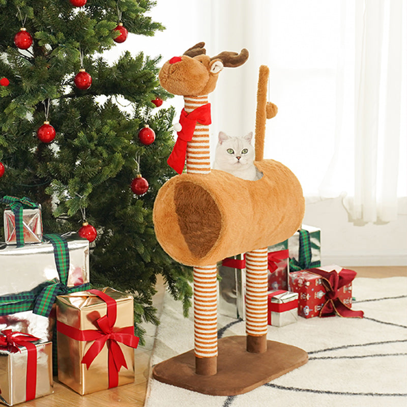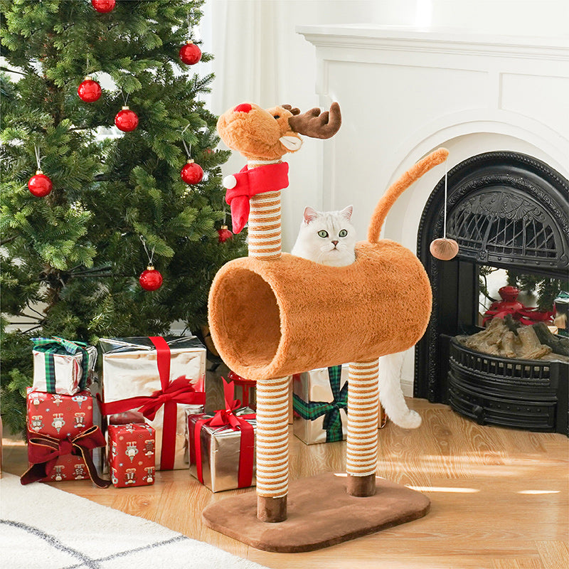 Bring a touch of cozy, festive charm to your pet's space with this contemporary reindeer-themed cat tree. The unique, whimsical design features a highly functional cylindrical tunnel bed, offering your cat a warm, secure hideaway perfect for napping. The entire structure is built for stability, anchored by a reinforced base that ensures it remains secure during active play and scratching.