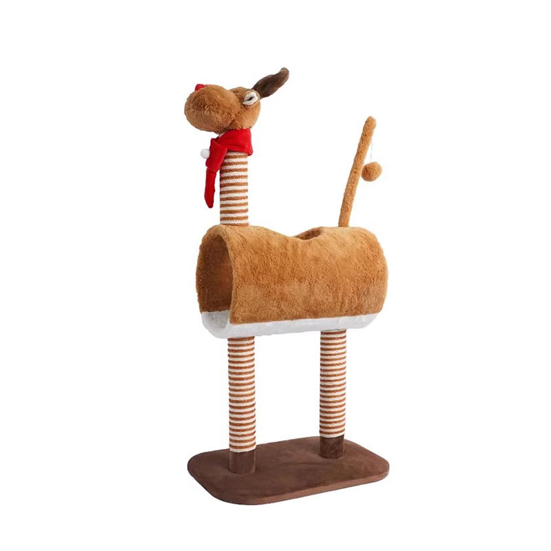 Contemporary Creative Cylindrical Reindeer-Shaped Faux Panel Paper Tube Sisal Velvet Fabric Christmas Cat Tree For Living Room