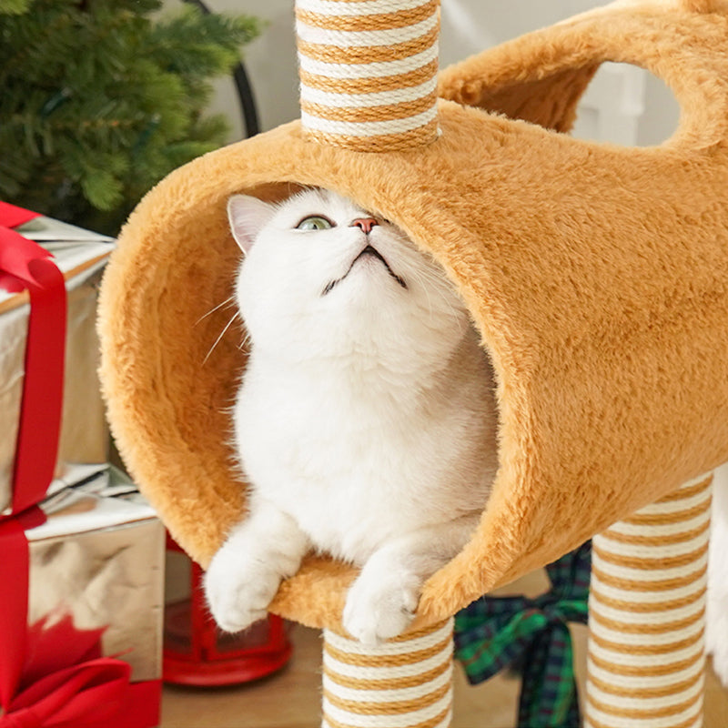 This compact tower is the ideal winter-ready cat house and scratching solution for apartments and small spaces, featuring a durable, texture-rich rope-wrapped scratch post to satisfy natural instincts and keep claws healthy. The serene light brown color allows this cozy habitat to blend seamlessly into any living room or bedroom décor. Optimized for North American consumers searching for reindeer cat trees, cylindrical tunnel cat beds, compact rope scratch posts, and light brown winter pet furniture for contemporary homes.