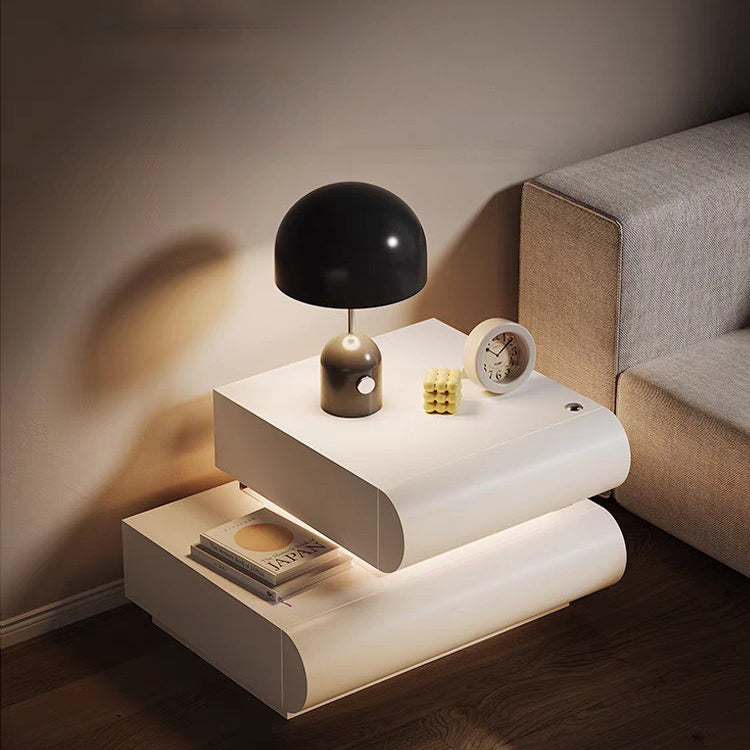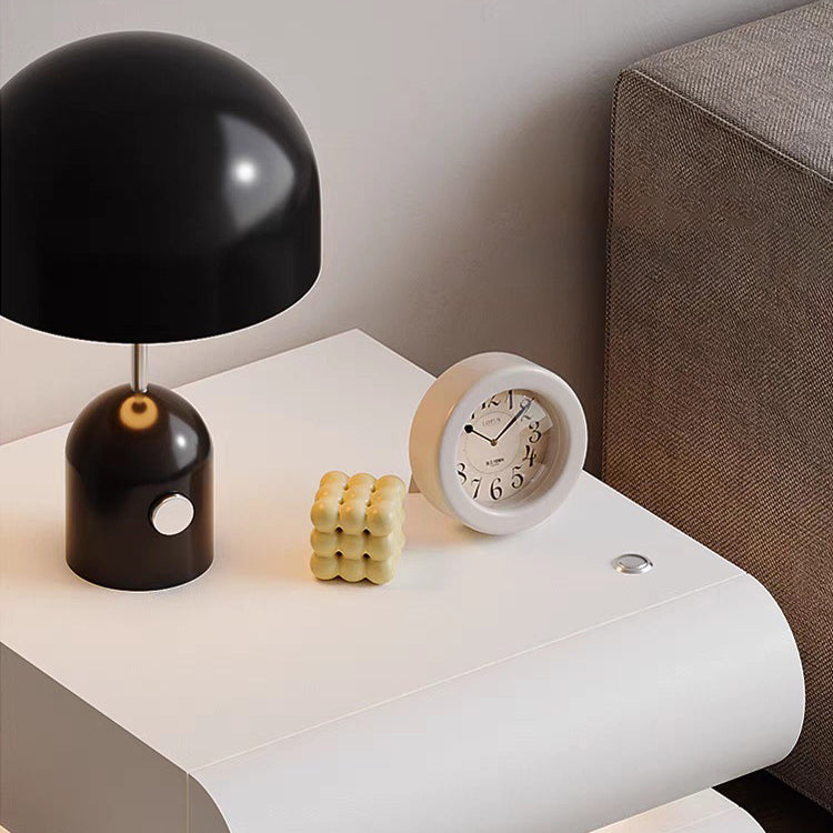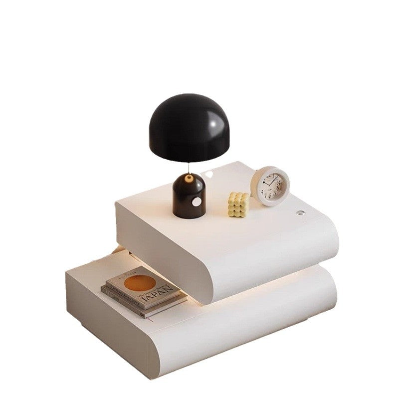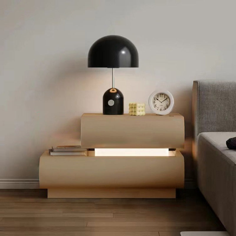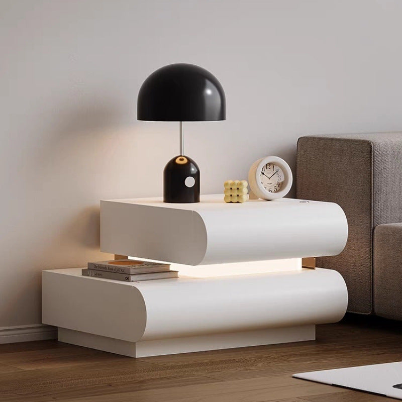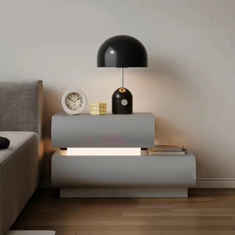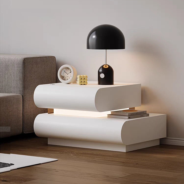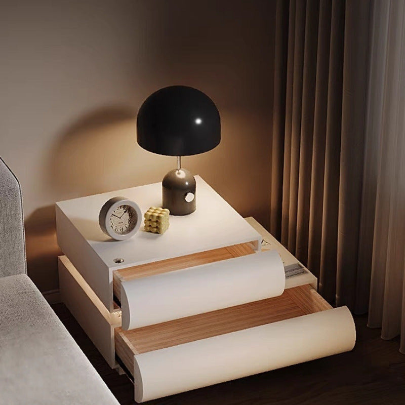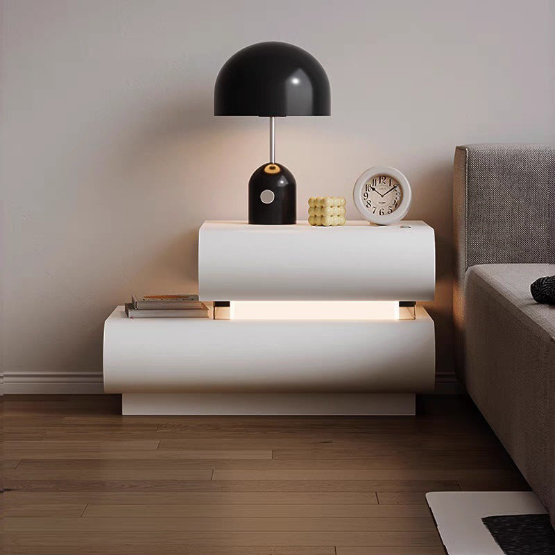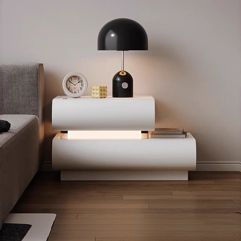 This contemporary creative nightstand is crafted from premium microfiber leather and solid wood in a curved square design. Available in white, black, light gray, and champagne, it features 2 spacious drawers, a wide tabletop, and sturdy weight-bearing construction—perfect for stylish and practical bedroom storage.