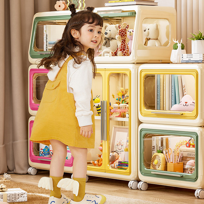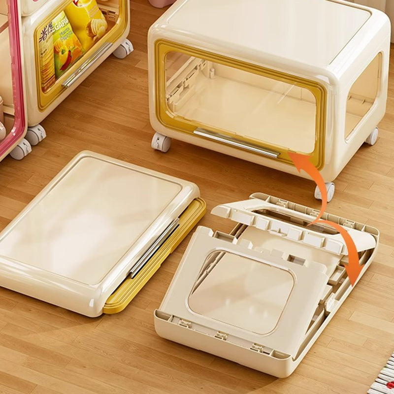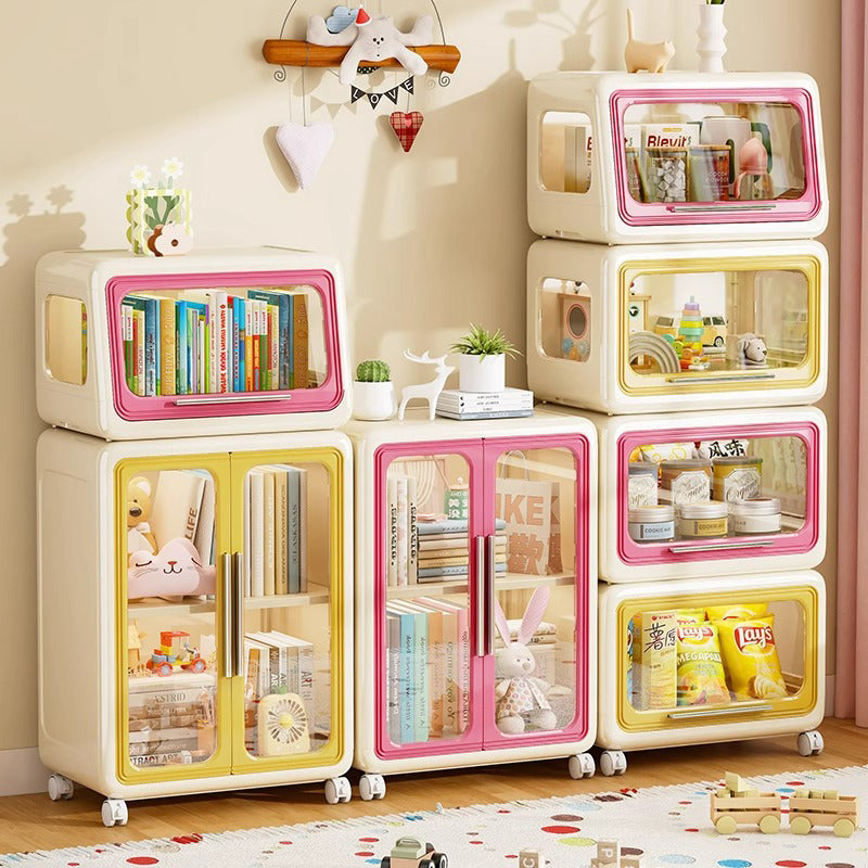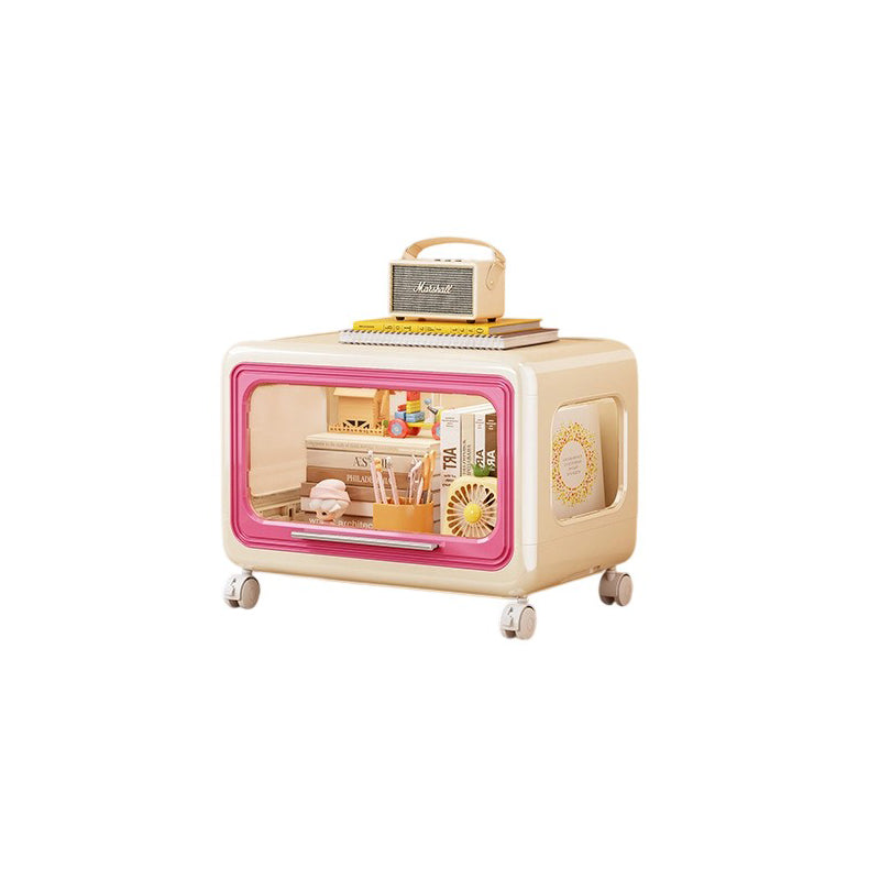 This contemporary creative storage cabinet is made of durable PET with a slanted rectangular design, available in pink, yellow, green, and cream white. Featuring smooth-rolling wheels, it offers safe, stable, and convenient storage for toys, books, or household essentials in the living room.