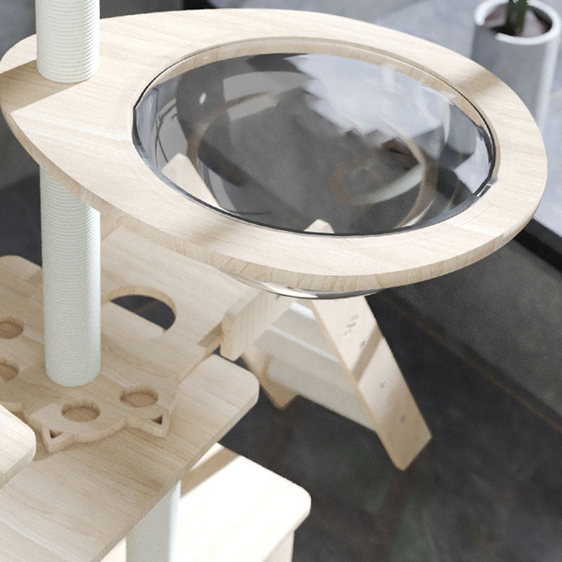 Elevate your cat's environment with this premium multi-level cat tree, designed to blend sophisticated aesthetics with robust functionality. The sturdy frame is constructed from durable solid pine wood, finished in a calming natural wood or crisp white tone, ensuring stability and a seamless fit into modern interiors. A major highlight is the transparent cozy acrylic space pod, offering your feline a secure, panoramic resting spot that doubles as an eye-catching focal point.