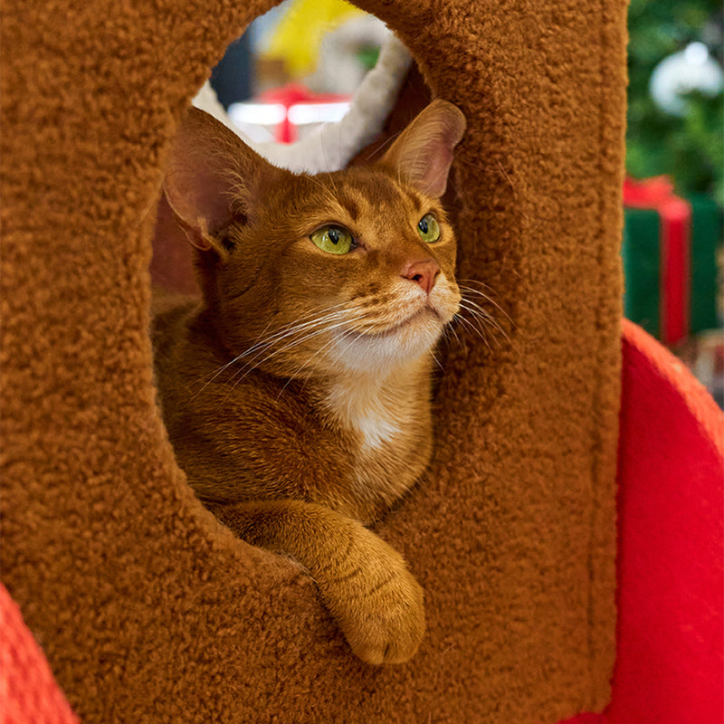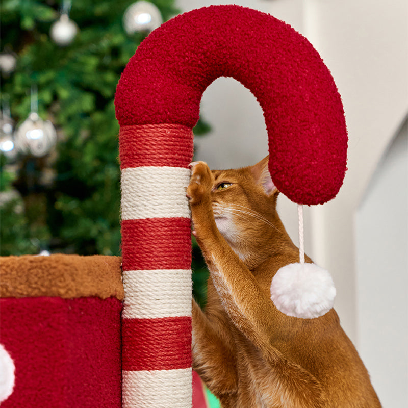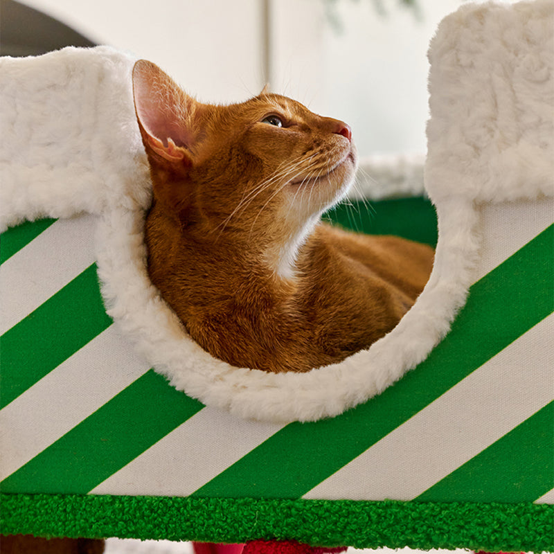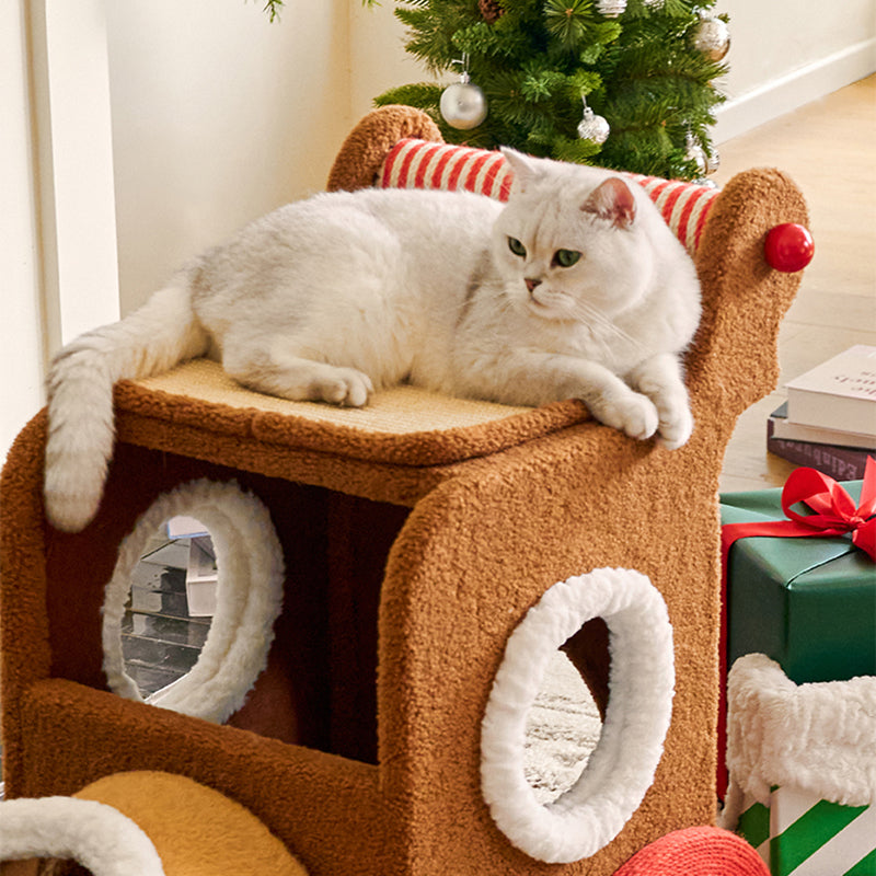 The innovative rectangular layout maximizes functional space, featuring integrated cat tunnels, multiple sleeping cabins, and robust sisal scratching posts to protect your home furniture. Whether your cats are racing through the tunnels, sharpening their claws, or curled up in the integrated fabric beds, this multifunctional tower delivers. Its festive and colorful silhouette makes it a bold statement piece for your living room or bedroom. Optimized for North American consumers searching for Christmas cat trees, multi-cat train condos, unique holiday pet furniture, and festive indoor cat climbers with scratchers.