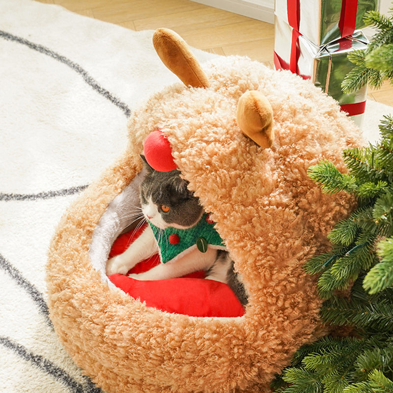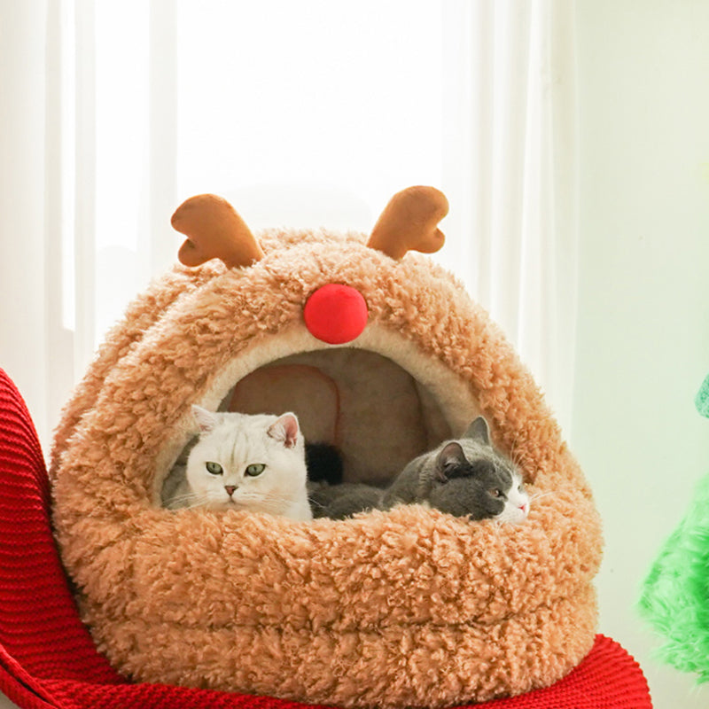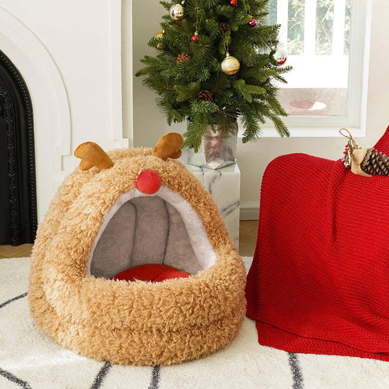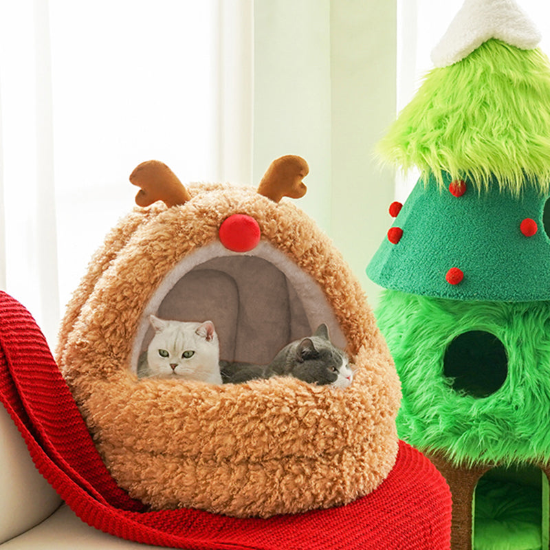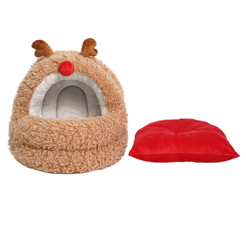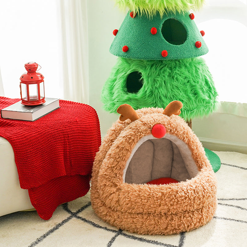 The clever semi-enclosed space is engineered to provide your cat or small dog with a high degree of comfort and a strong sense of security, mimicking a safe, warm winter hideaway. Its versatile, compact shape makes it an ideal, comfortable addition to any living room or bedroom. Optimized for North American consumers searching for reindeer pet beds, plush round cat houses, small dog cozy hideaways, and semi-enclosed warm winter pet furniture for contemporary homes.
