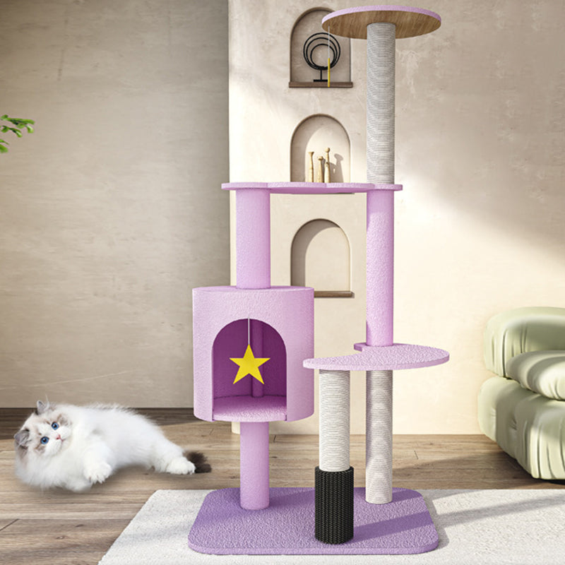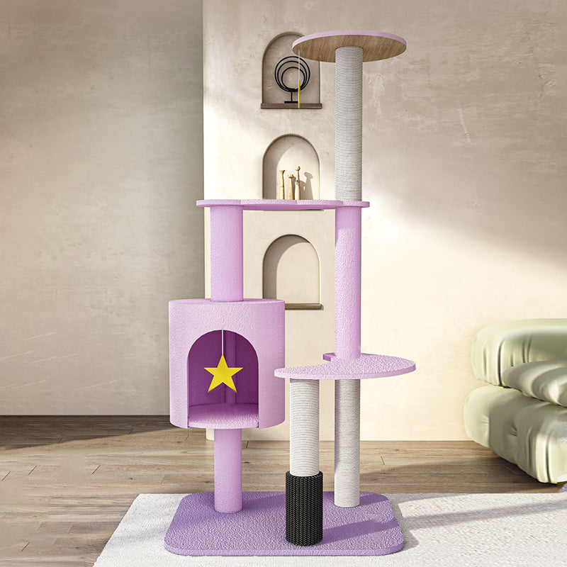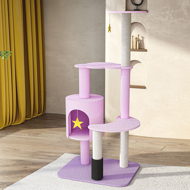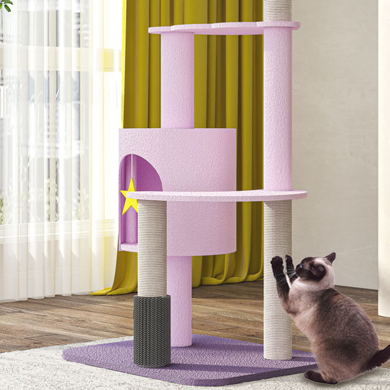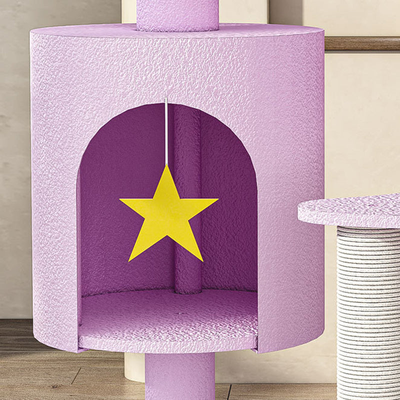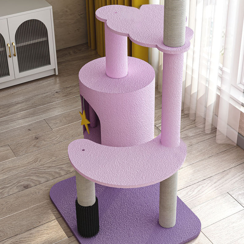 The expansive 4-level multi-functional layout is perfectly suited for multi-cat households, comfortably accommodating both large cats and active kittens. It offers comprehensive vertical space for climbing, satisfying scratching zones, and multiple spots for resting and elevated lounging—all in one stylish unit. Finished in playful purple and pink tones, this tower is optimized for North American consumers searching for round plush cat trees, 4-level sisal scratchers for multi-cats, purple and pink pet furniture, and contemporary particleboard cat condos for living rooms or bedrooms.