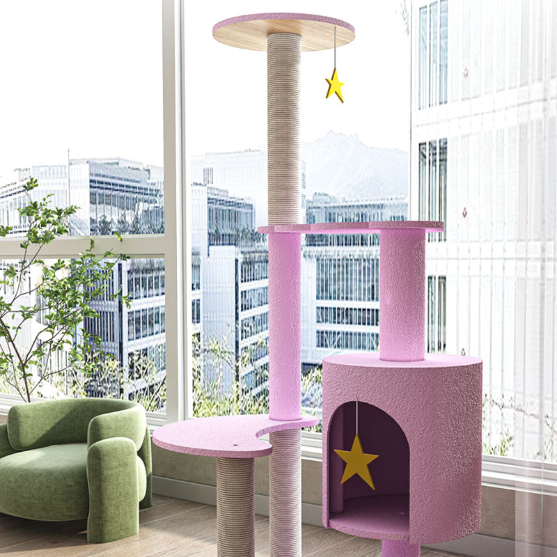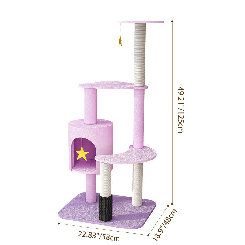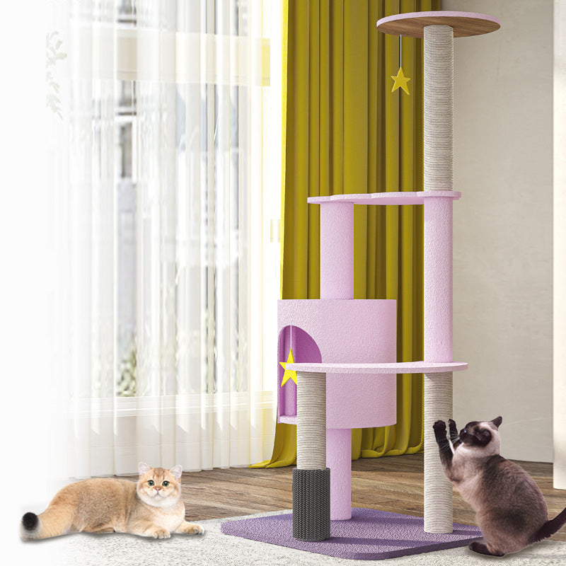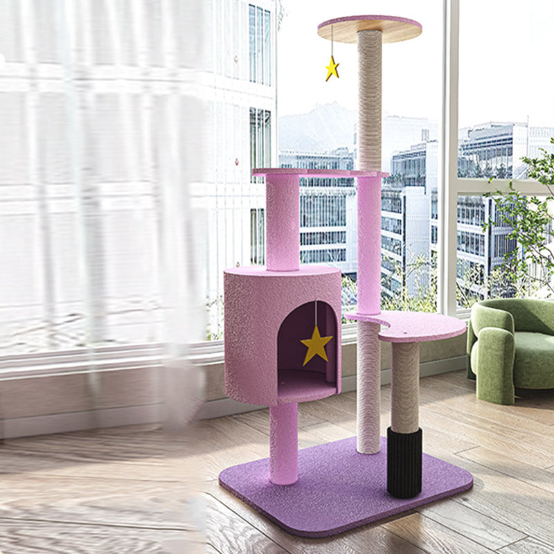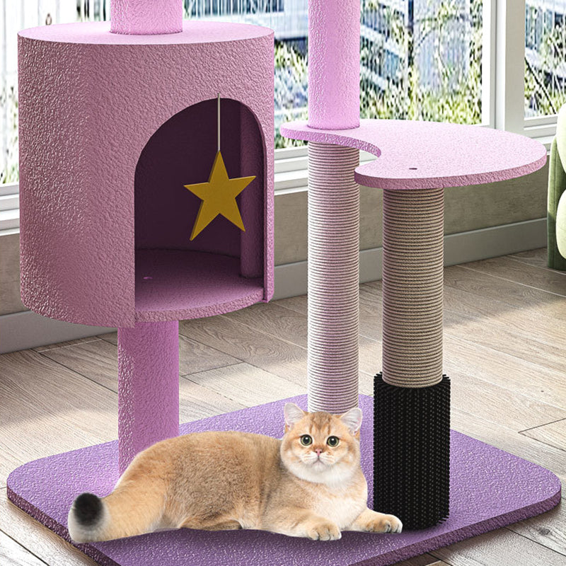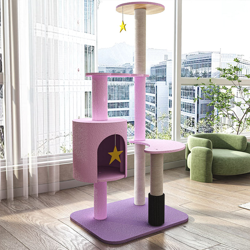 The expansive 4-level multi-functional layout is perfectly suited for multi-cat households, comfortably accommodating both large cats and active kittens. It offers comprehensive vertical space for climbing, satisfying scratching zones, and multiple spots for resting and elevated lounging—all in one stylish unit. Finished in playful purple and pink tones, this tower is optimized for North American consumers searching for round plush cat trees, 4-level sisal scratchers for multi-cats, purple and pink pet furniture, and contemporary particleboard cat condos for living rooms or bedrooms.