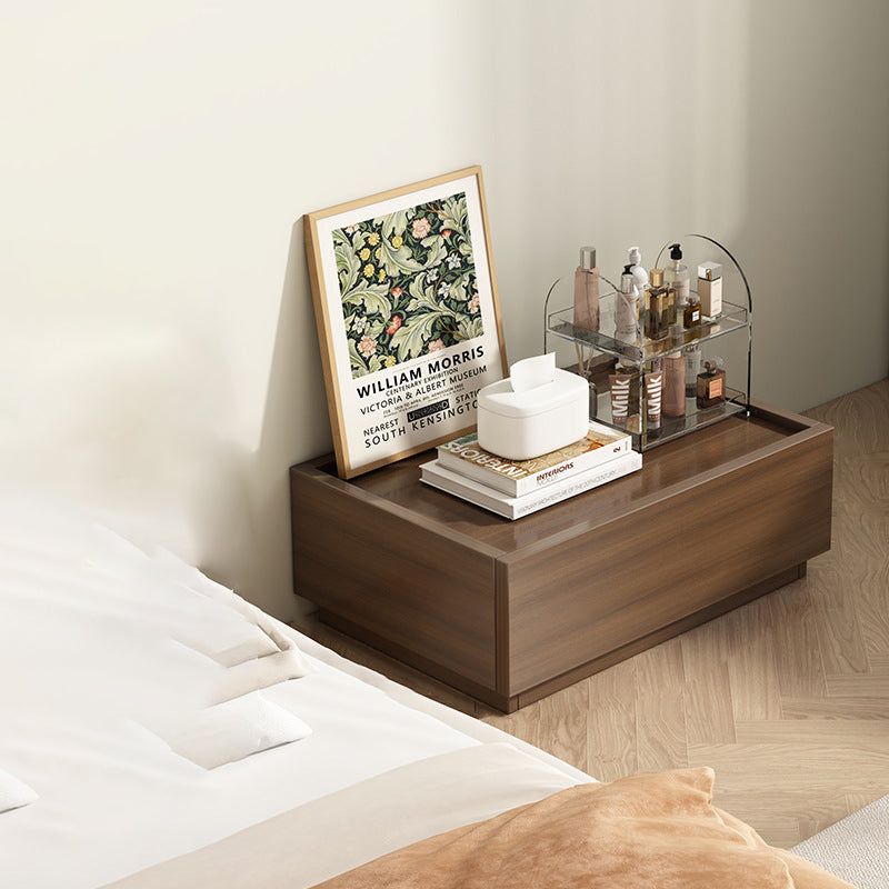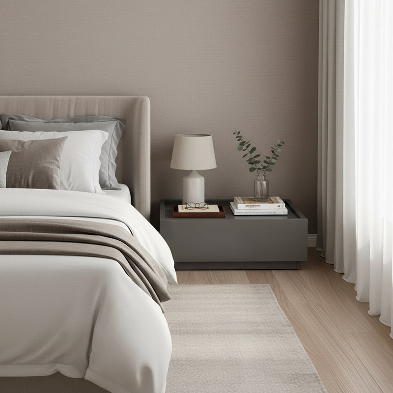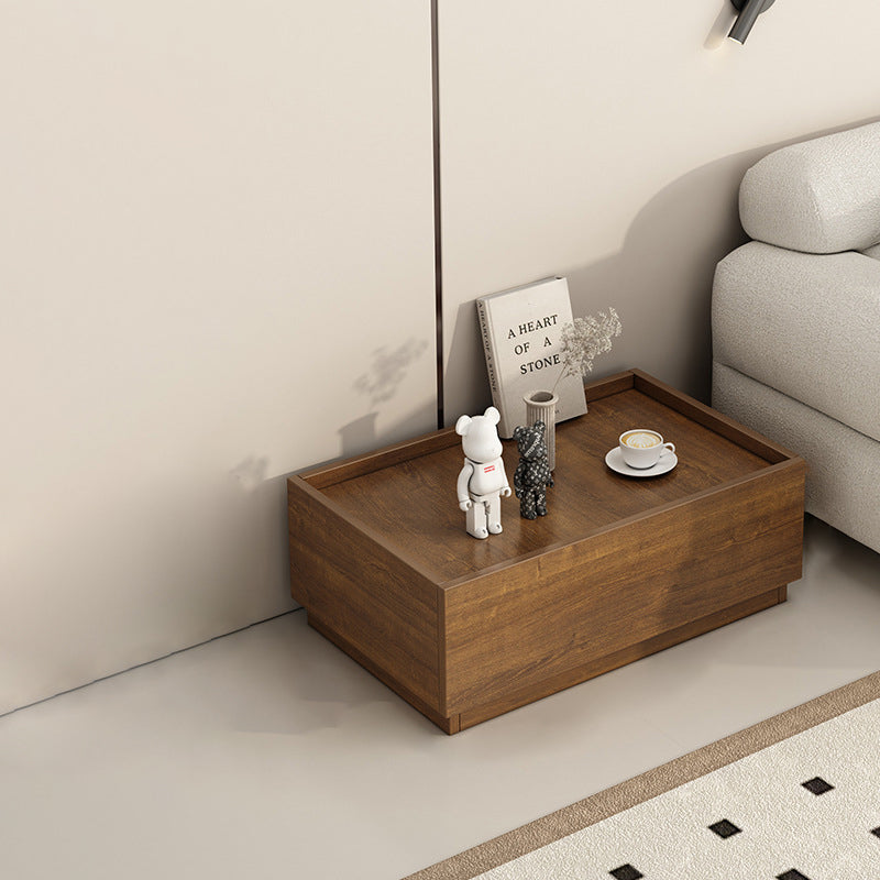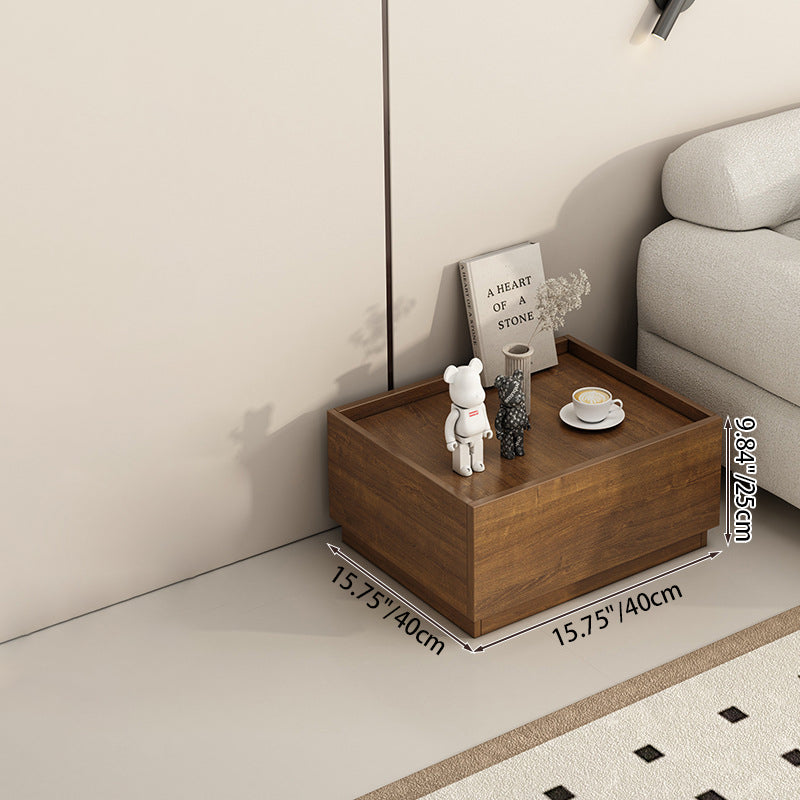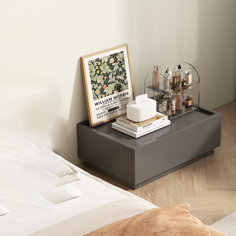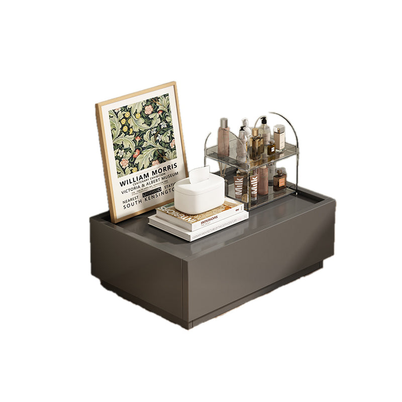 This modern minimalist nightstand is crafted from durable engineered wood and designed with a clean, rectangular silhouette that elevates any bedroom. It features a smooth single drawer for concealed storage and an open-top surface with raised edges to keep essentials securely in place. Available in gray or brown, this sleek bedside table includes hidden handles for a streamlined look, making it an ideal choice for stylish and practical bedroom storage.