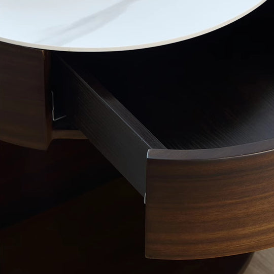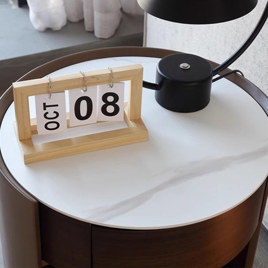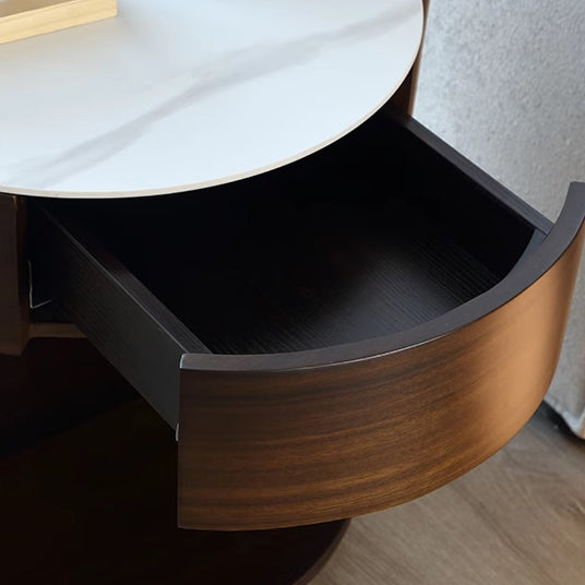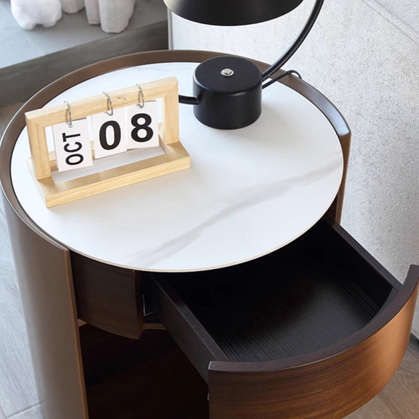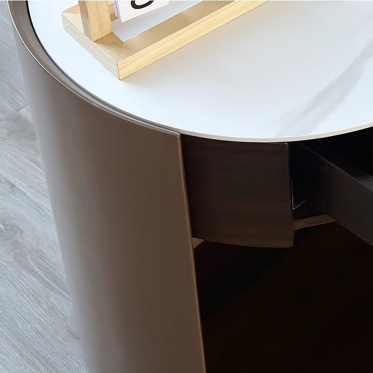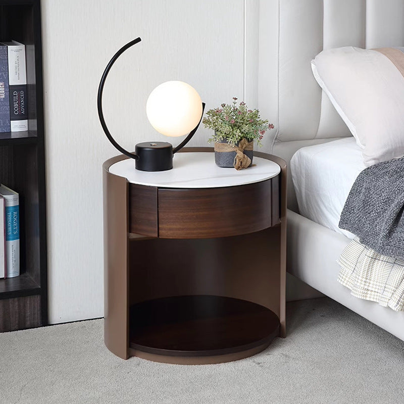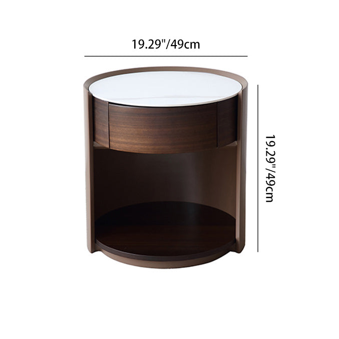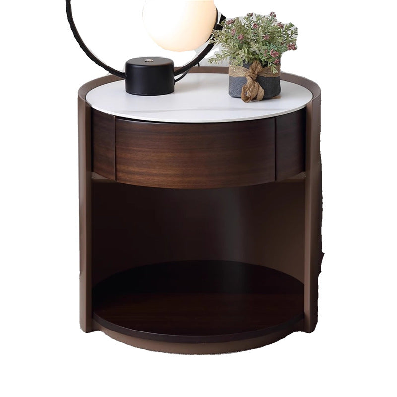 This traditional Chinese nightstand features sintered stone and medium density fiberboard in a brown round cylinder design. With 2 tiers, a heat-resistant and scratch-resistant surface, plus a recessed cabinet top to keep small items from slipping, it offers both durability and refined style for the bedroom.