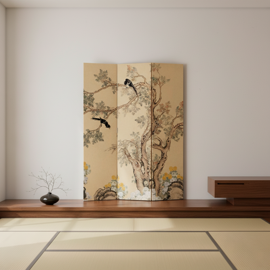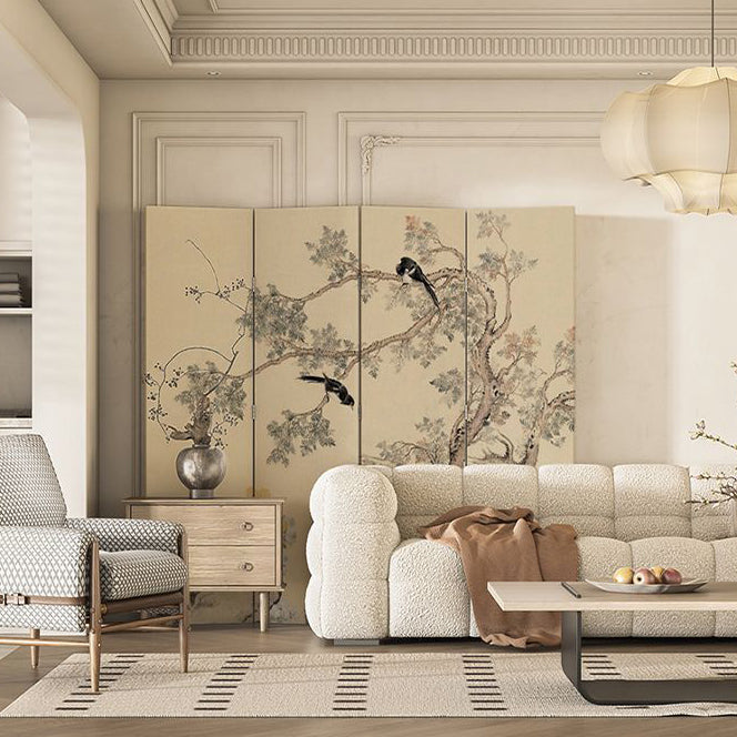 Traditional French Rectangular Fir Wood Solid Wood Plywood Cotton Canvas Floral And Bird Motif Room Divider For Living Room