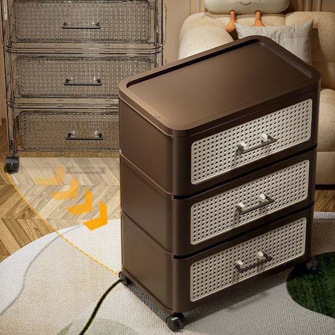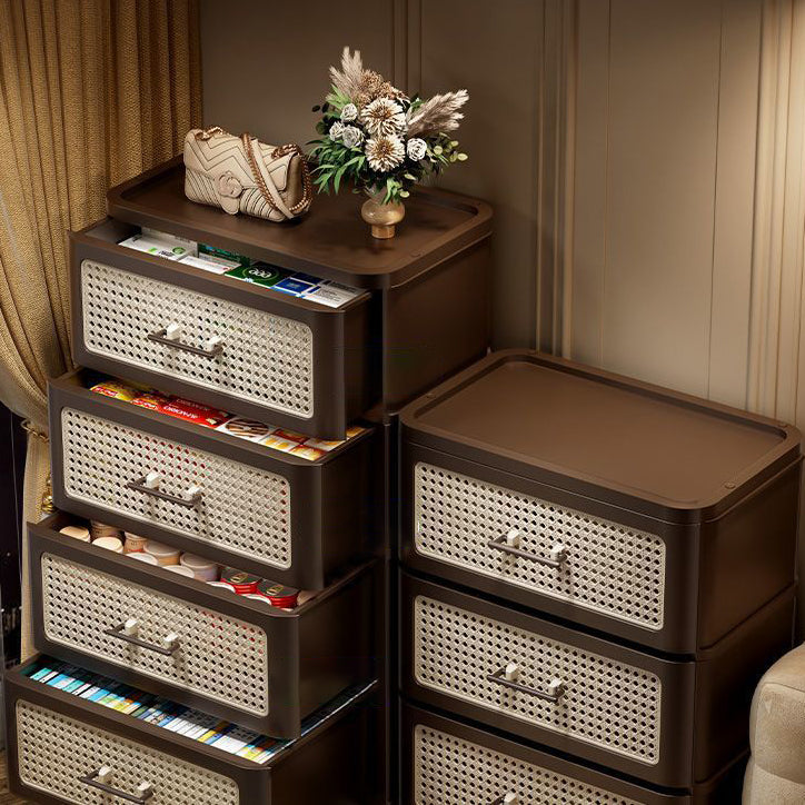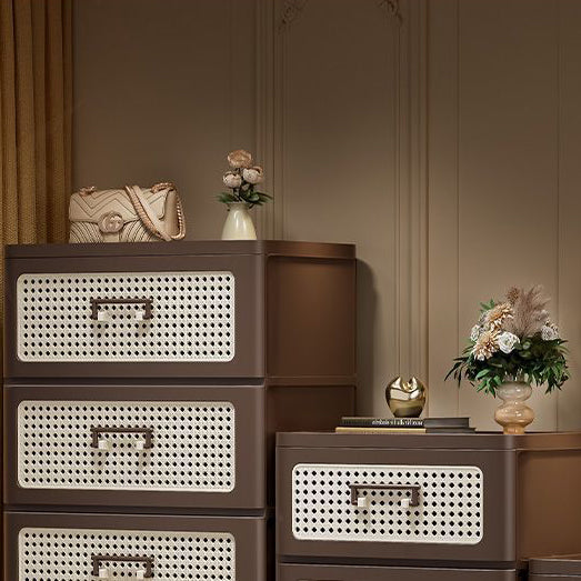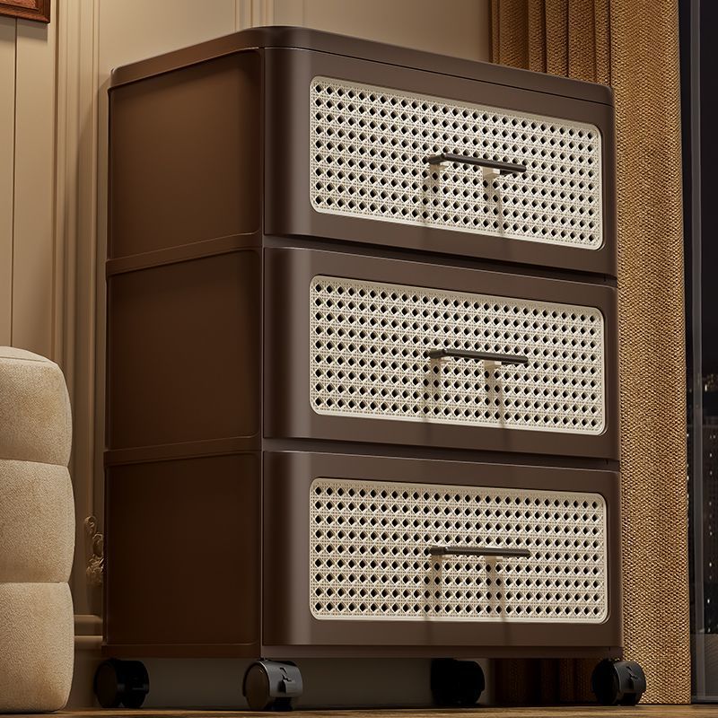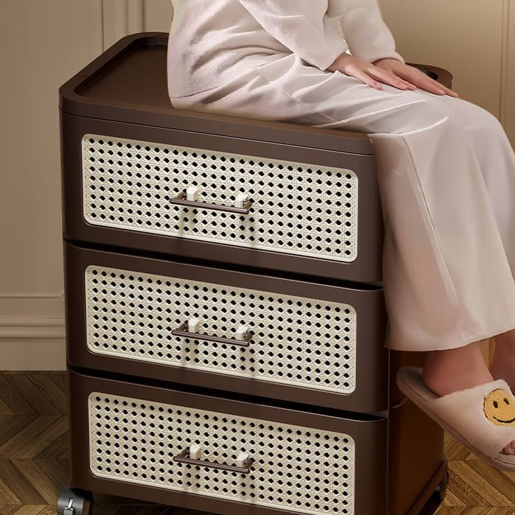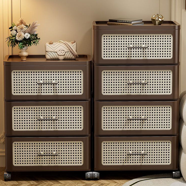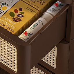 This traditional Chinese faux rattan and PP side table in walnut finish features a rounded square shape with 3/4-tier storage. Designed with smooth-rolling caster wheels, sturdy thickened panels, and a stable structure, it offers easy mobility and durable storage for clothes, snacks, or living room essentials.