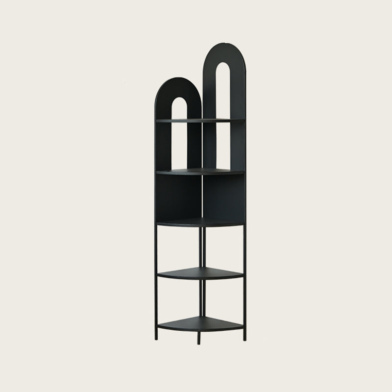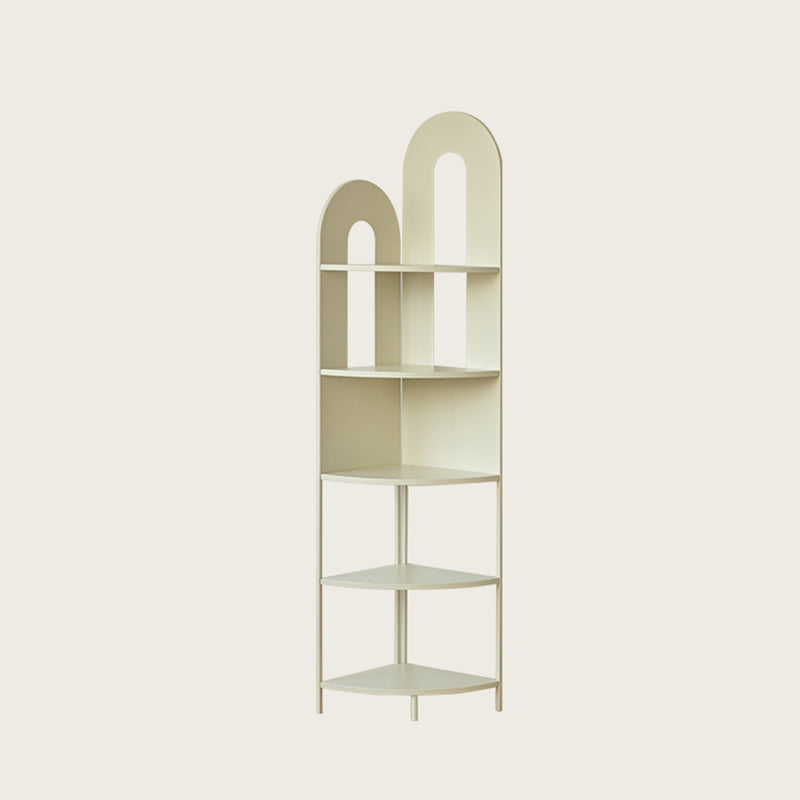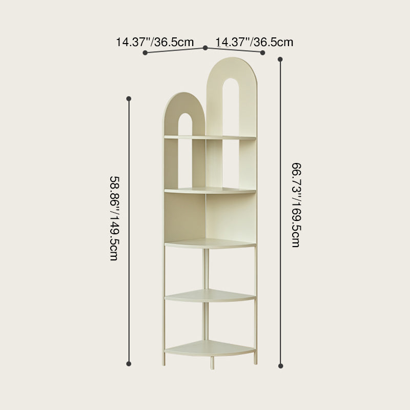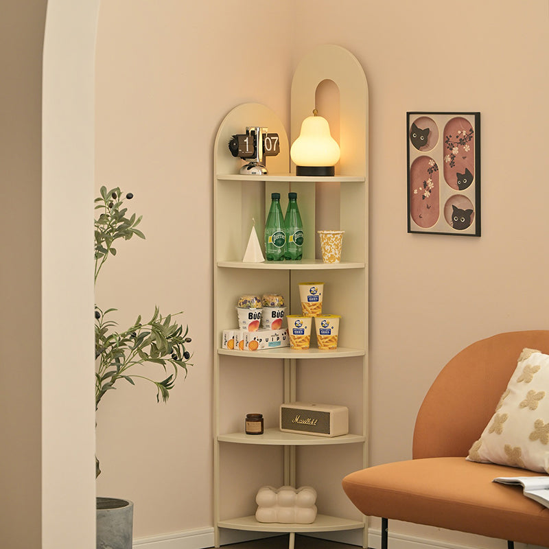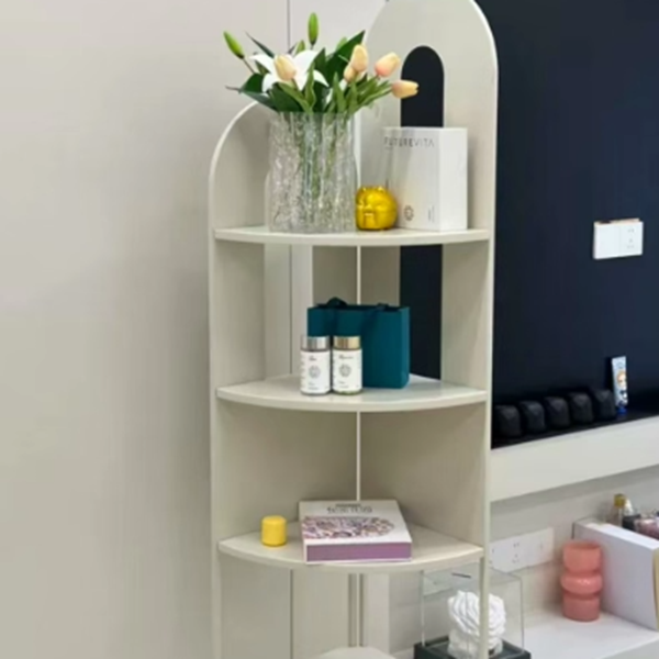 This contemporary creative corner shelf unit features a fan-shaped curved design with five open tiers, offering strong load-bearing support and easy access storage. Crafted from durable iron and available in cream white or black, it’s a stylish space-saving solution for organizing books, décor, and essentials in the living room.