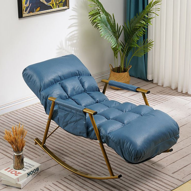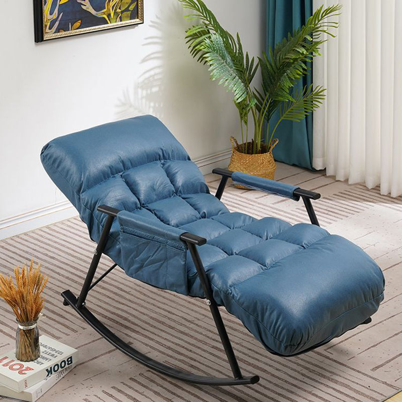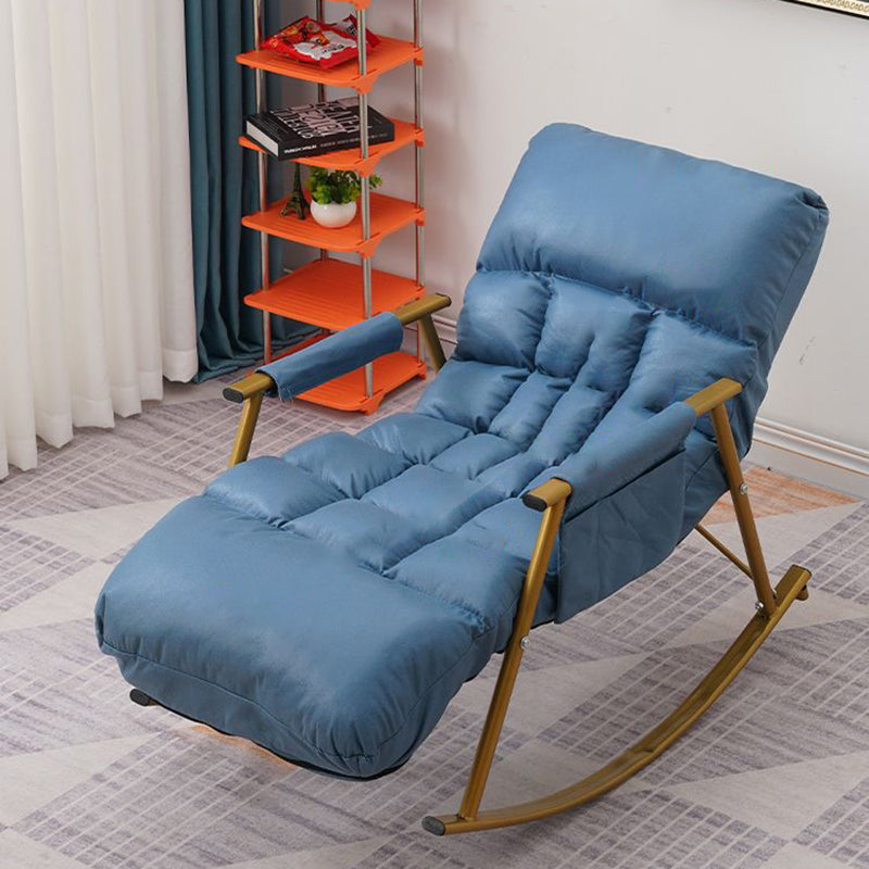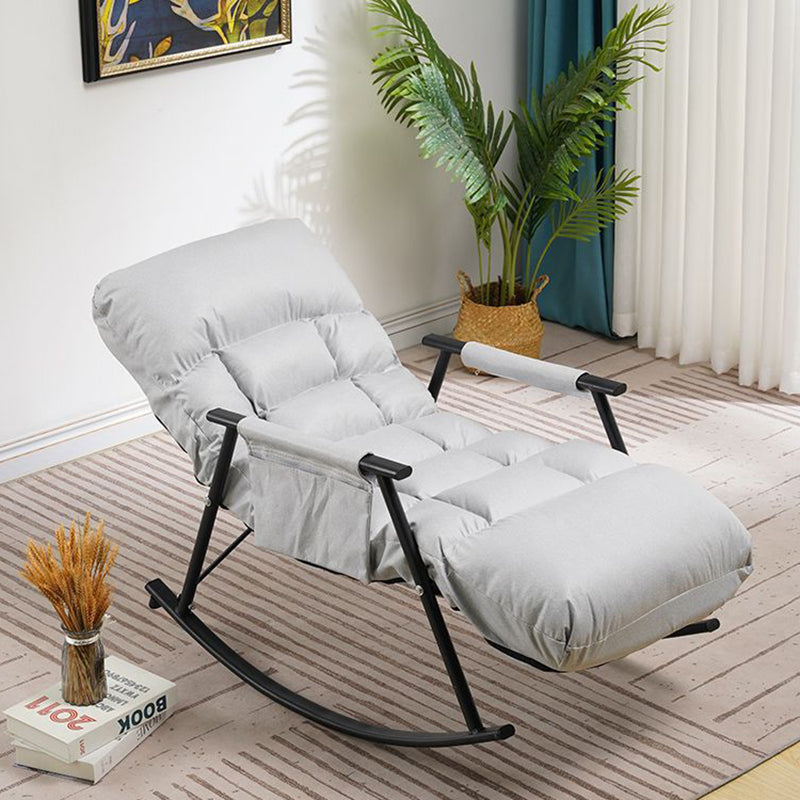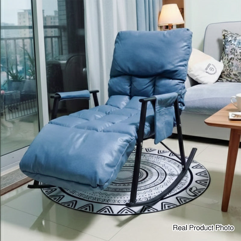 Relax in style with this contemporary nordic reclining rocking chair, featuring technology fabric and durable carbon steel. Available in deep blue and grey-white, it offers a comfortable, ergonomic design with zero-pressure cushions, armrests, and a self-adhesive side pocket for extra storage. Perfect for lounging or napping, this chair combines modern design with superior comfort for your living room.