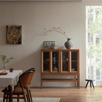 Traditional Rustic Rectangular Teak Glass Storage Cabinet 3-Tier For Living Room