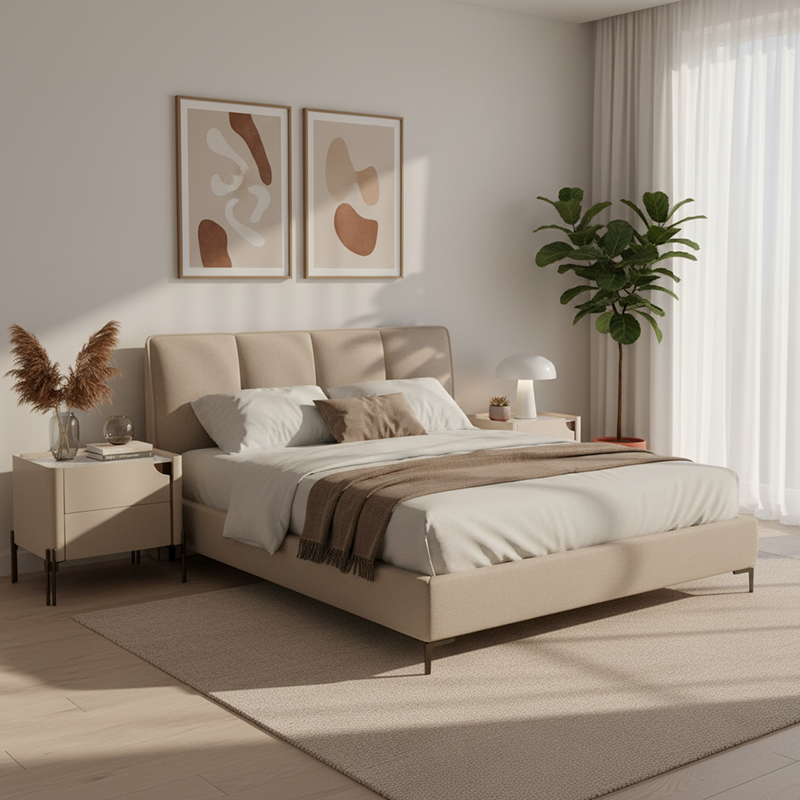 This modern Scandinavian nightstand blends elegant proportions with minimalist aesthetics. Crafted from eco-friendly MDF, the cabinet’s smooth beige finish creates a calming and refined atmosphere. The sintered stone tabletop features natural marble-like textures â€?resistant to heat, scratches, and stains â€?combining beauty with durability. Its curved edge design ensures safety and softens the geometric silhouette, while the titanium grey alloy legs add stability and a floating visual effect.