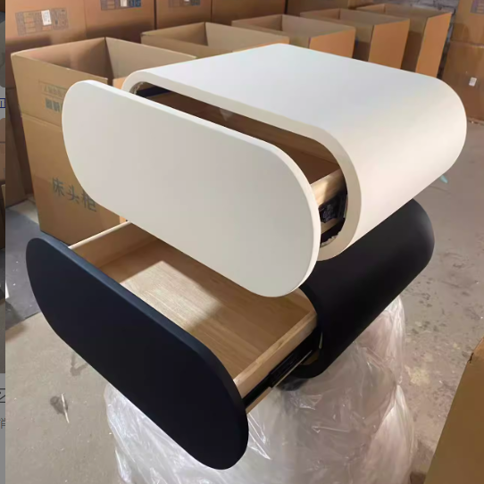 This modern luxury nightstand combines cat-scratch-resistant leather with solid wood for a sturdy and durable frame. Designed in a sleek oval shape with 2 spacious drawers, it comes in beige, black, walnut, and khaki—perfect for adding storage and elegance to any bedroom.