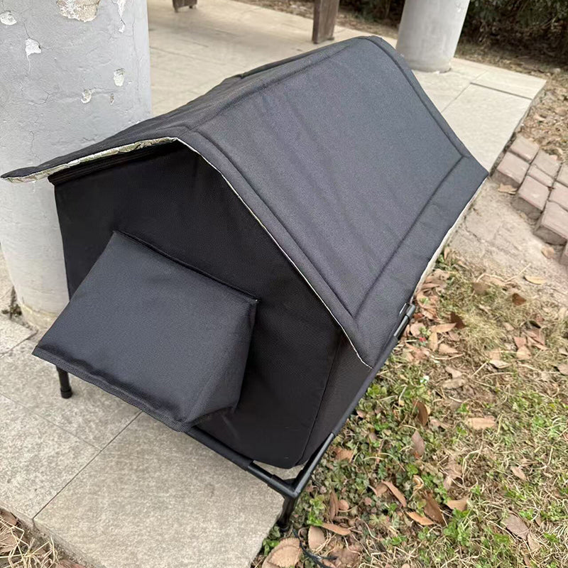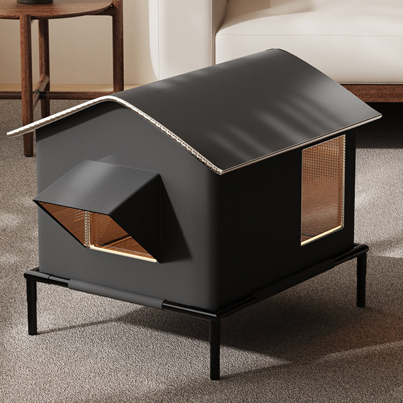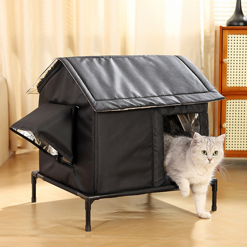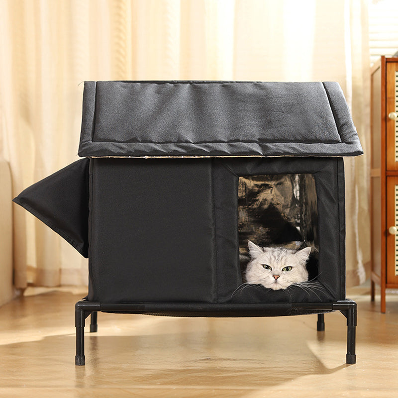 This black enclosed cat bed is designed for year-round comfort, featuring Oxford fabric construction with aluminum foil thermal insulation to retain heat during cold weather. The house-shaped design with elevated support structure helps protect pets from snow, wind, and ground moisture, making it ideal for outdoor garden use or indoor spaces.
