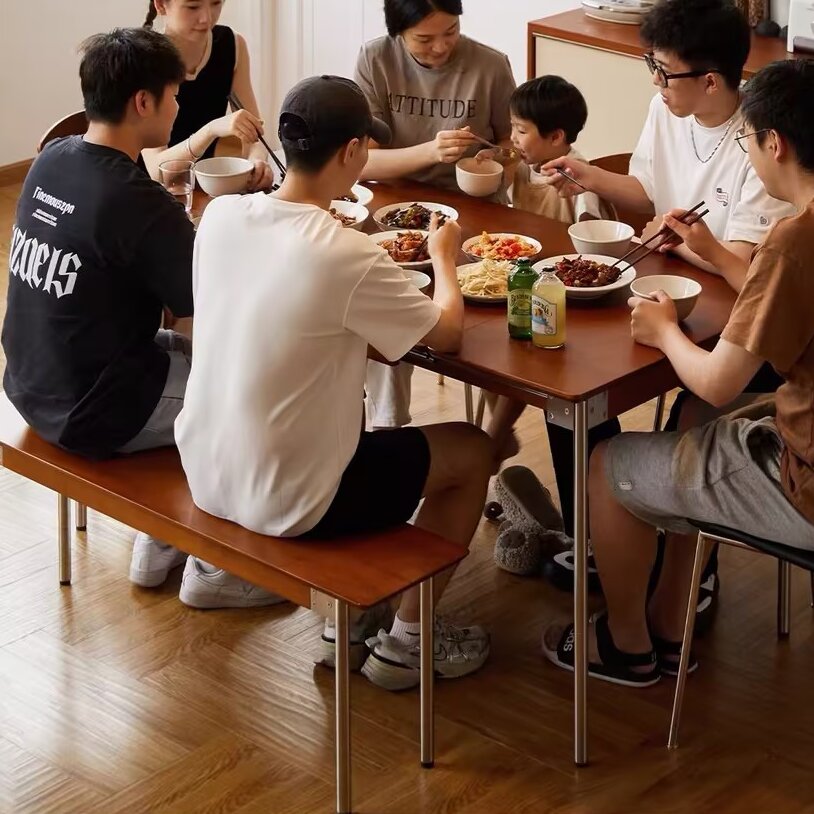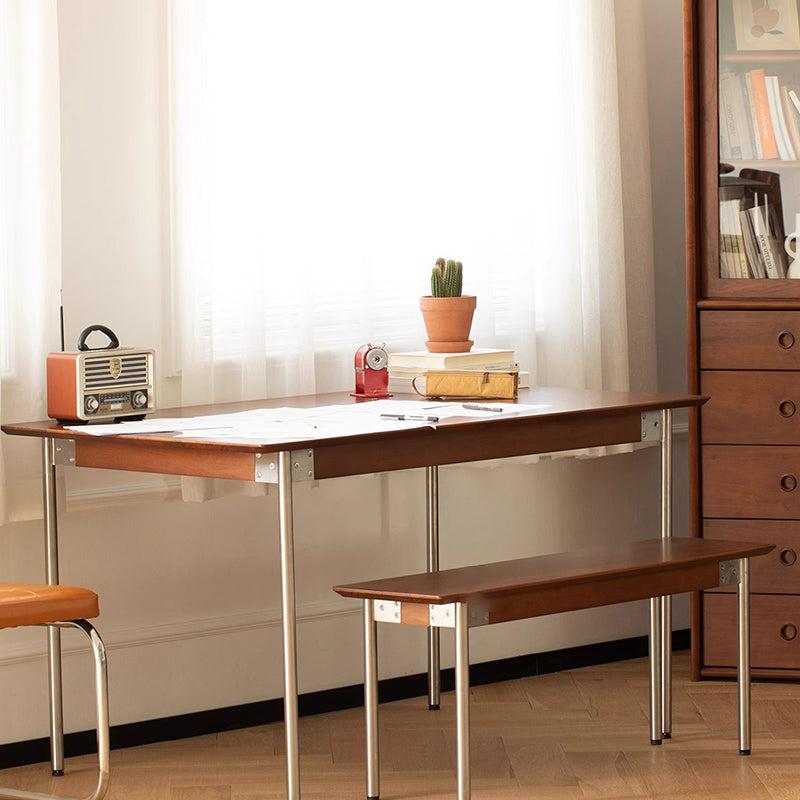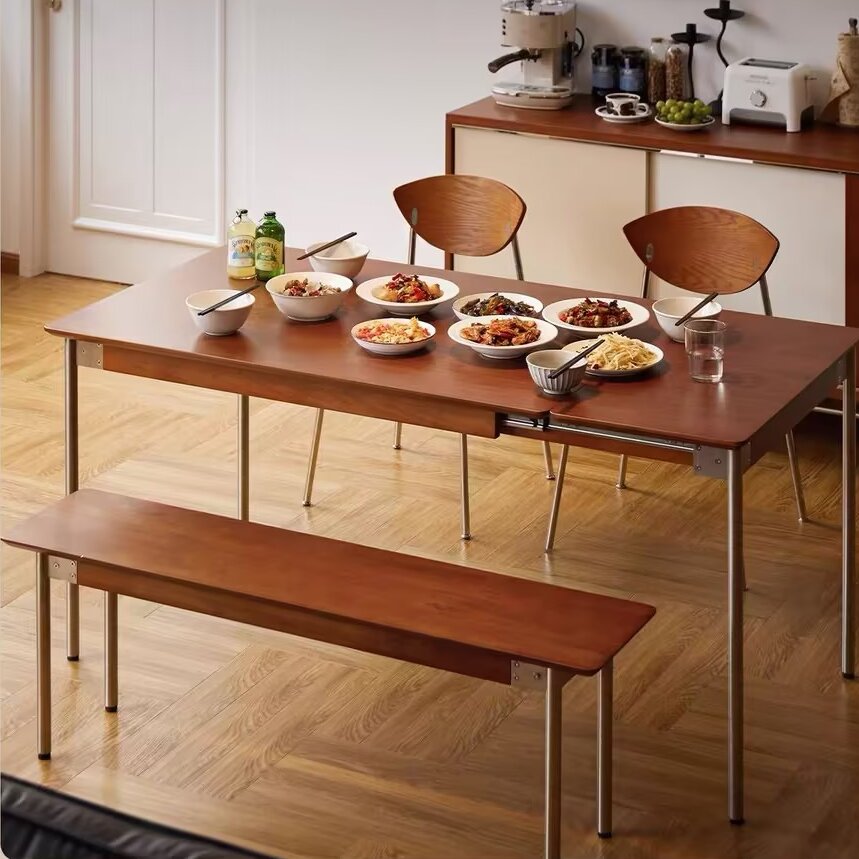 Crafted from durable pine wood with stainless steel accents, this rectangular dining bench brings a warm huanghuali-inspired tone to modern dining spaces. Designed for everyday comfort and style, it complements small and contemporary dining rooms with a clean, minimalist look.