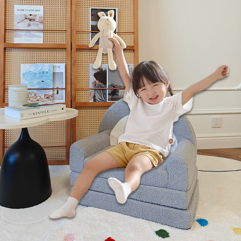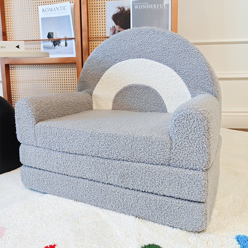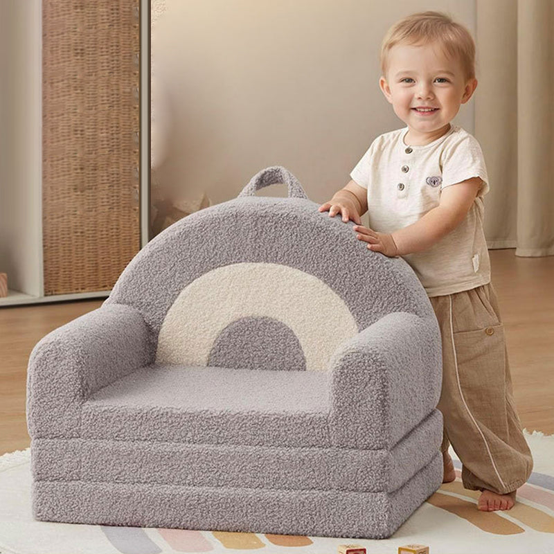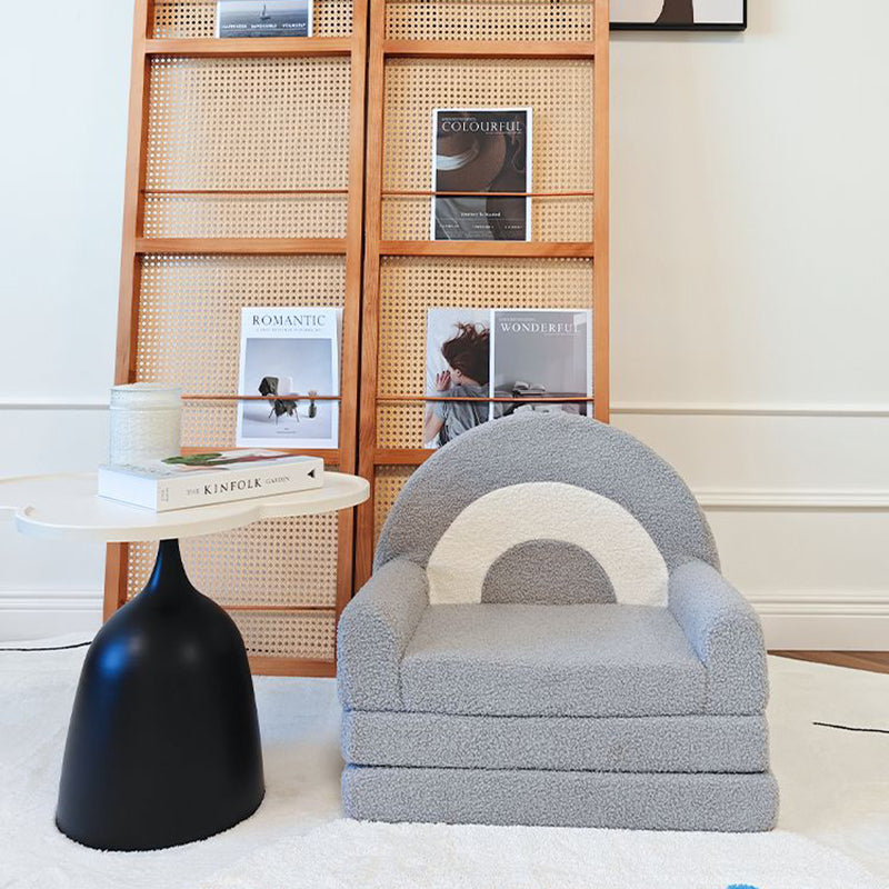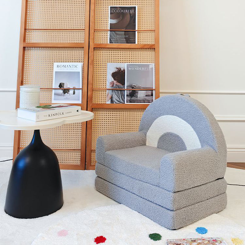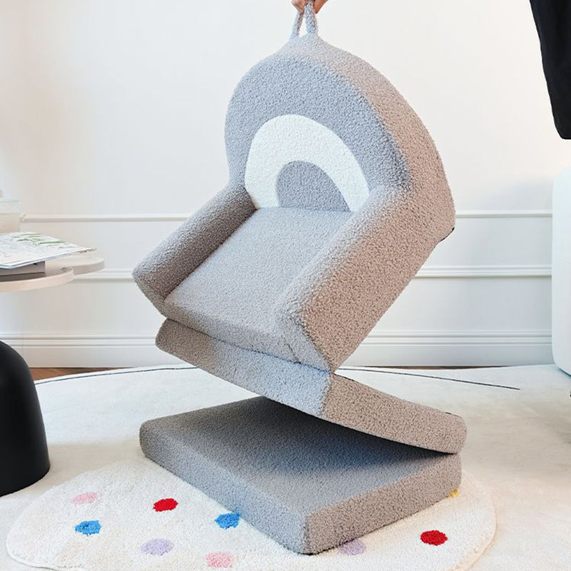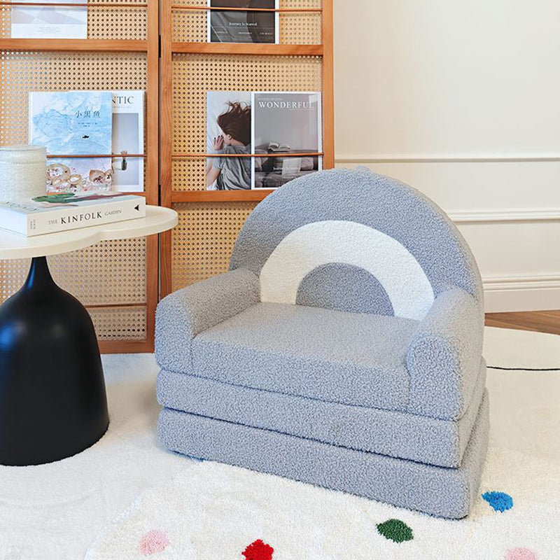 Create a cozy sanctuary for your little one with this contemporary creative kids sofa chair. Wrapped in ultra-soft teddy plush and cushioned with high-resilience foam, it features a curved design that provides a supportive backrest and armrests for safe, comfortable lounging. The three-sided wraparound seat offers a secure, hug-like feel, while the rounded, child-safe edges provide total peace of mind. Finished in a neutral gray tone, this lightweight foldable structure is easy to move, making it an ideal addition to living rooms, play areas, and cozy reading corners.