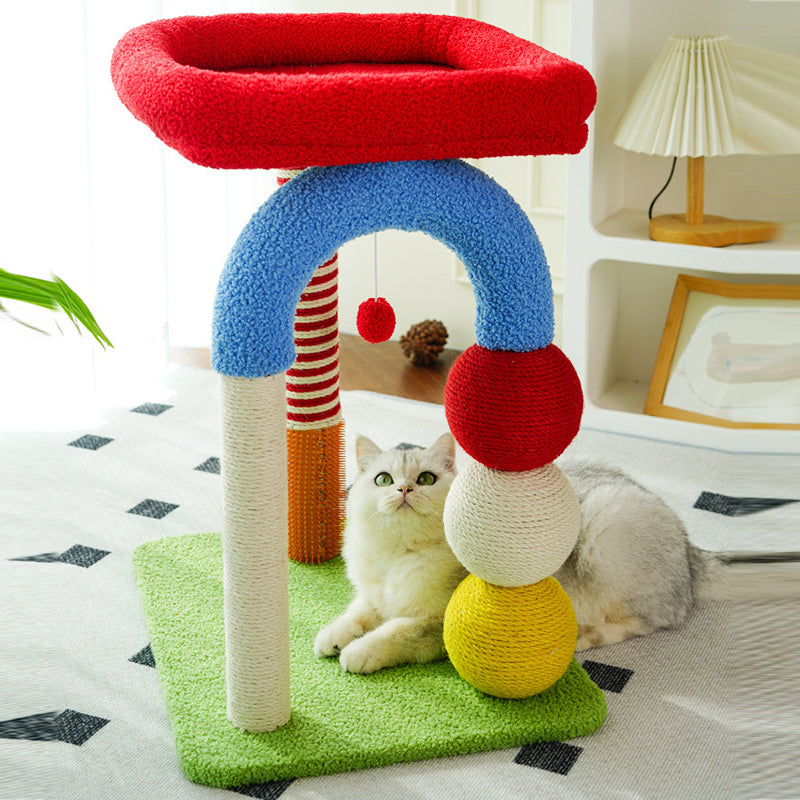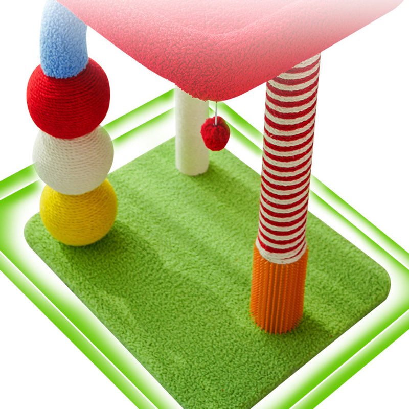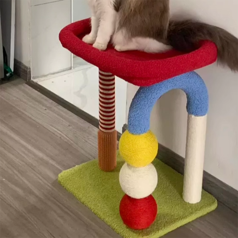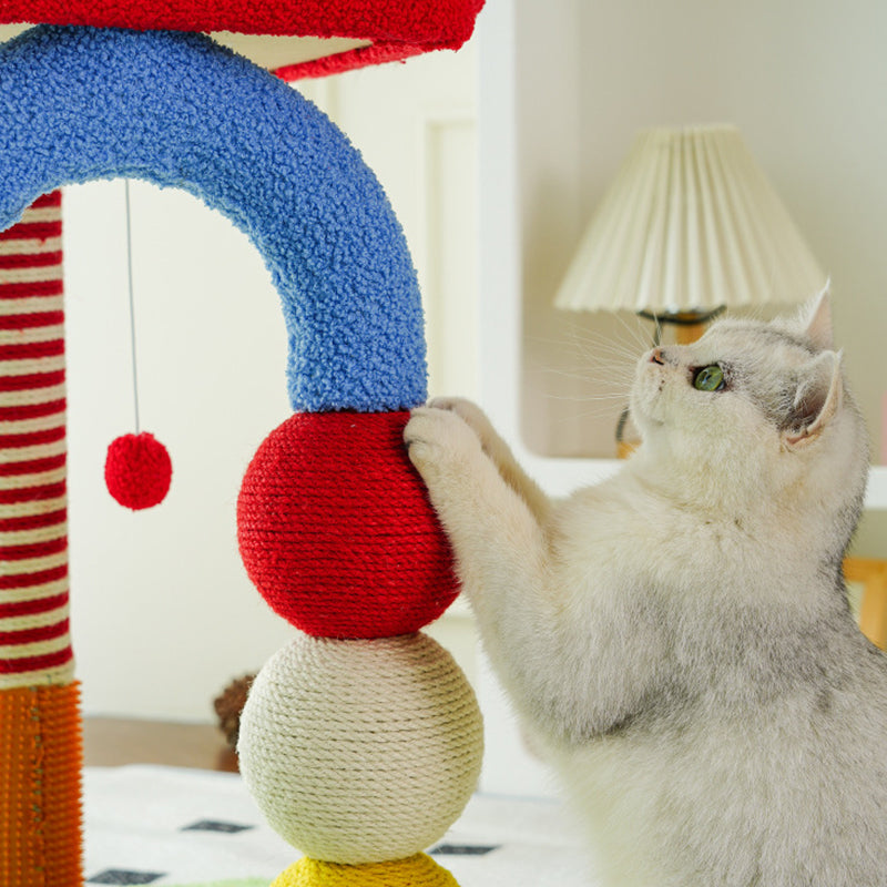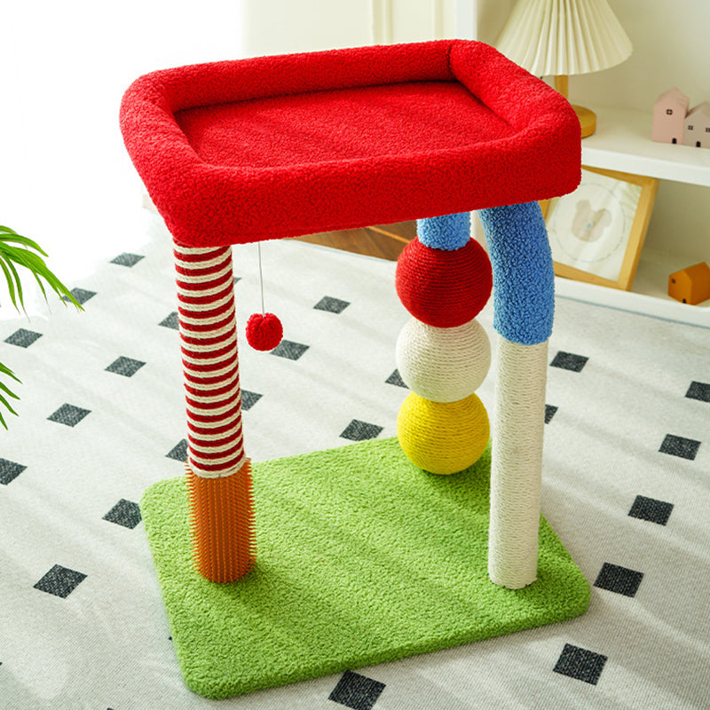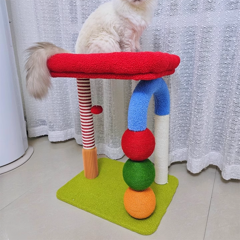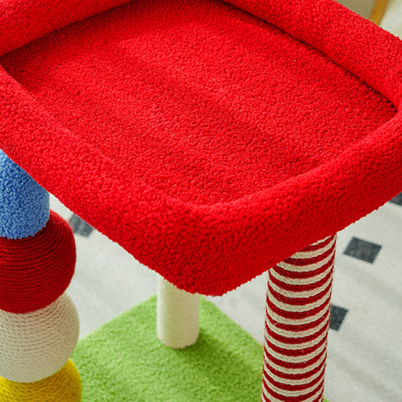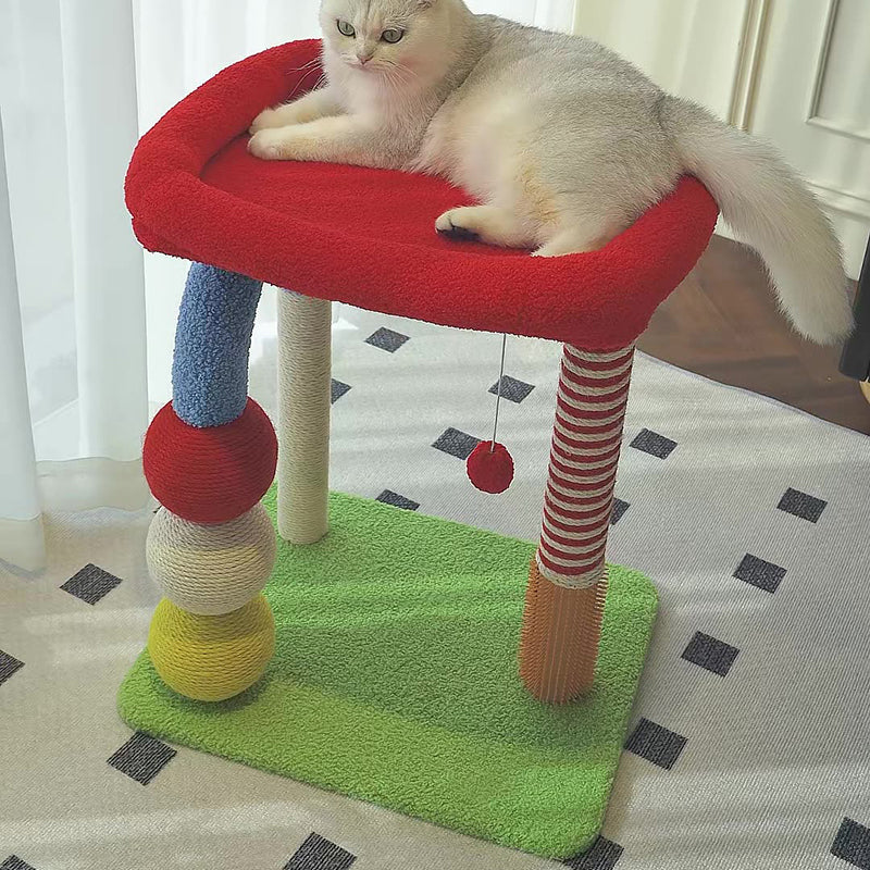 This contemporary creative cat tree features a geometric design with density board, teddy fleece, and sisal materials, coming in colorful options and a 2-tier structure. Equipped with a small staircase, it's scratch-resistant and wear-resistant, perfect for placing in the living room or bedroom as a functional cat furniture.
