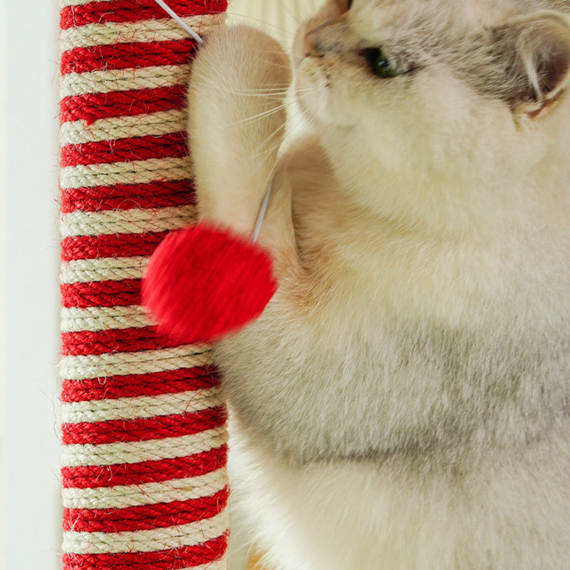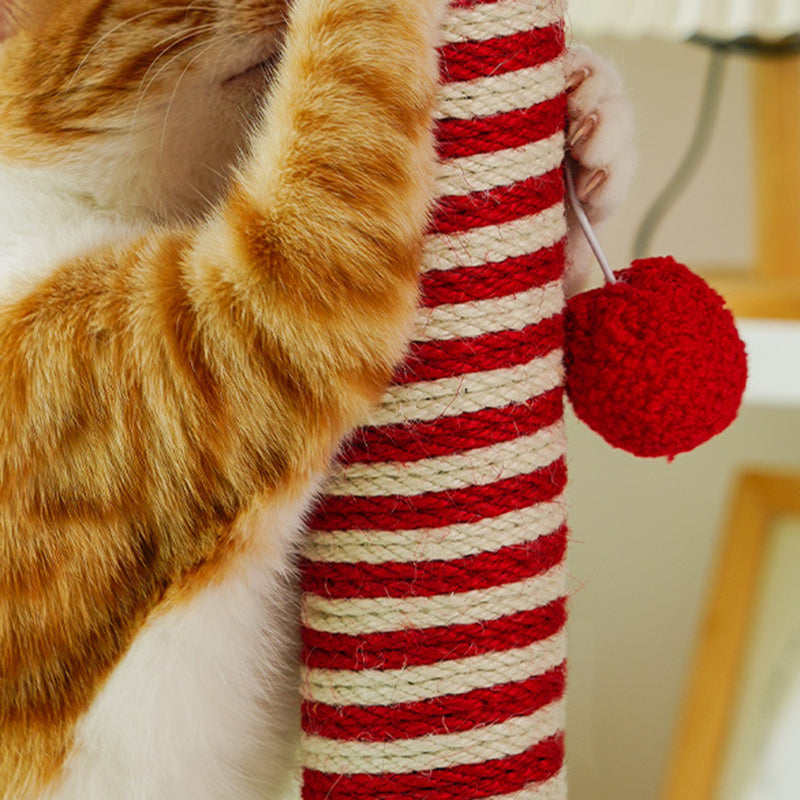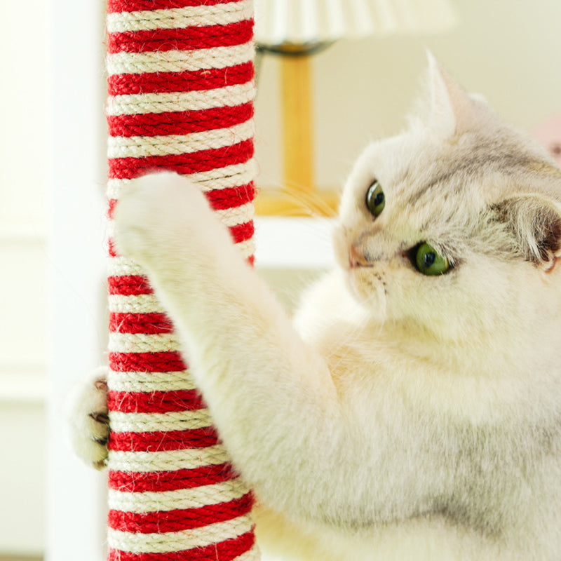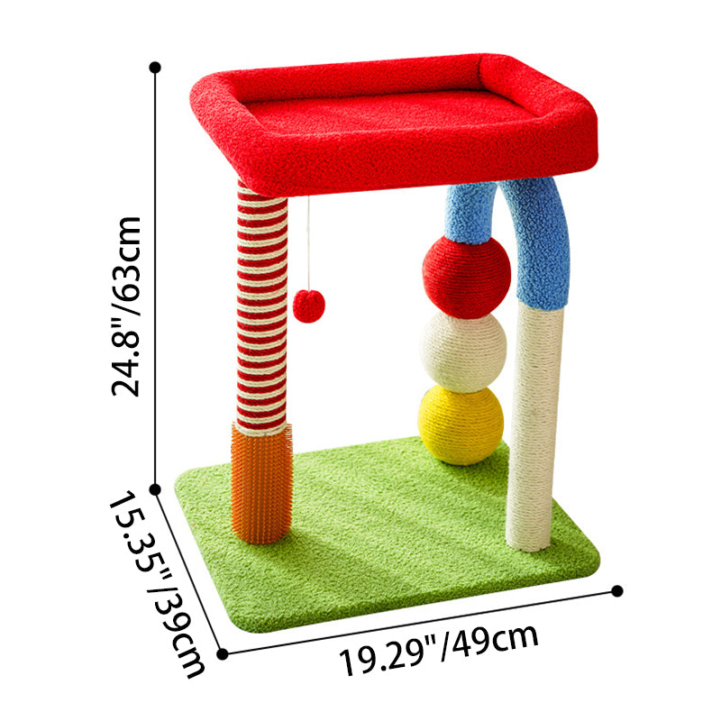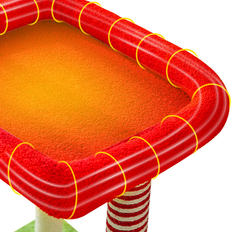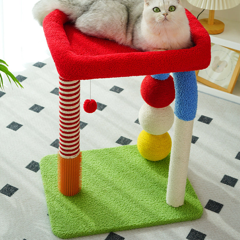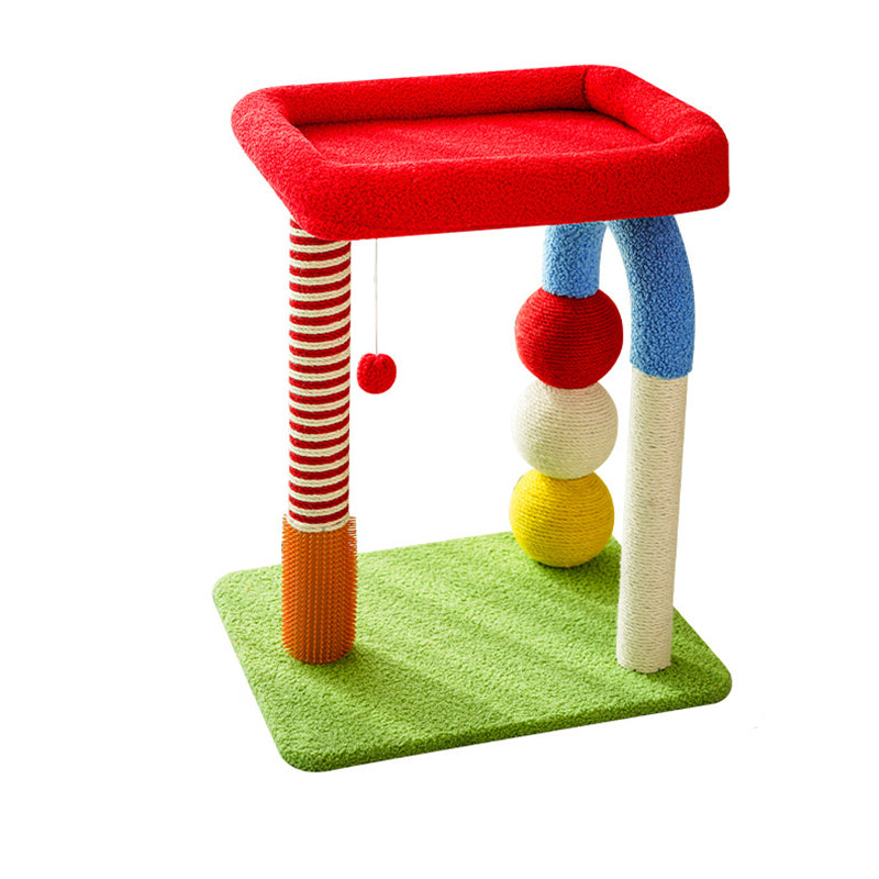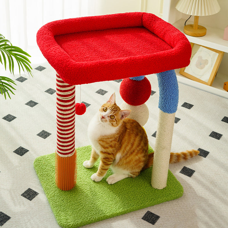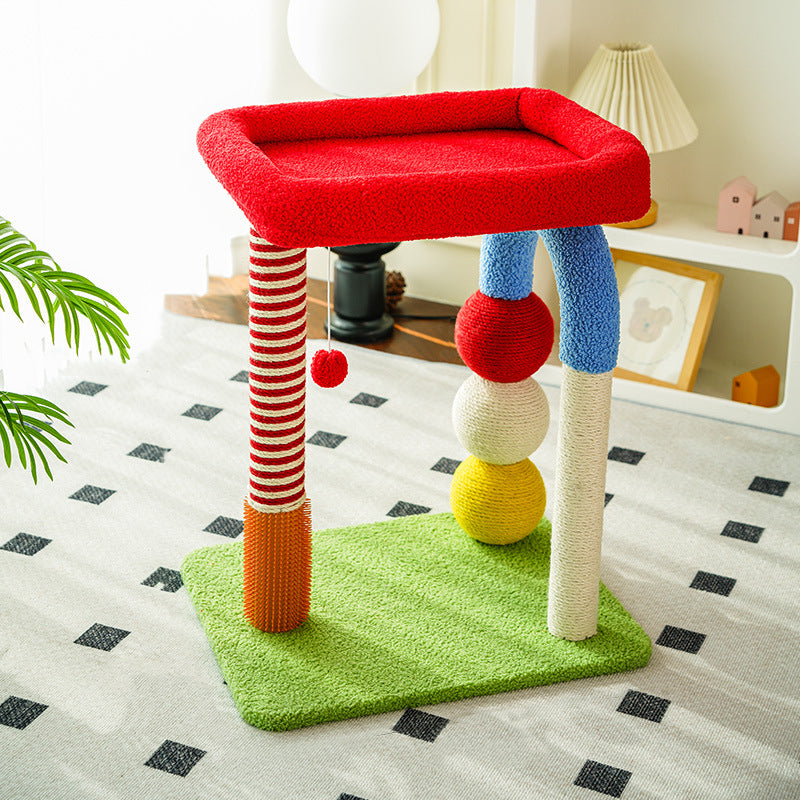 This contemporary creative cat tree features a geometric design with density board, teddy fleece, and sisal materials, coming in colorful options and a 2-tier structure. Equipped with a small staircase, it's scratch-resistant and wear-resistant, perfect for placing in the living room or bedroom as a functional cat furniture.