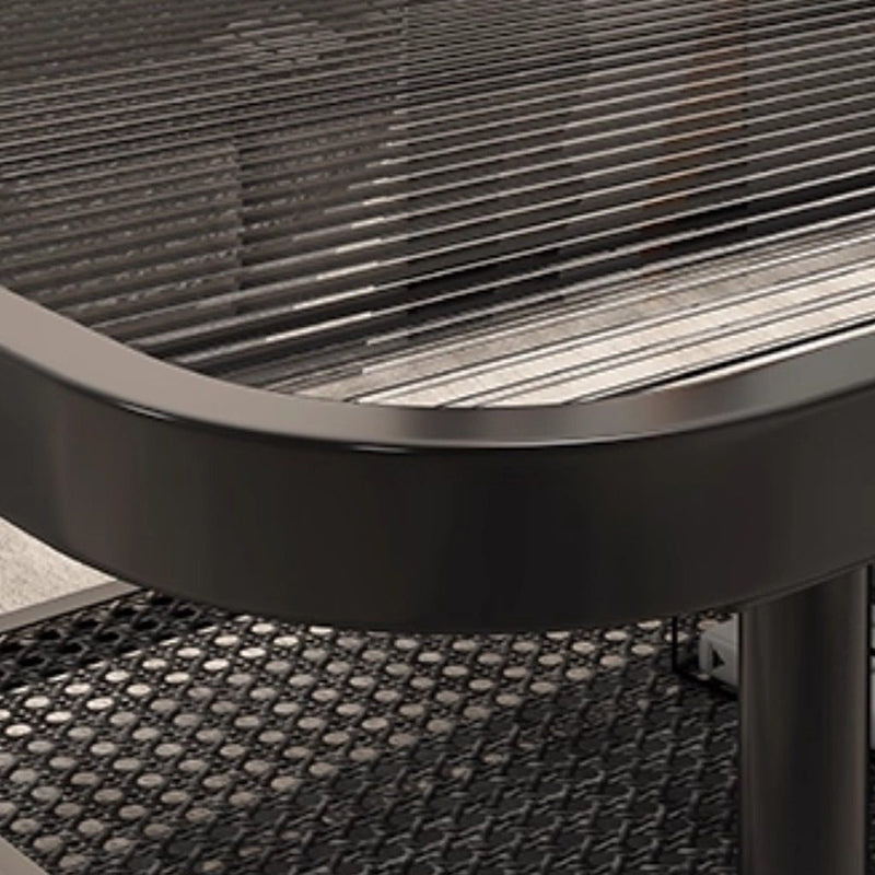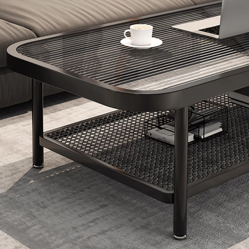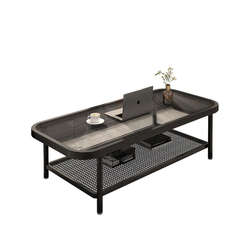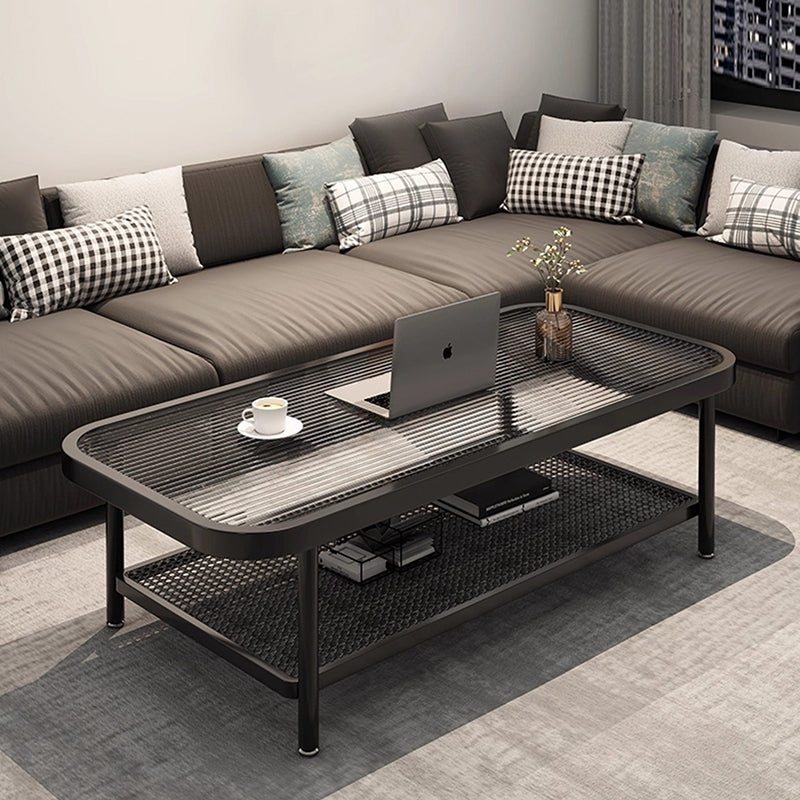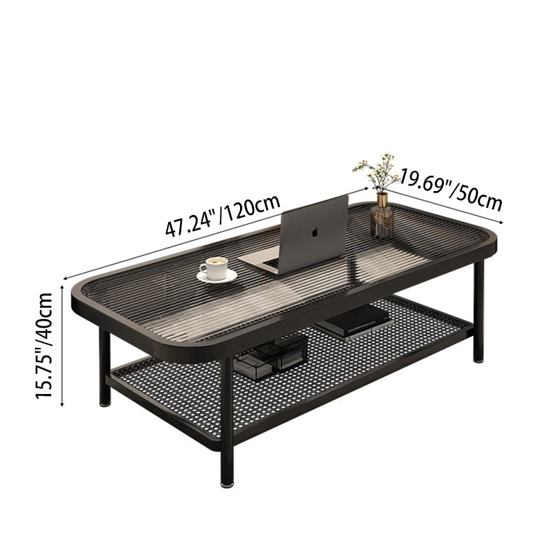 This traditional French coffee table showcases a rounded rectangular design with a durable glass and iron construction, featuring a 2-tier layout for organized storage and display. Finished in sleek black, its reinforced frame delivers exceptional stability while adding refined elegance to any living room.
