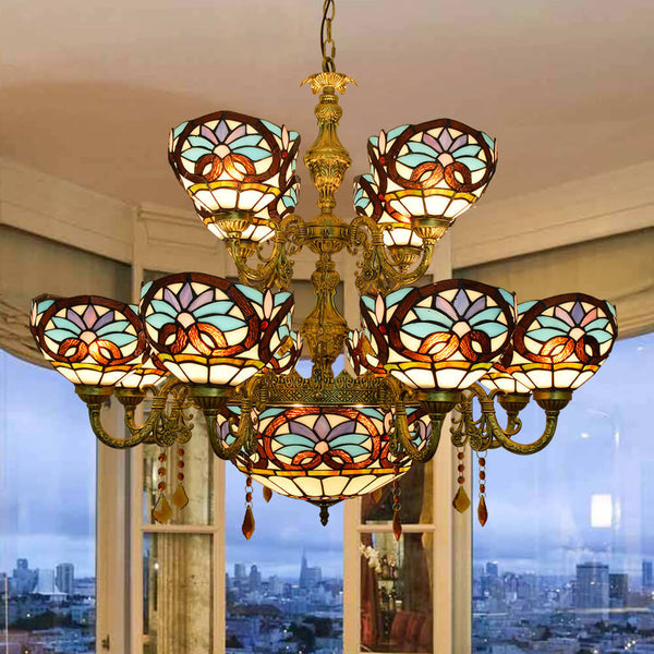 Chandelier européen style Tiffany amour baroque en verre teinté à 15 lumières