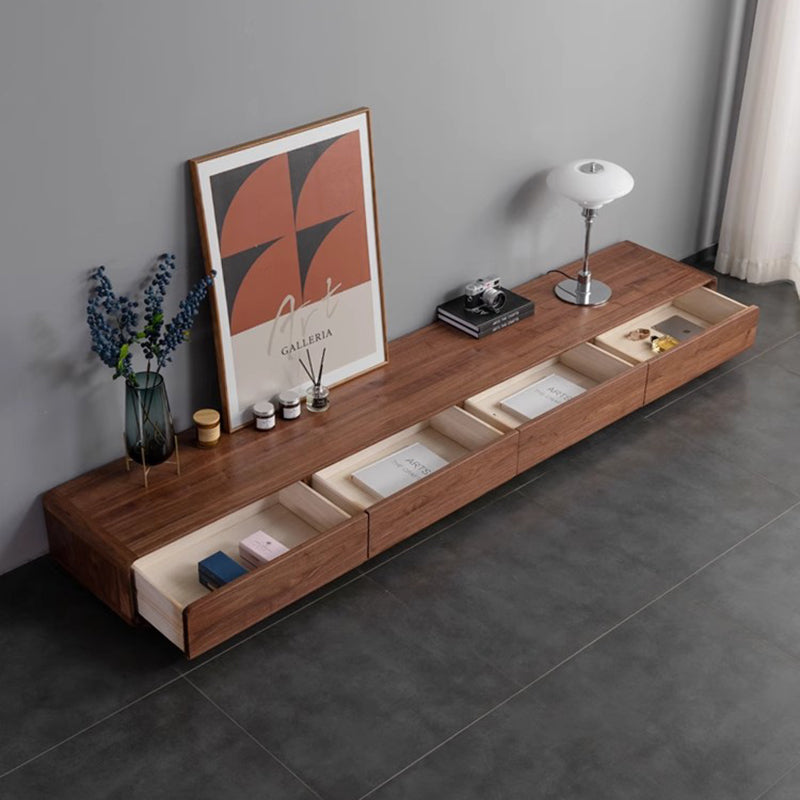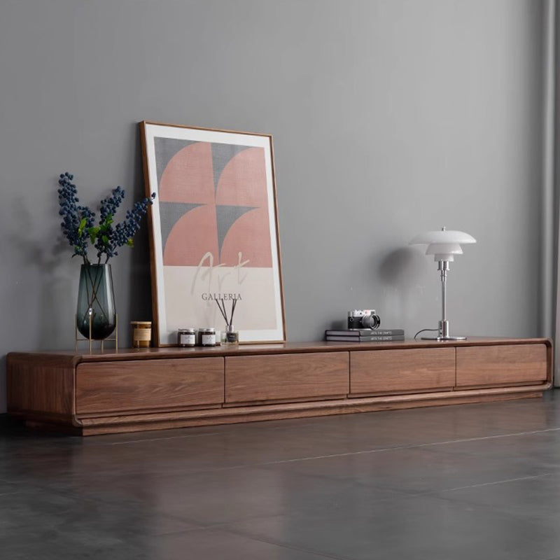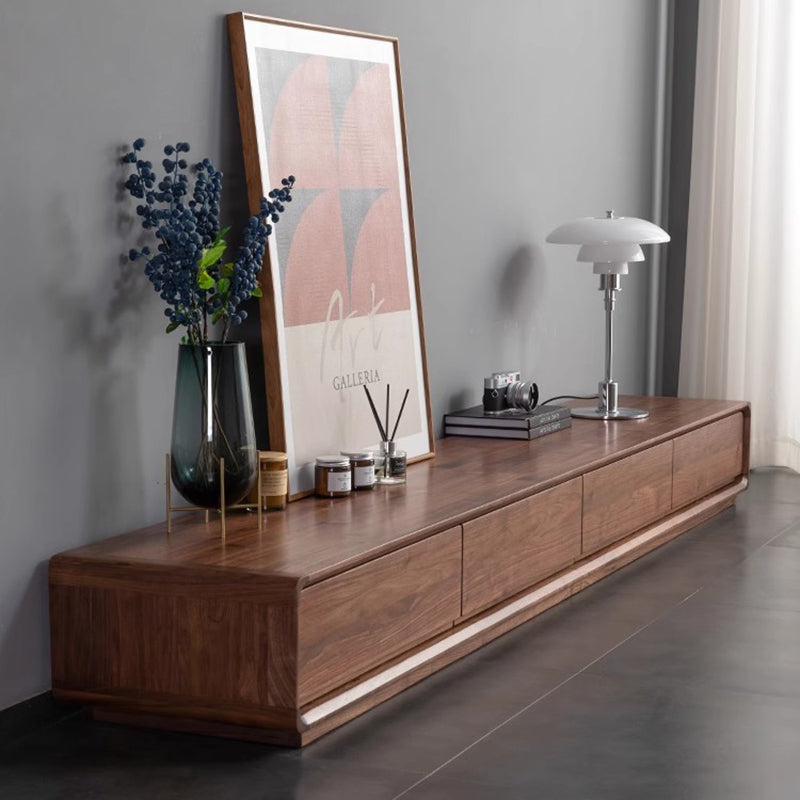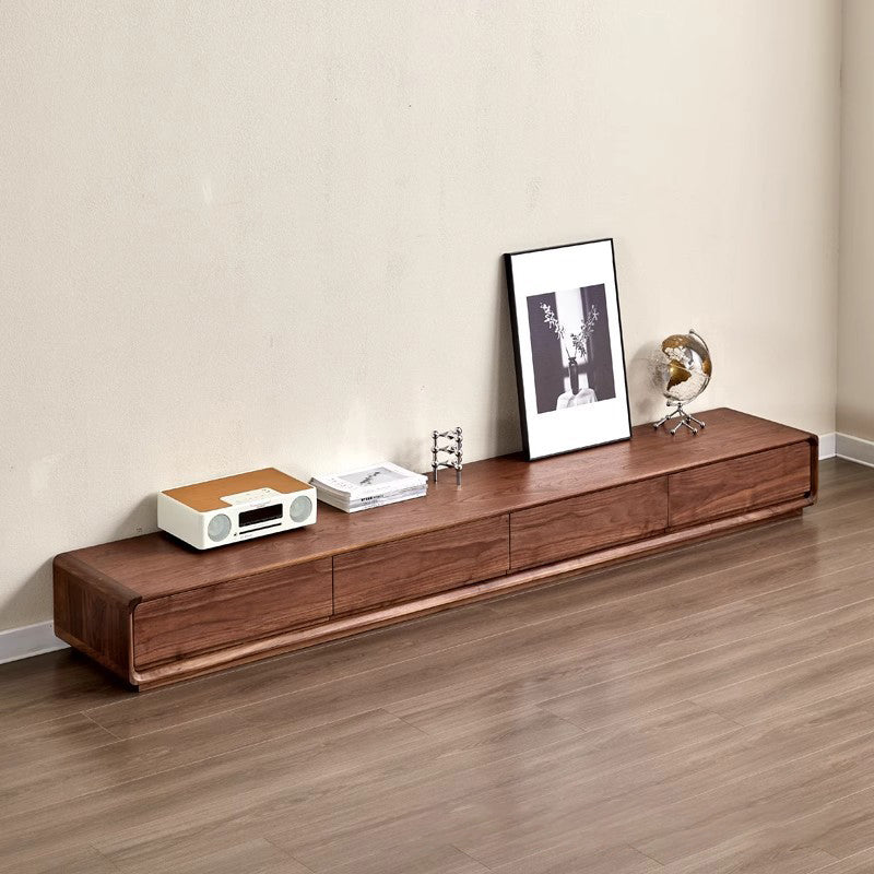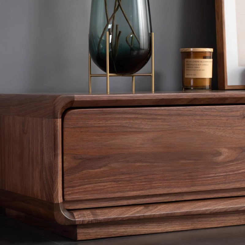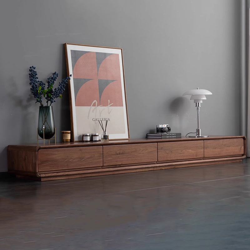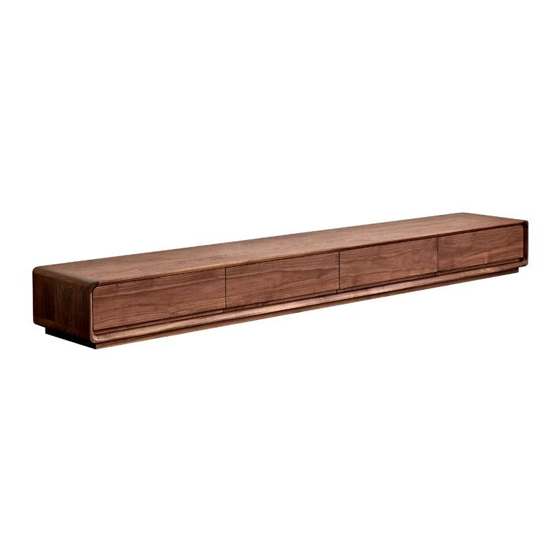This Traditional Chinese TV stand is crafted from solid black walnut wood, showcasing a rounded rectangular silhouette with smooth curved edges for a refined, modern presence. Built with mortise-and-tenon joinery and 4 spacious drawers, it delivers organized, high-efficiency storage in a warm walnut finish, making it ideal for living rooms and small-space interiors.