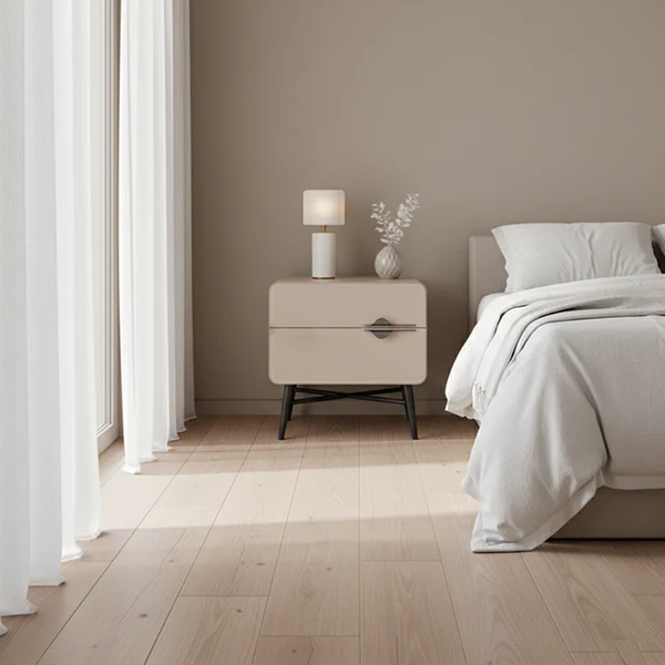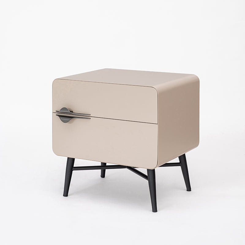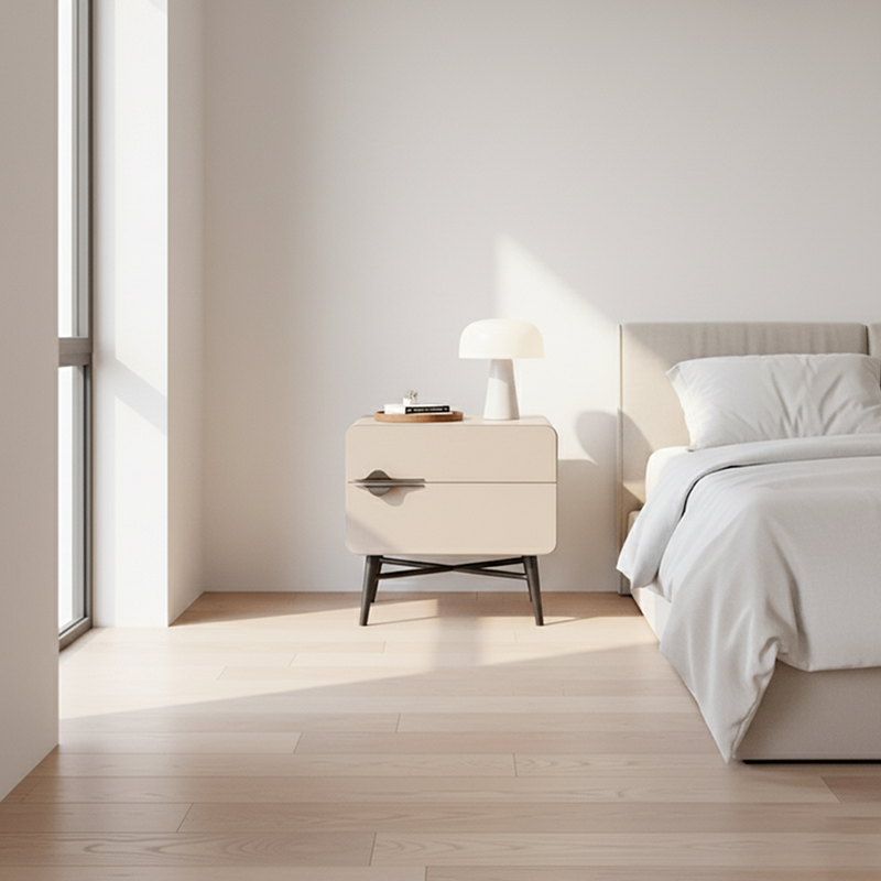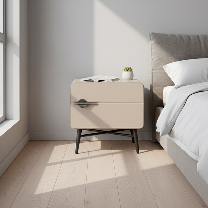 This contemporary Nordic-style nightstand is a softly textured highlight in the bedroom. Crafted from E1 eco-friendly MDF, the cabinet is formaldehyde-free and pollution-free, balancing health and durability. Its two large-capacity drawers glide smoothly without jamming, allowing separate storage for personal items and daily small goods. The cross-shaped iron cabinet legs feature sleek lines: they support the cabinet sturdily while aligning with Nordic minimalism. The surface boasts a delicate baking paint finish, with a soft, glossy hue that is wear-resistant and easy to clean, blending Nordic simplicity and comfort into daily bedroom life.