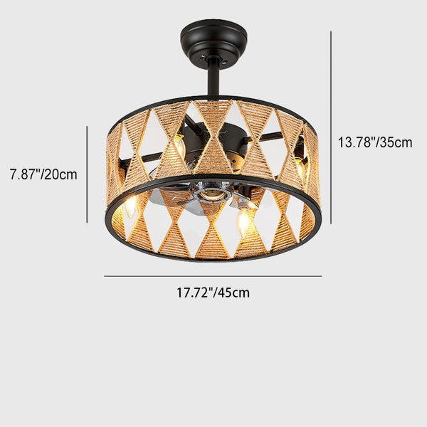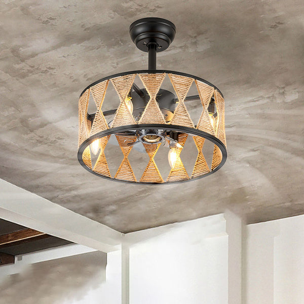 Ventilateur de plafond avec lumière, corde torsadée ronde industrielle en fer, 4 lumières