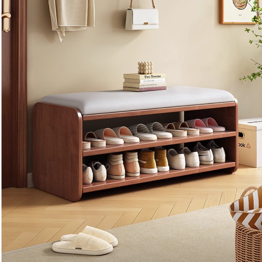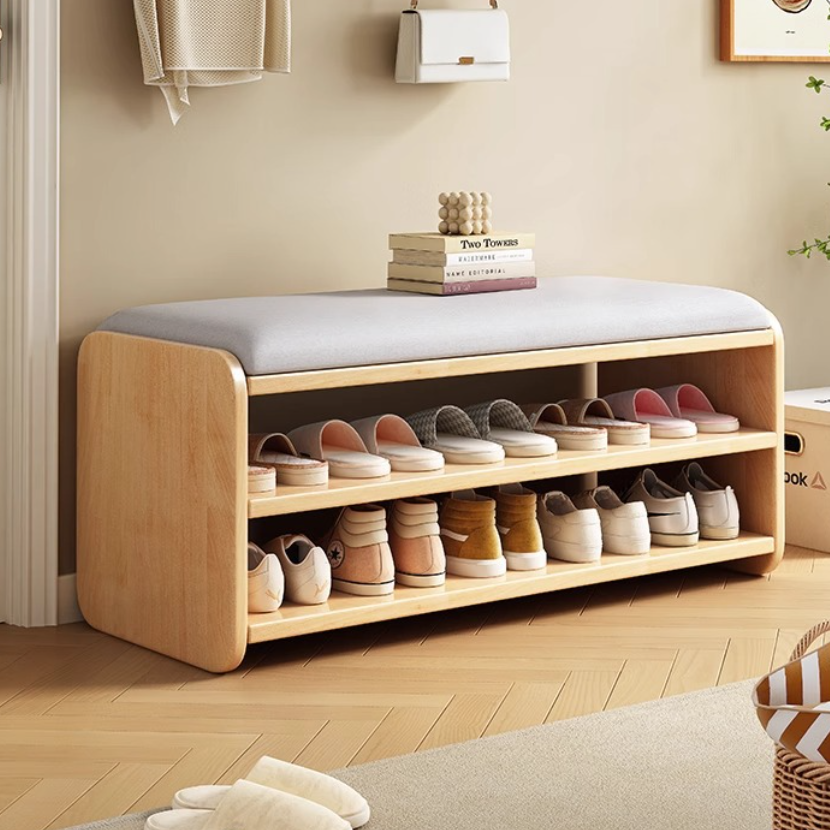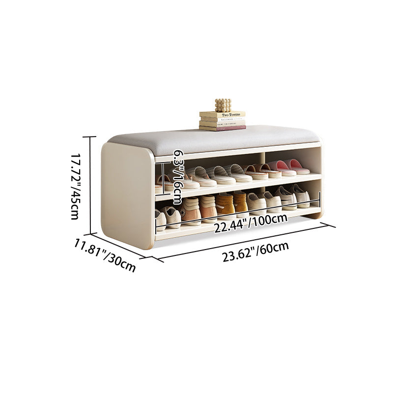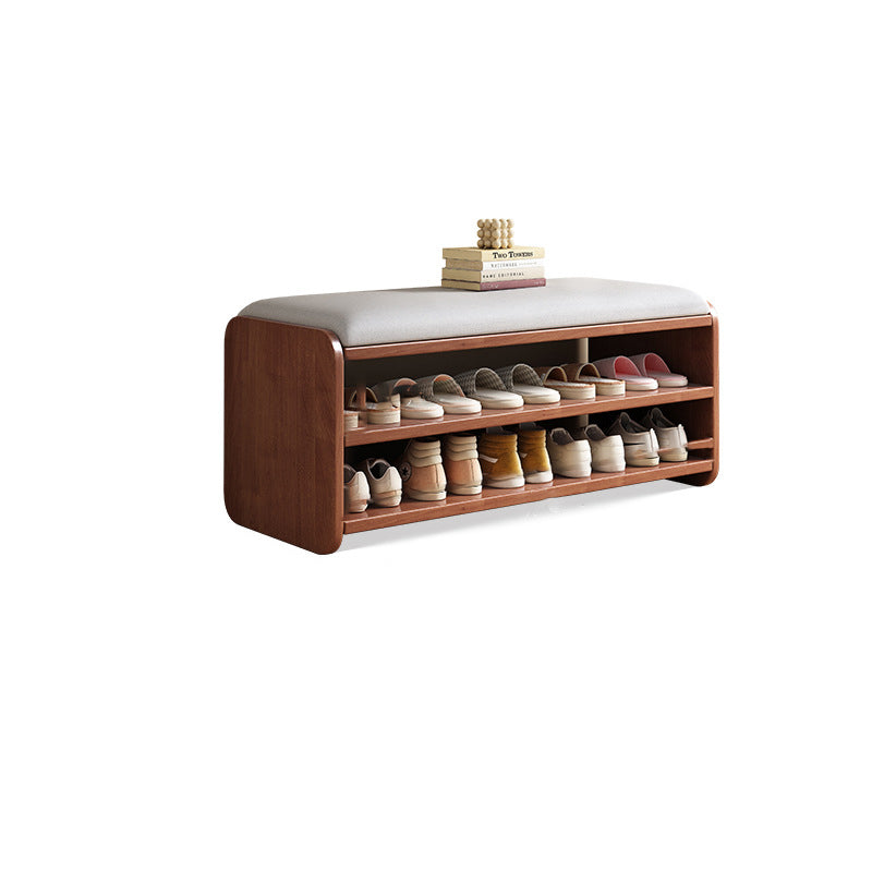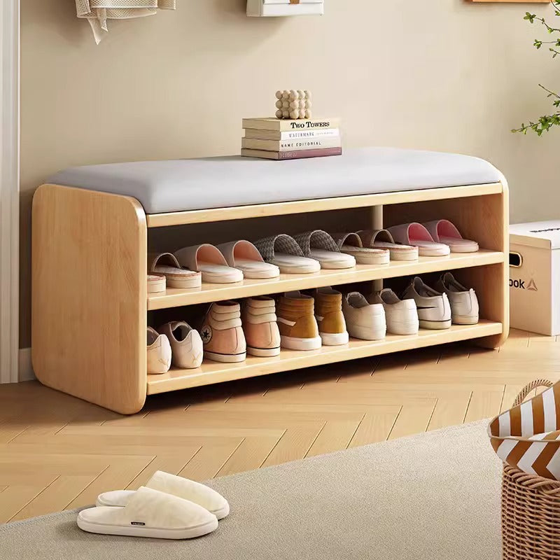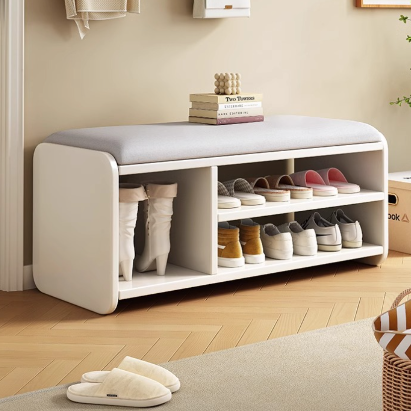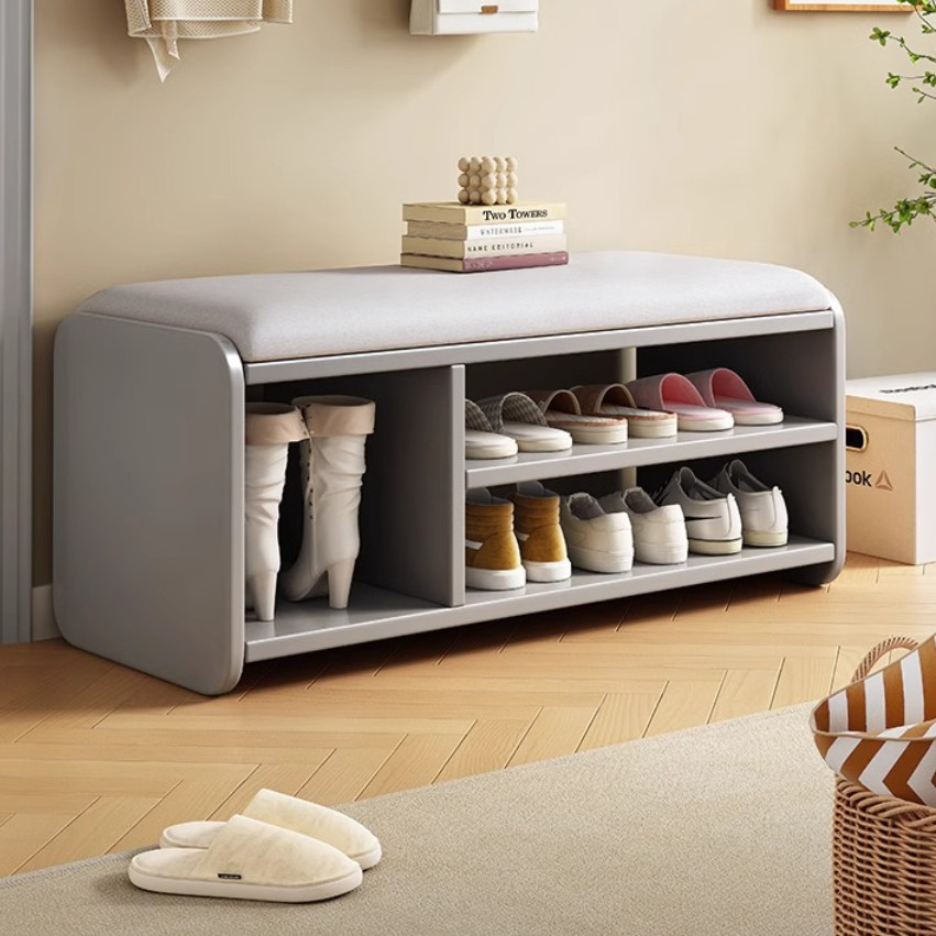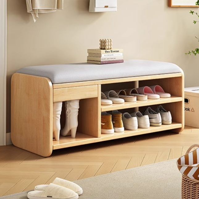 This Modern Minimalist shoe bench features a rounded rectangular design with 2 tiers, drawer storage, and a boot compartment in walnut, natural wood, white, or gray. Its soft fabric cushion and rounded edges provide comfortable seating and safe, functional storage for your entryway.