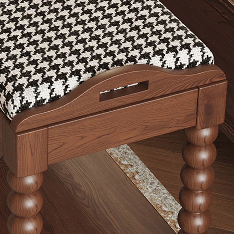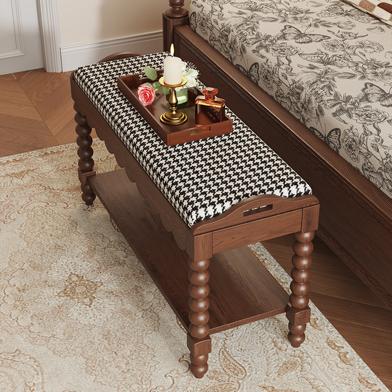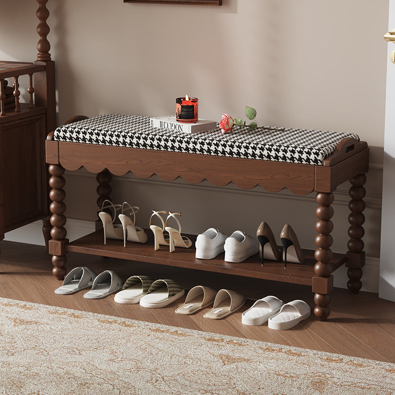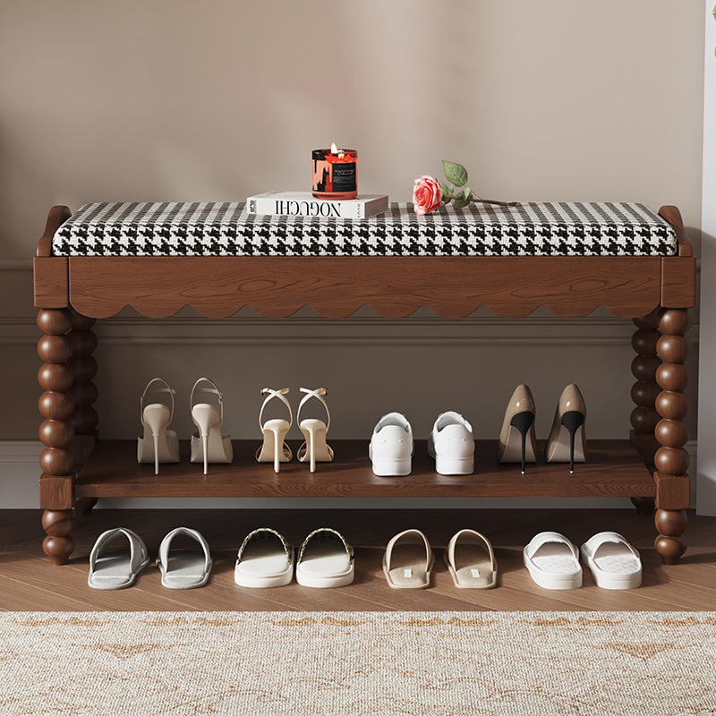 This traditional French solid wood shoe bench is designed for entryways, featuring elegant turned legs, a warm walnut finish, and a soft upholstered cushion for comfortable seating.