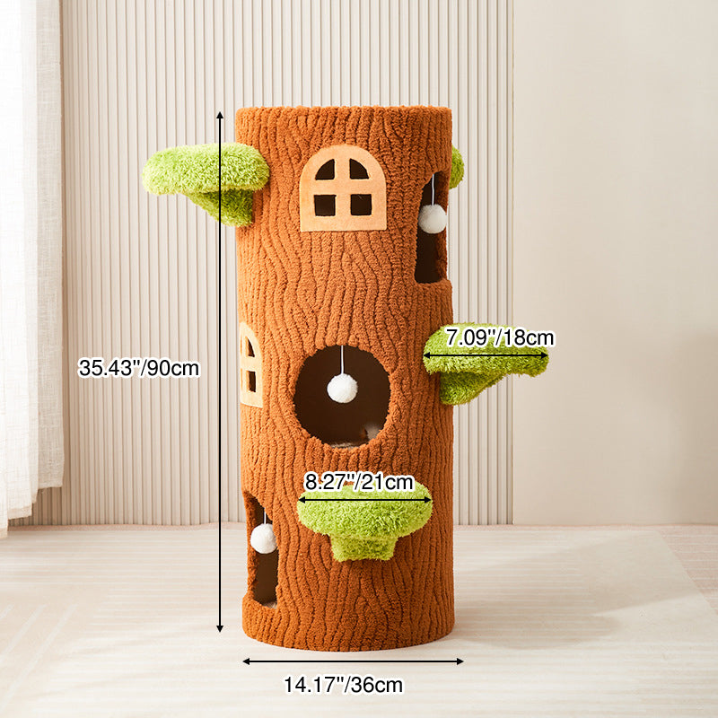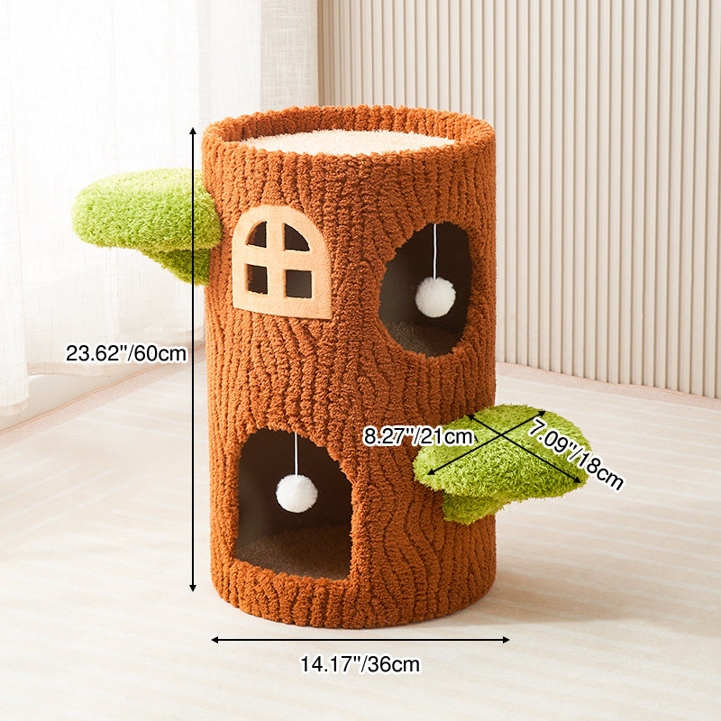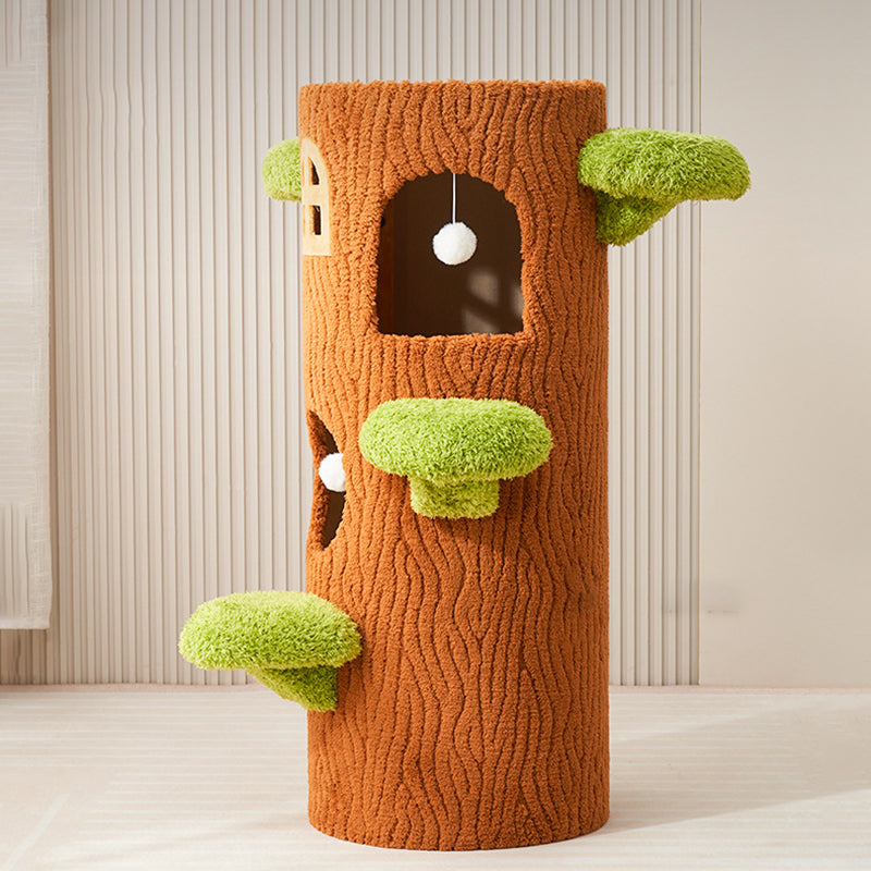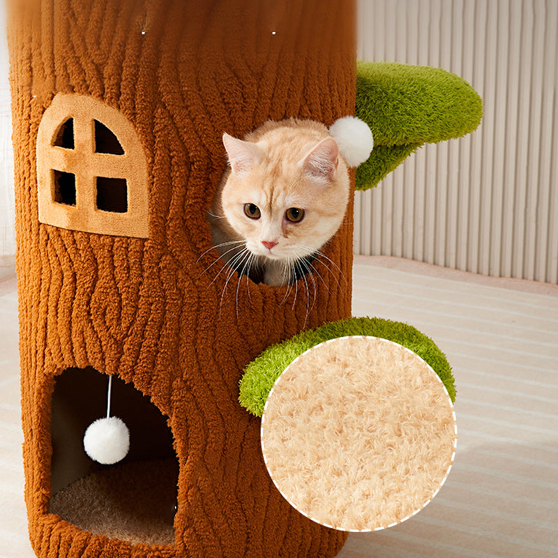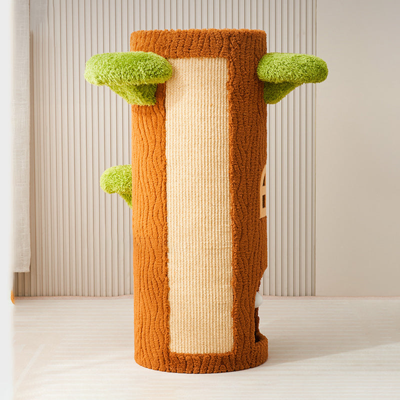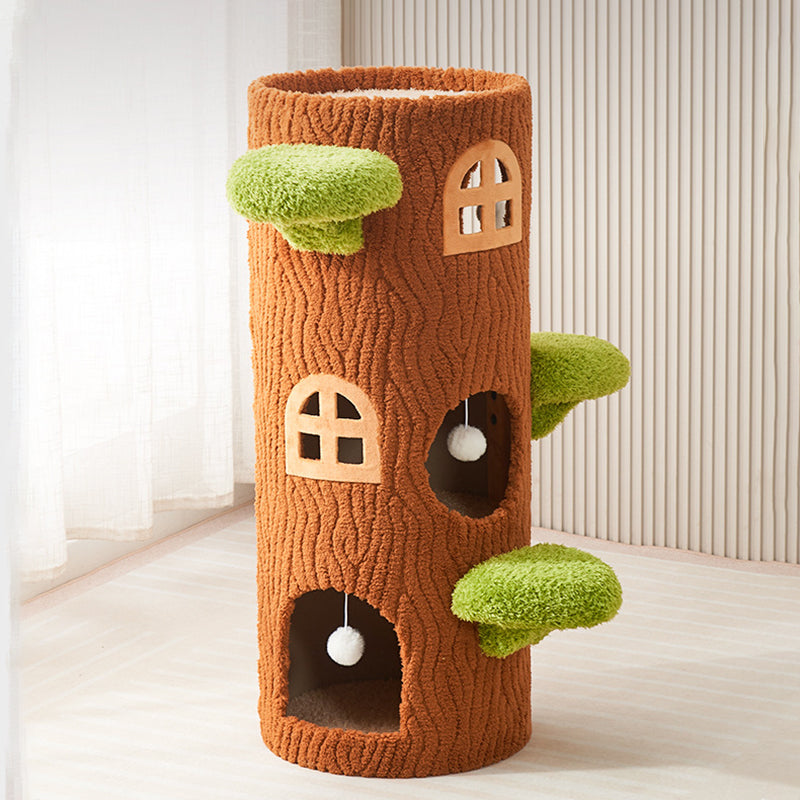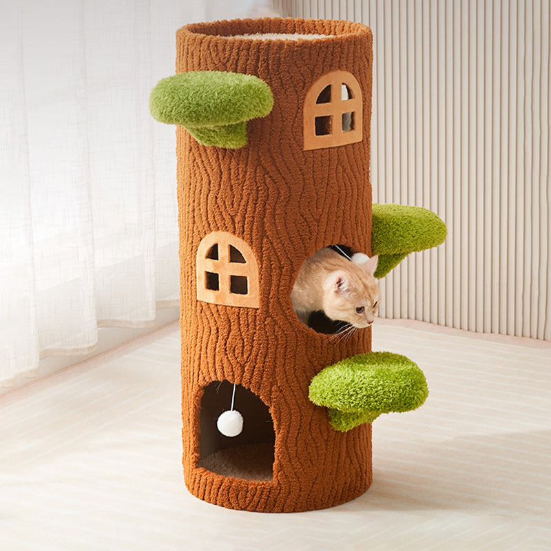 This traditional rustic tree-shaped cat bed (integrated with scratching post and cat tree) is made of pine, density board, crystal velvet and sisal in brown, featuring 1/2/3 holes. Sturdy and scratch-resistant, it's a multi-layer all-in-one piece perfect for cats to rest and scratch, suitable for year-round use in the living room or bedroom.