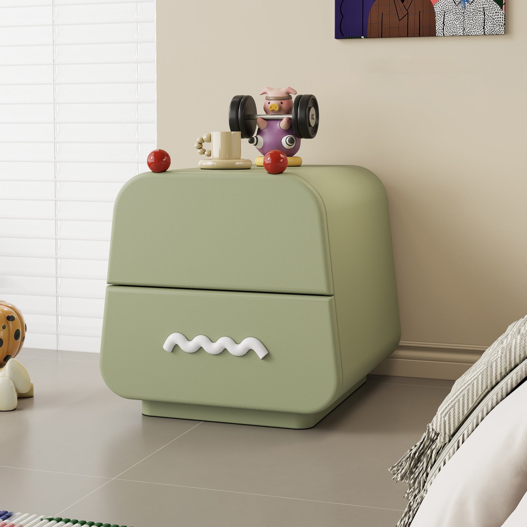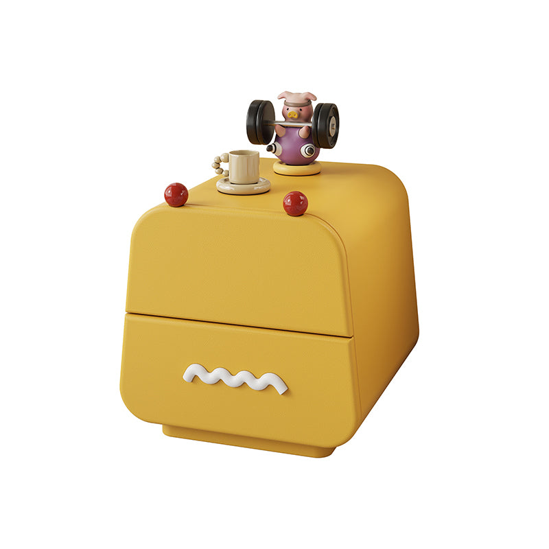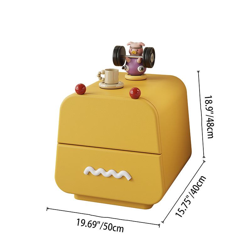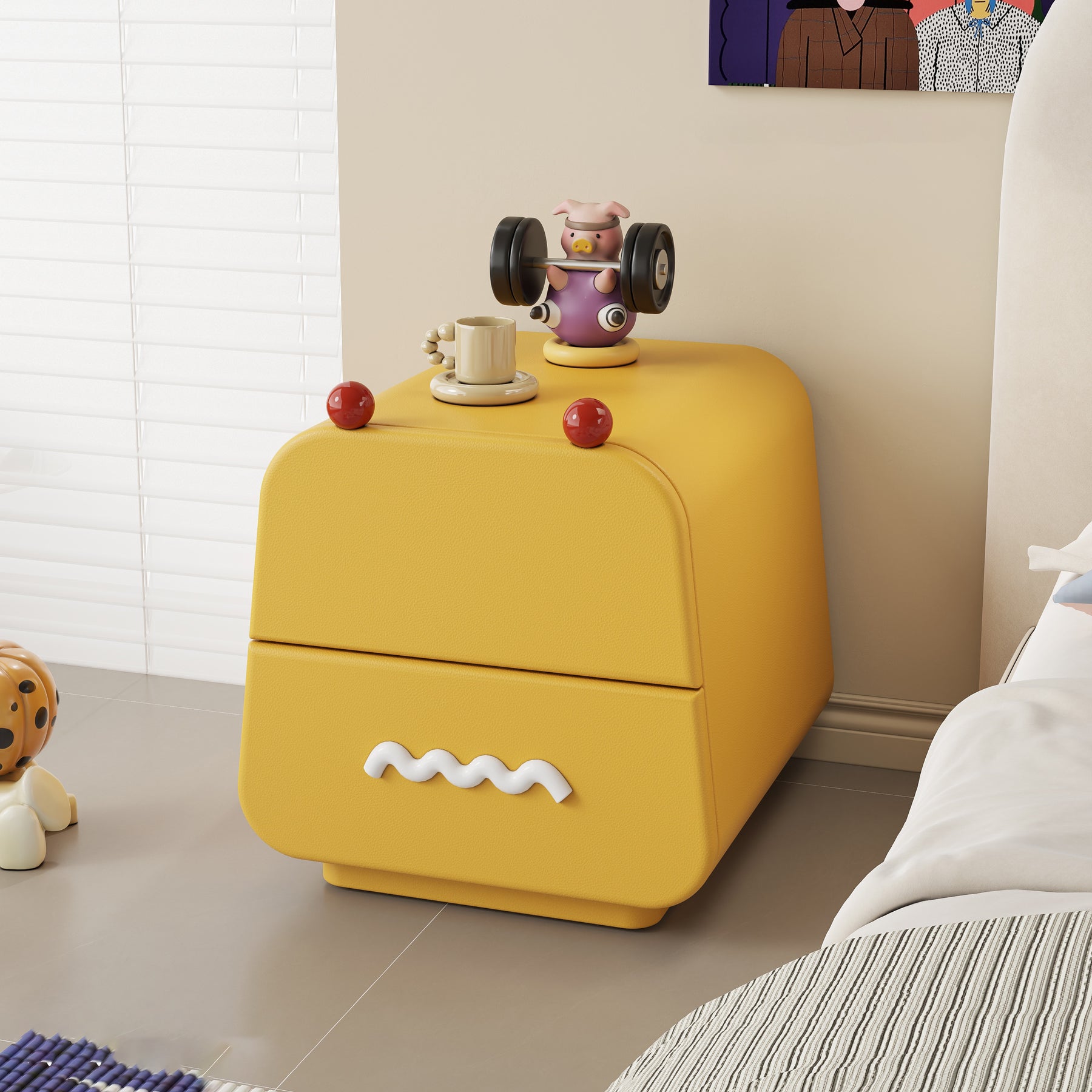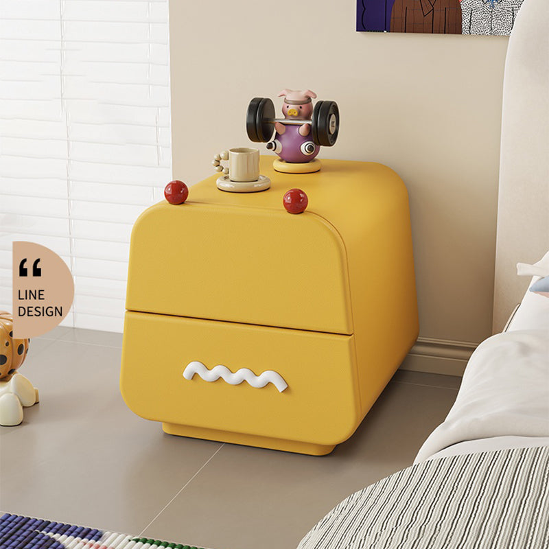 This contemporary Nordic trapezoidal nightstand, designed for kids, features high-quality pine wood, stable solid wood veneer back panel and scratch-resistant cat-scratch fabric finish, ensuring sturdiness, durability and long service life. Equipped with 2 drawers for organized storage, it comes in yellow, green, off-white, light blue and black, perfectly fitting living rooms and bedrooms while adding a cute, cartoonish touch to kids' spaces.