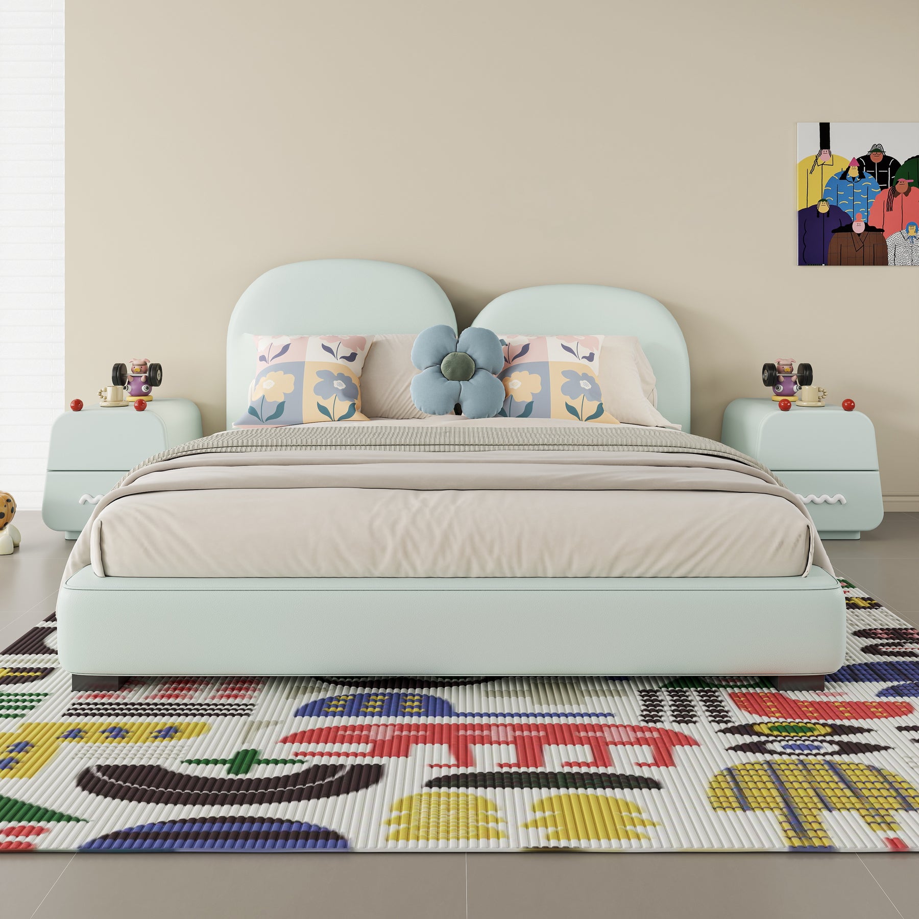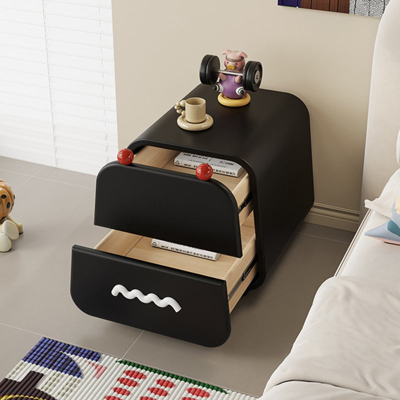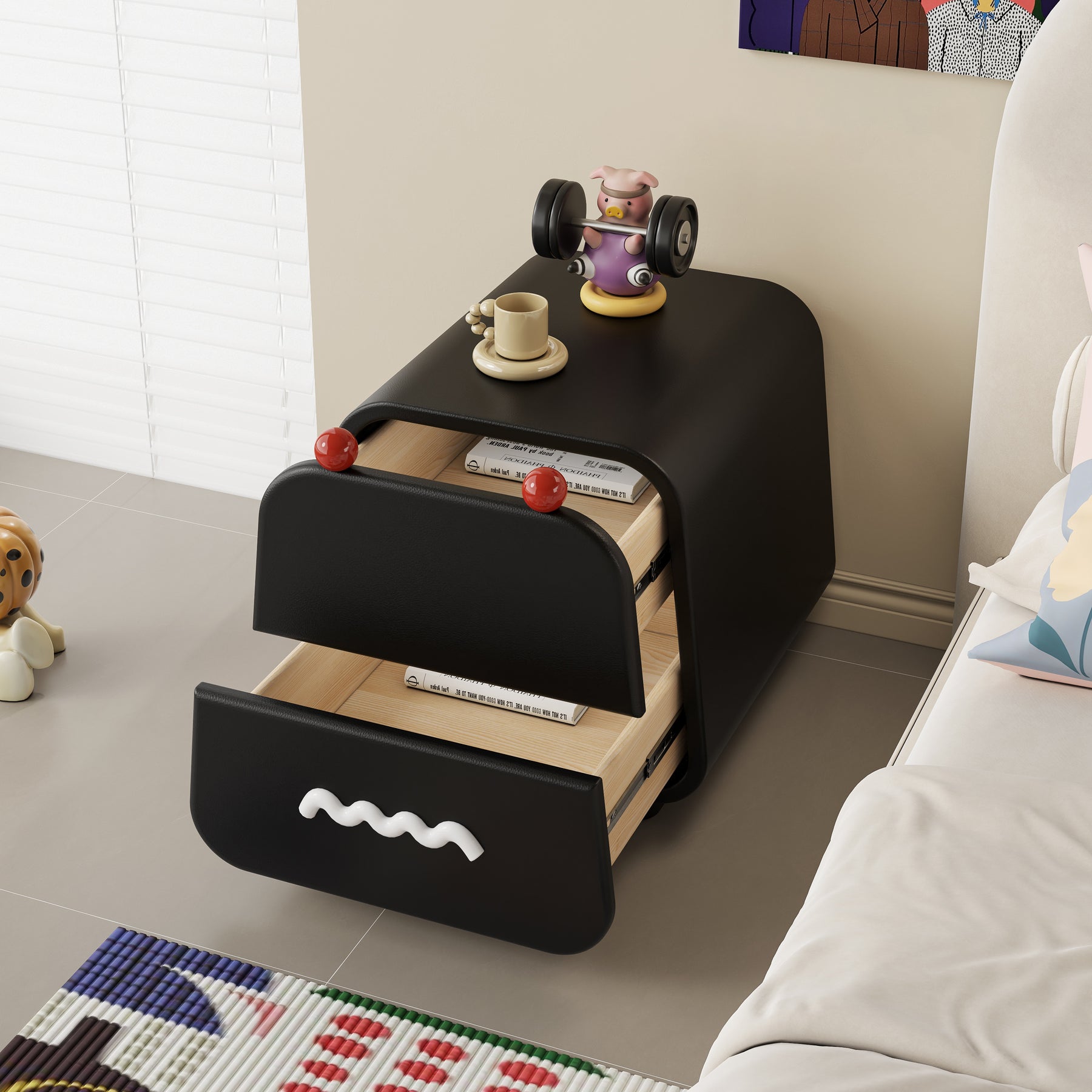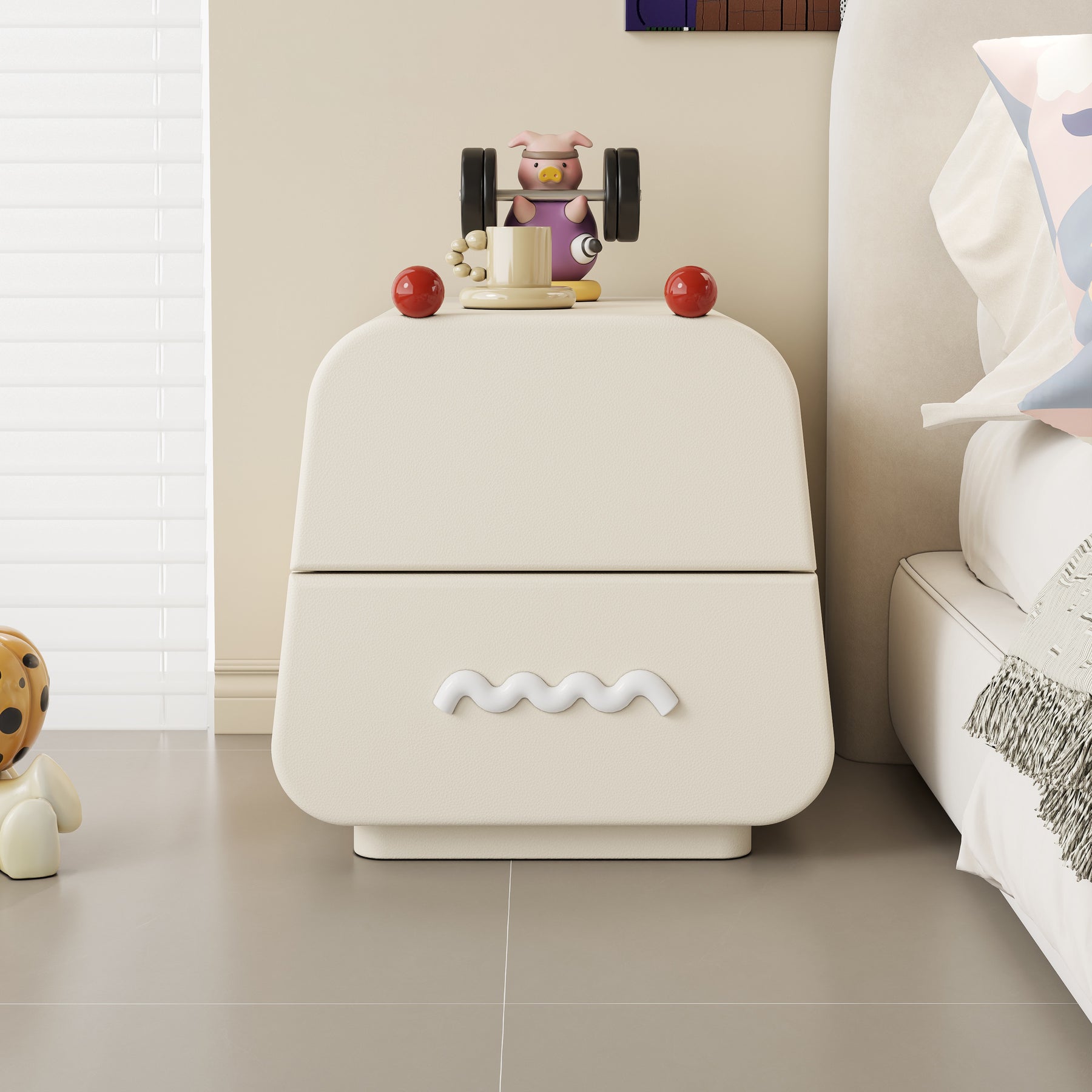 This contemporary Nordic trapezoidal nightstand, designed for kids, features high-quality pine wood, stable solid wood veneer back panel and scratch-resistant cat-scratch fabric finish, ensuring sturdiness, durability and long service life. Equipped with 2 drawers for organized storage, it comes in yellow, green, off-white, light blue and black, perfectly fitting living rooms and bedrooms while adding a cute, cartoonish touch to kids' spaces.