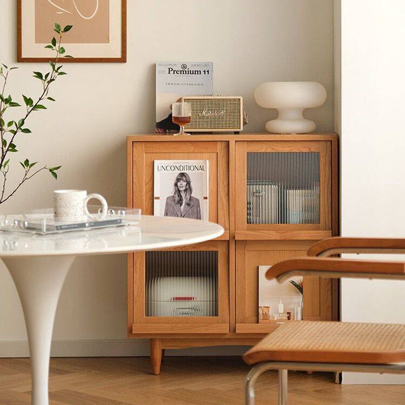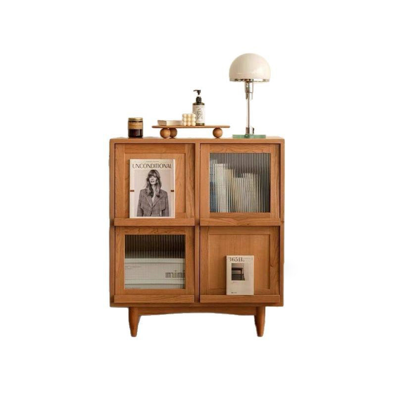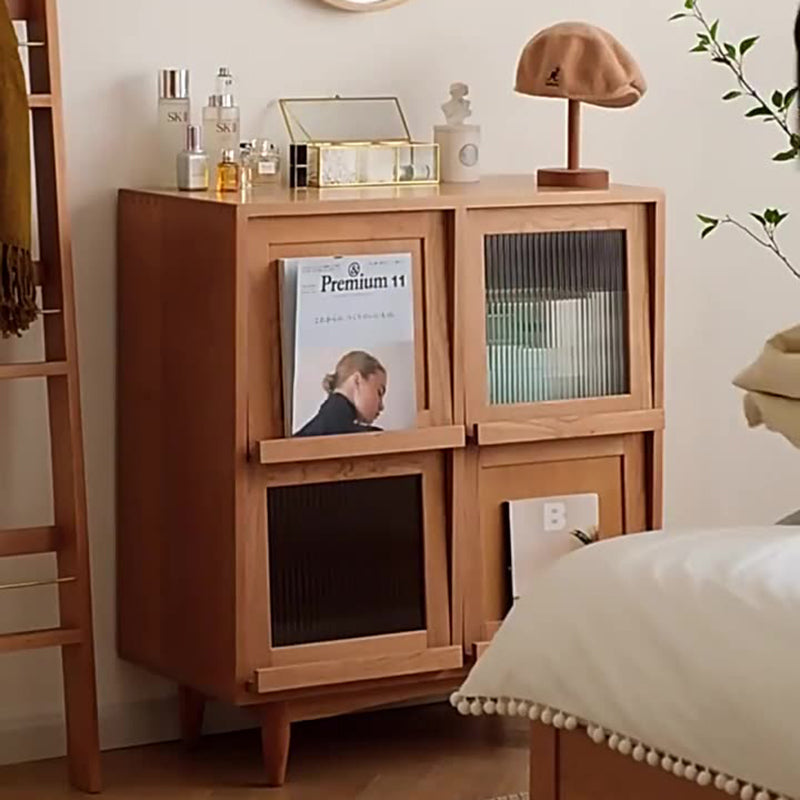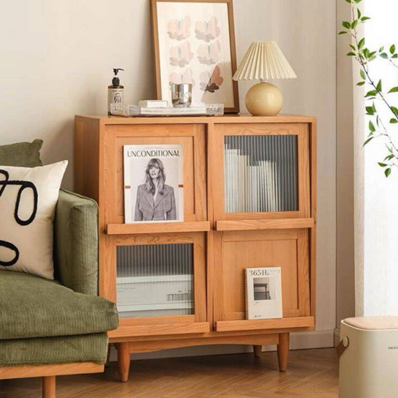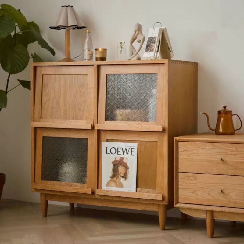 This Contemporary Nordic storage cabinet blends solid wood and glass in a sleek rectangular shape, featuring 4 cabinets with flip-top doors for neat, independent storage—ideal for living rooms or bedrooms. Finished in a warm natural wood tone, it keeps your items organized while adding a modern Nordic vibe to your space.