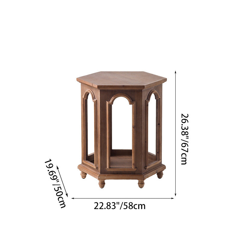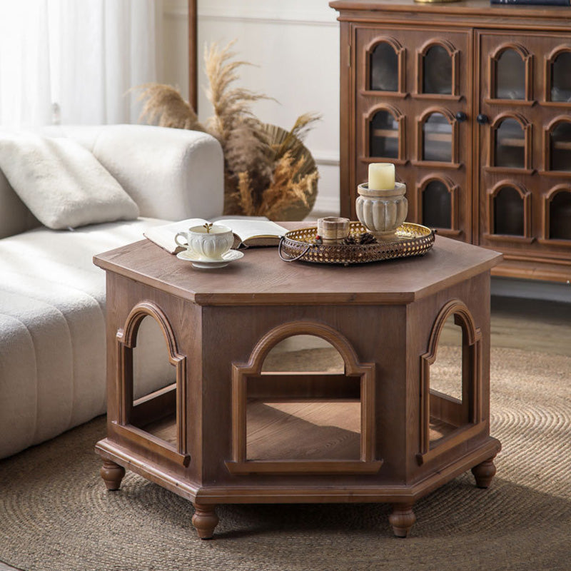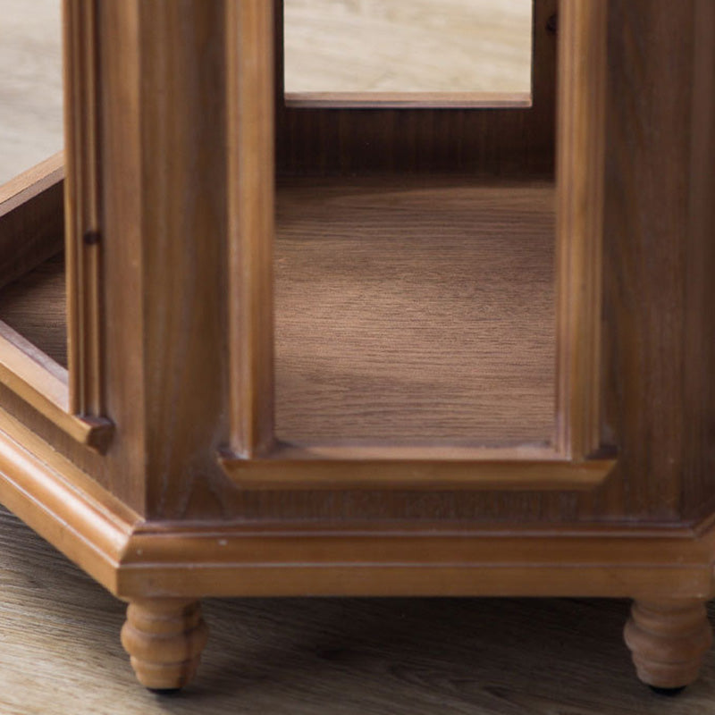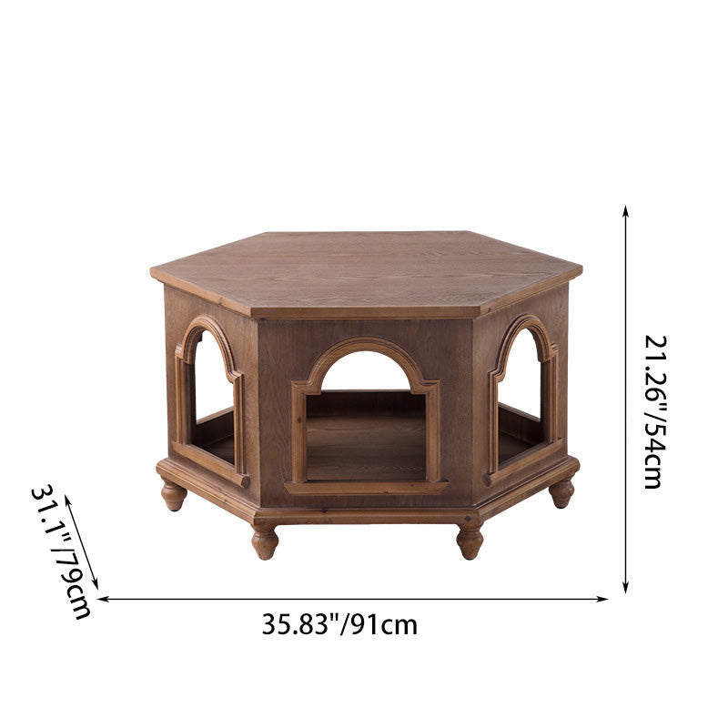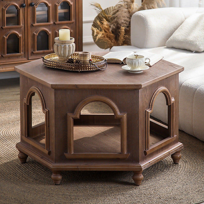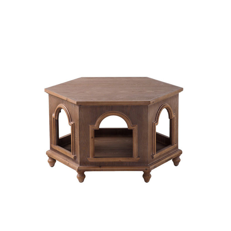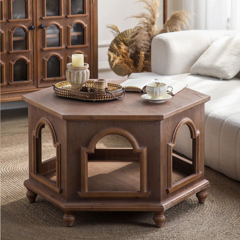 This traditional Chinese-style hexagonal coffee table features a walnut-tone finish and a two-tier design that provides convenient storage and display space. Crafted from pine wood and MDF, it blends durability with a warm, refined look, making it ideal for living rooms and bedrooms. A stylish multi-tier accent table perfect for hotels, lounges, or home décor.
