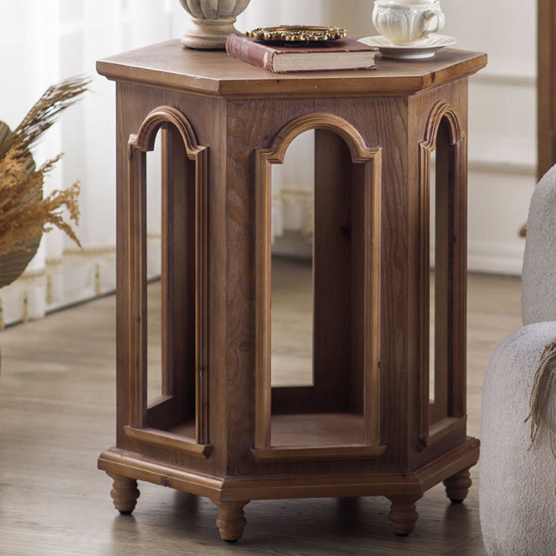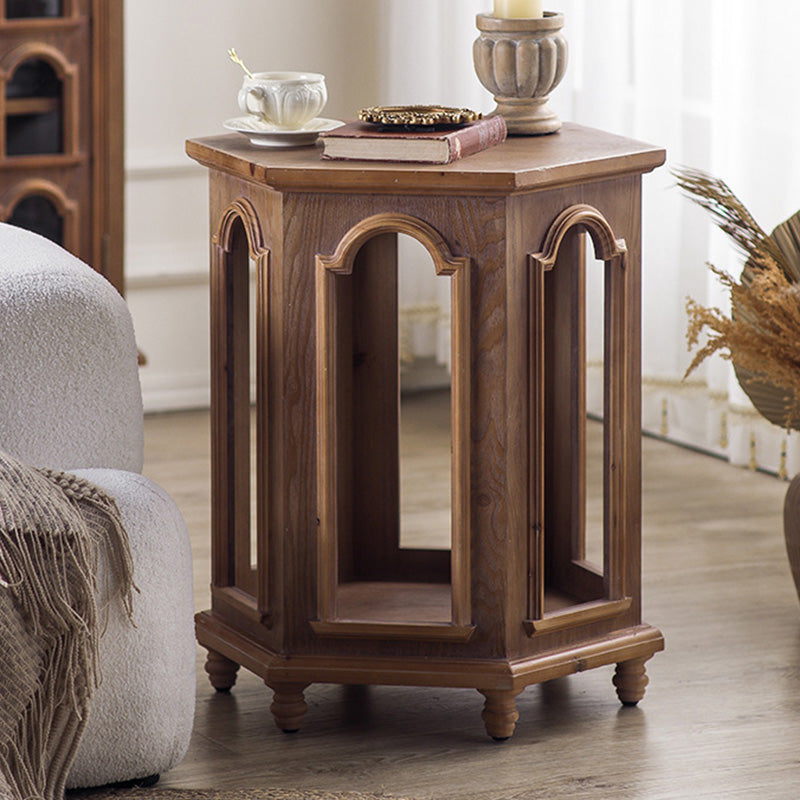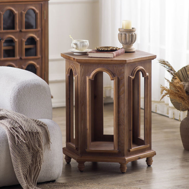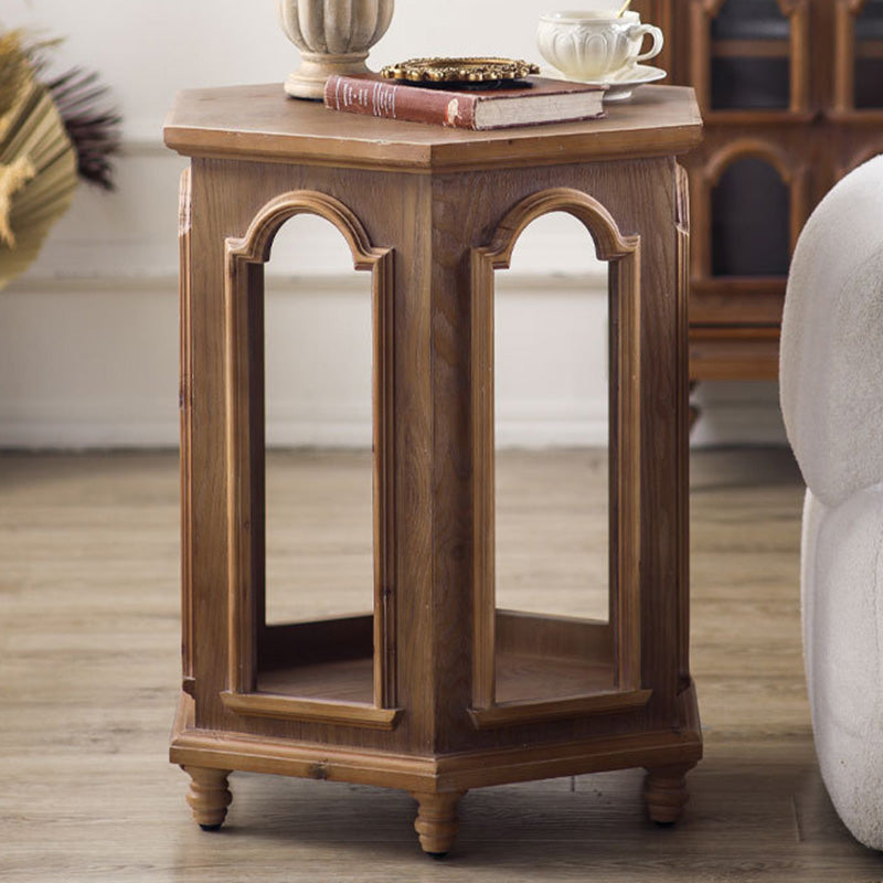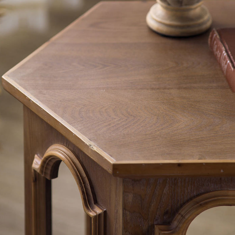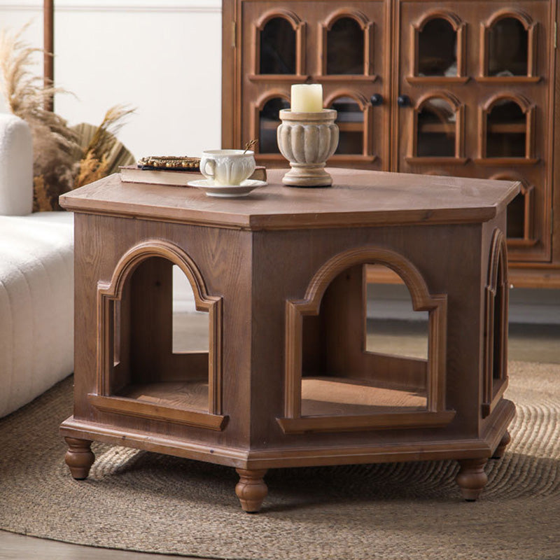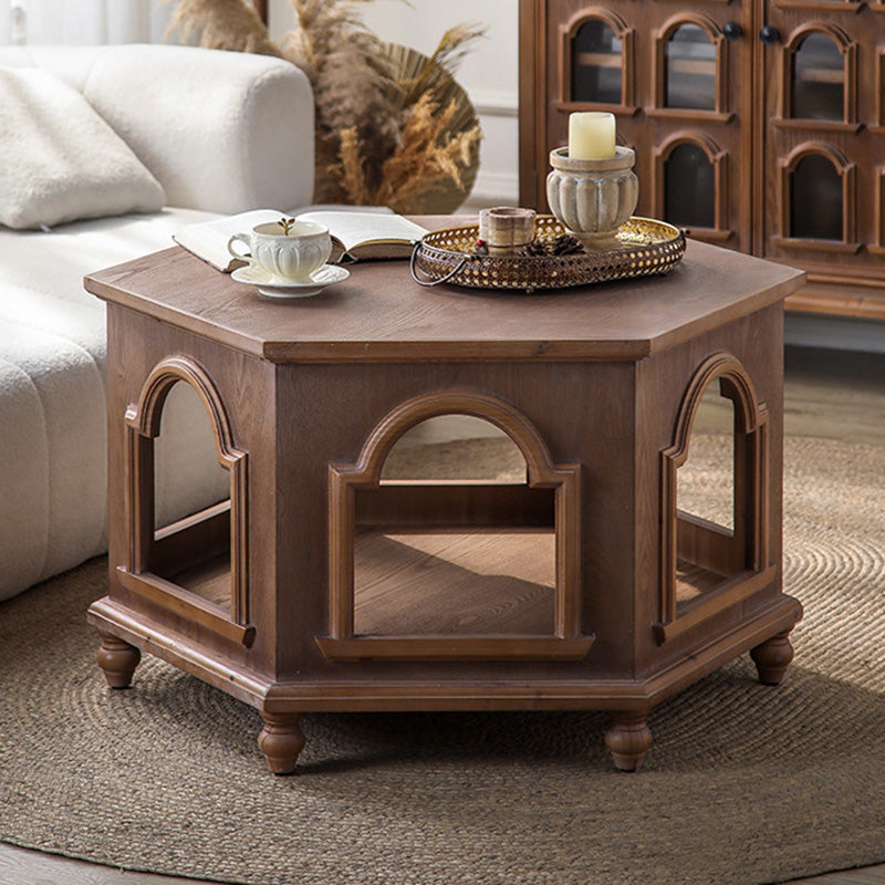 This traditional Chinese-style hexagonal coffee table features a walnut-tone finish and a two-tier design that provides convenient storage and display space. Crafted from pine wood and MDF, it blends durability with a warm, refined look, making it ideal for living rooms and bedrooms. A stylish multi-tier accent table perfect for hotels, lounges, or home décor.