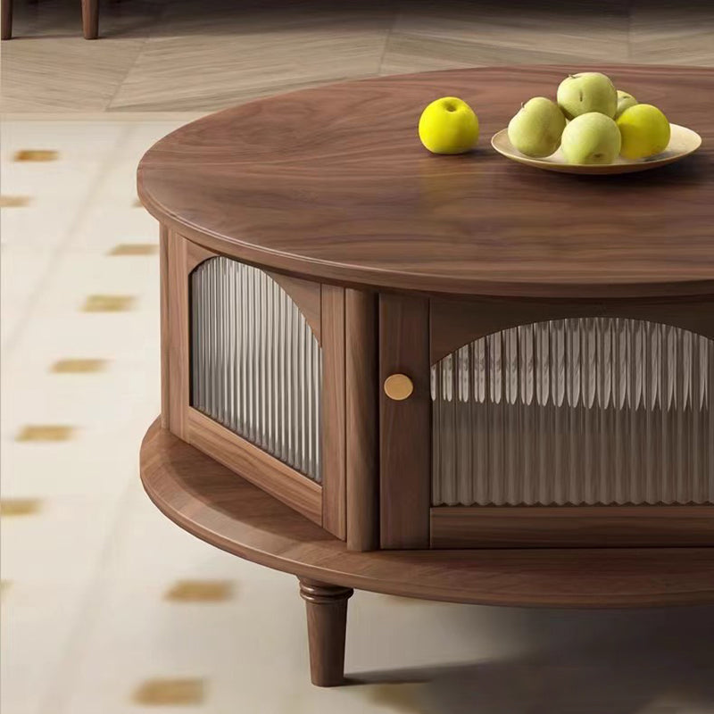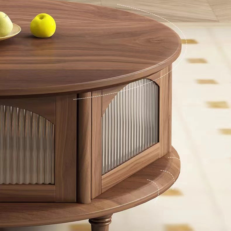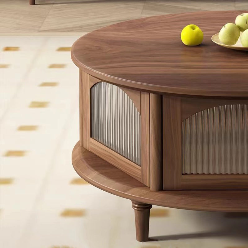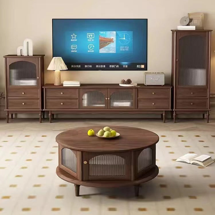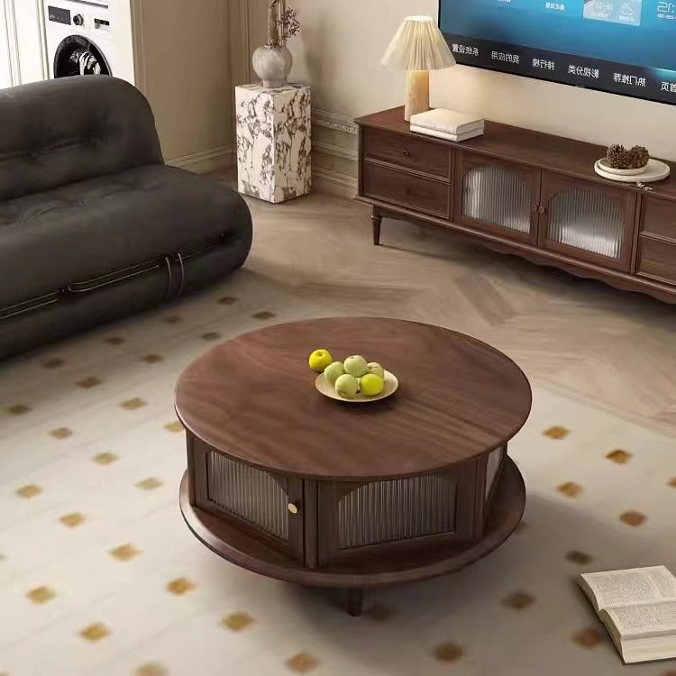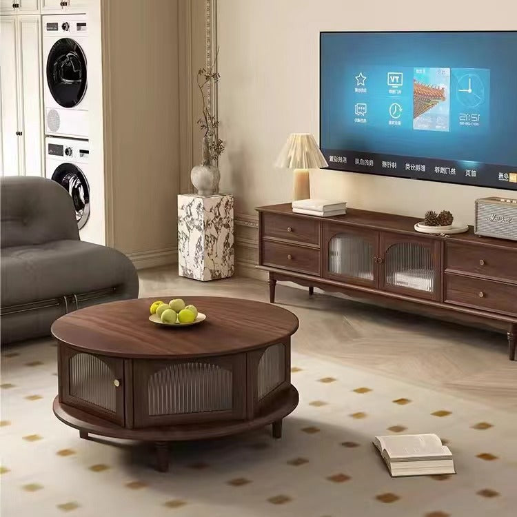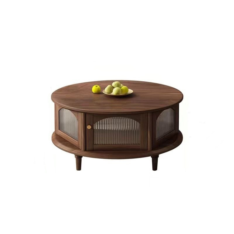 This traditional Japanese-style coffee table features a round black walnut top paired with a sturdy glass structure and Roman-column legs, offering a refined and stable design for the living room. Finished in rich walnut with smooth rounded edges for safety, it provides a minimalist 1-tier surface ideal for tea, décor, and everyday use.