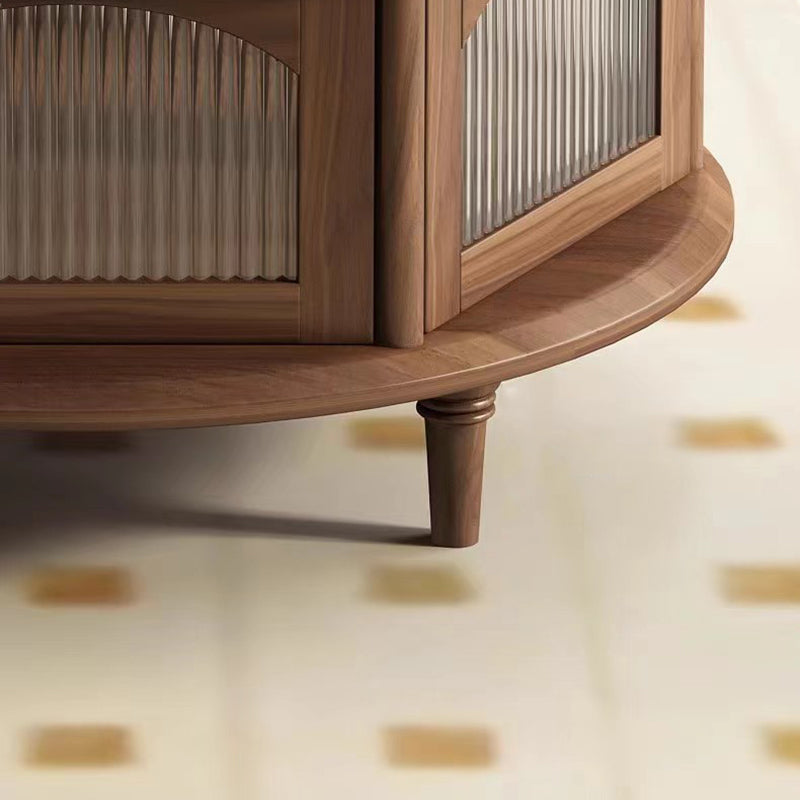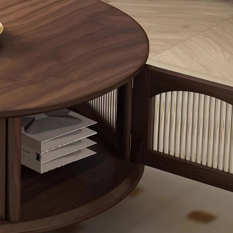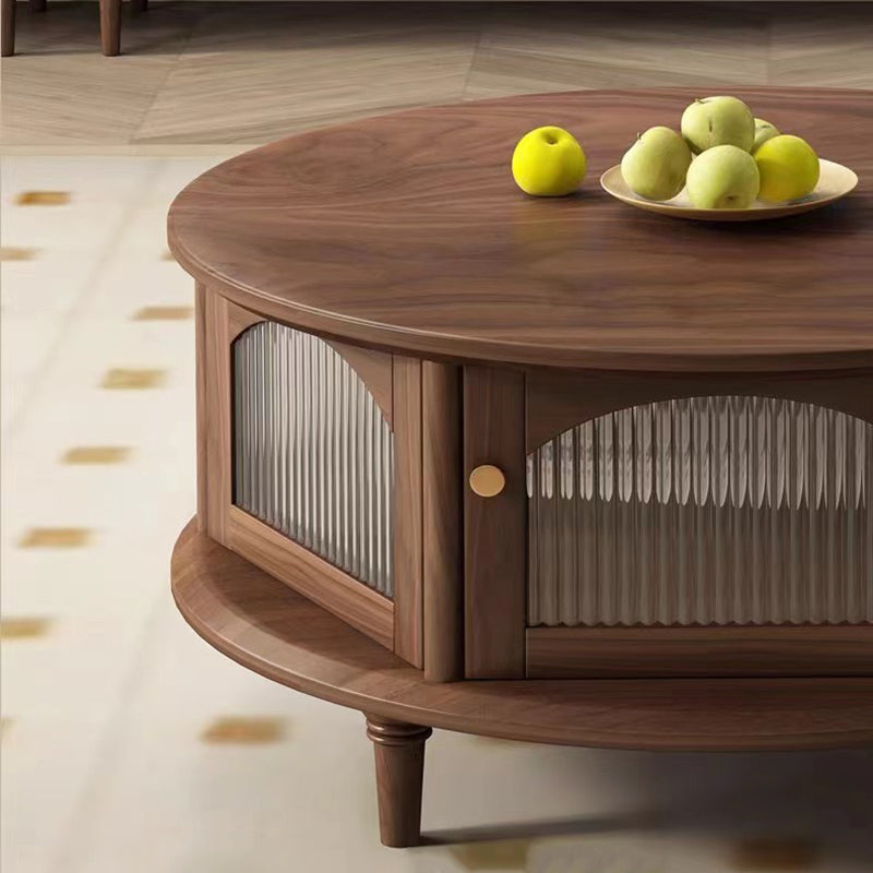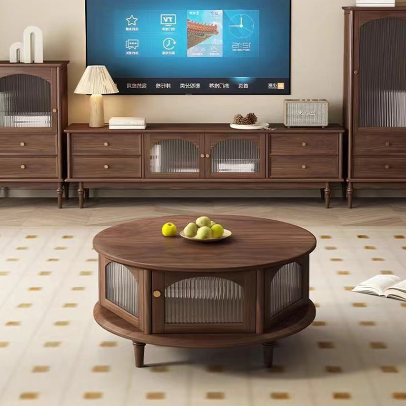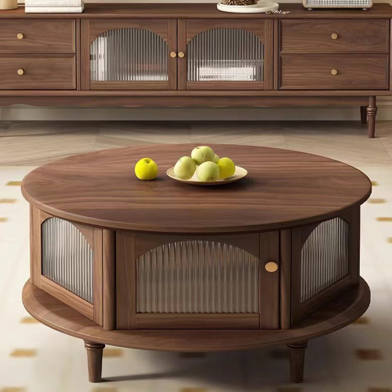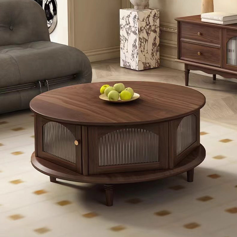 This traditional Japanese-style coffee table features a round black walnut top paired with a sturdy glass structure and Roman-column legs, offering a refined and stable design for the living room. Finished in rich walnut with smooth rounded edges for safety, it provides a minimalist 1-tier surface ideal for tea, décor, and everyday use.