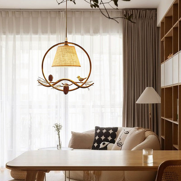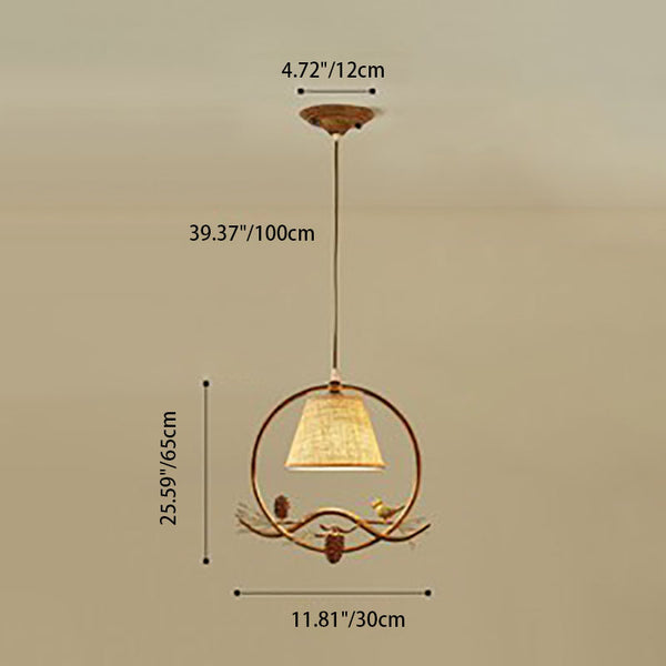 Abat-jour en tissu rustique traditionnel Anneau en fer Oiseau en résine Suspension 1 lumière pour chambre